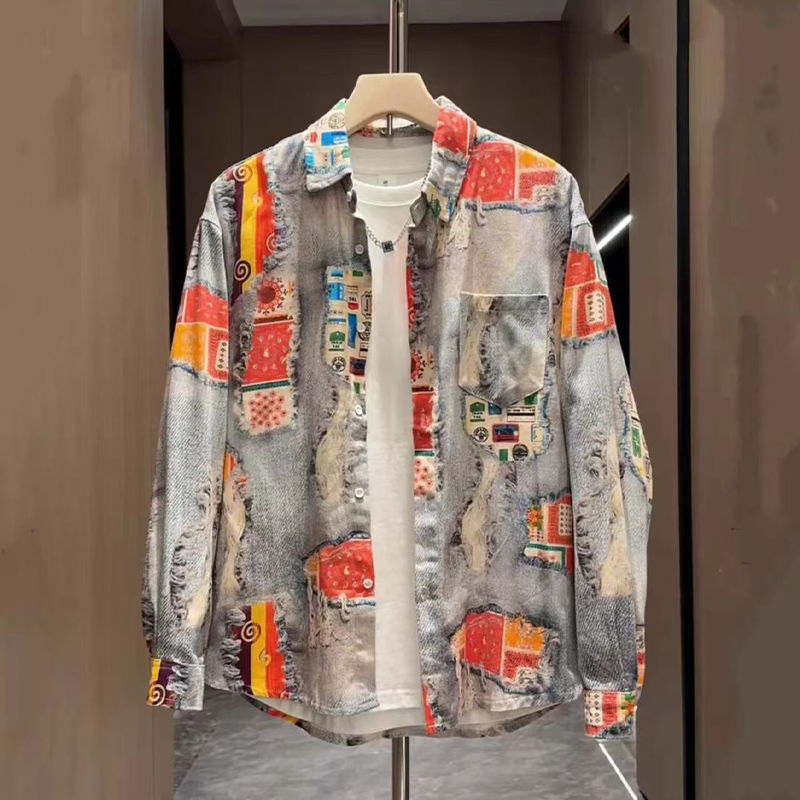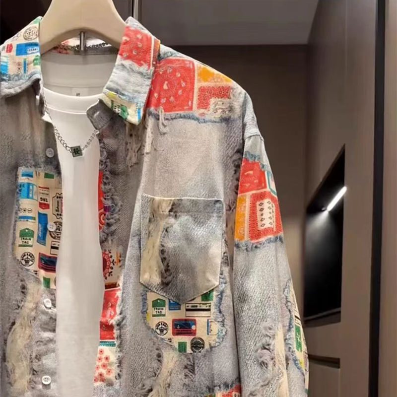 가을 빈티지 홍콩 스타일 그린 프린트 남성 자켓 틈새 디자인 미국 스타일 독특한 긴 소매 셔츠 남녀 올매치