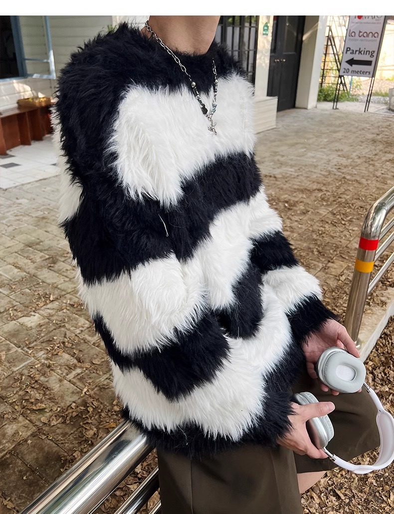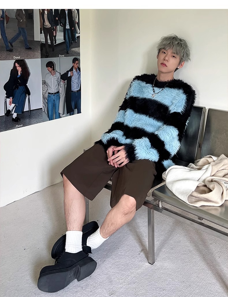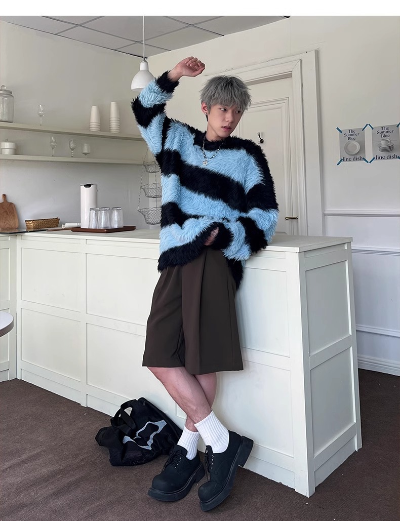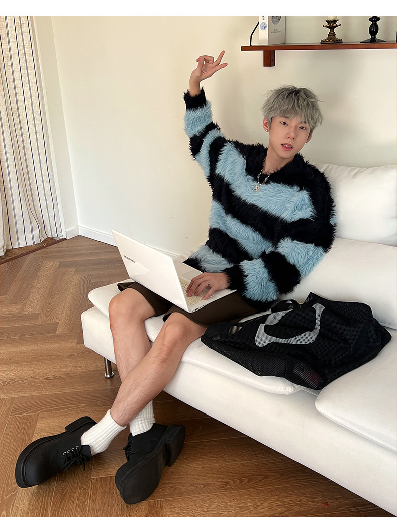 아메리칸 스타일 게으른 줄무늬 대조 컬러 세이블 소프트 왁스 니트 스웨터 남자 오버 사이즈 트렌디 라운드 넥 올 매치 탑스토어 가기