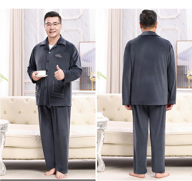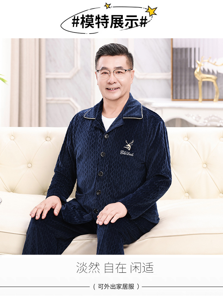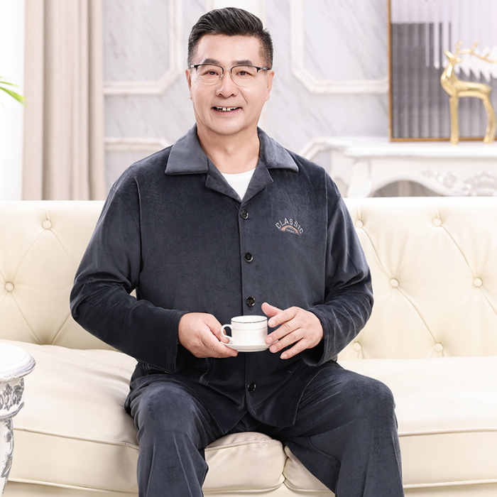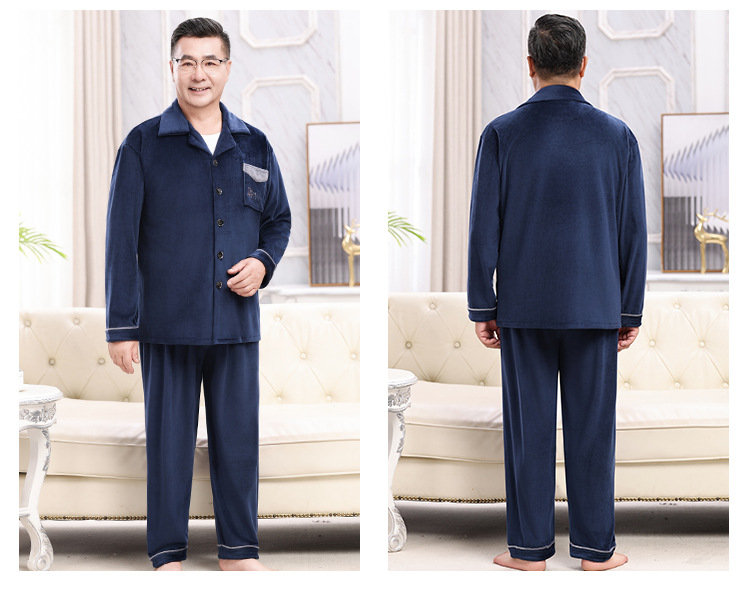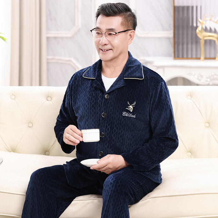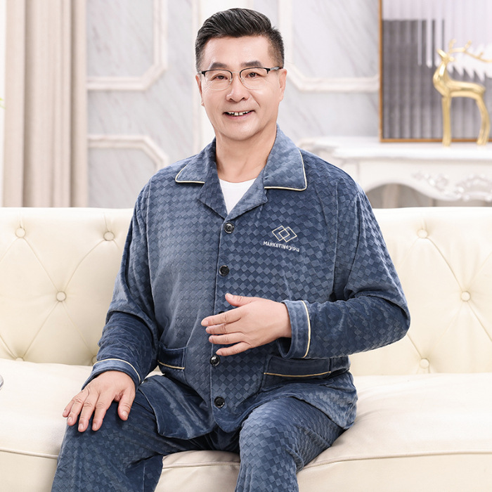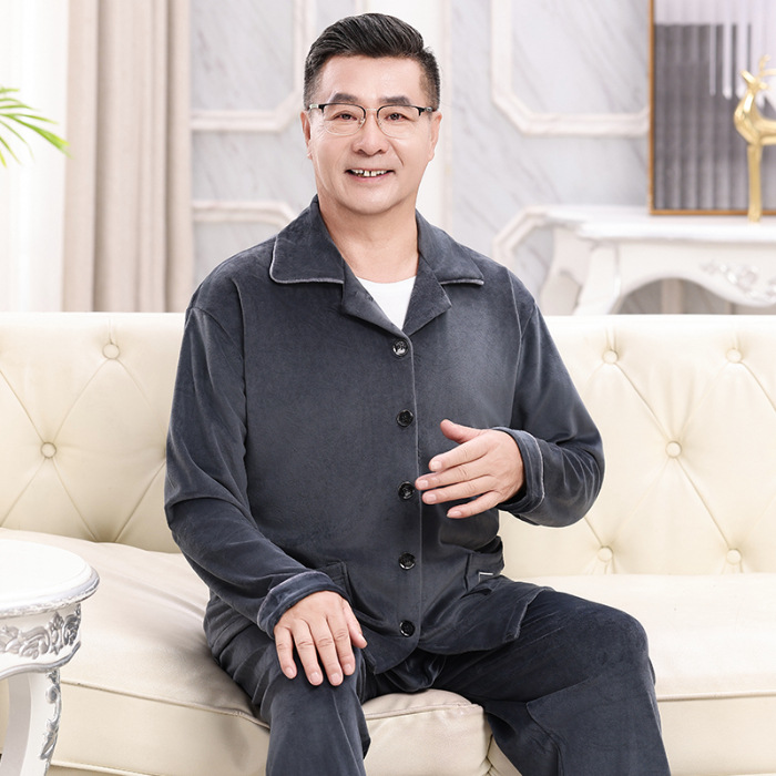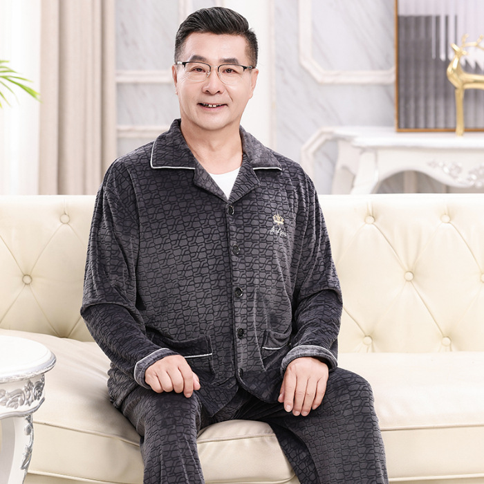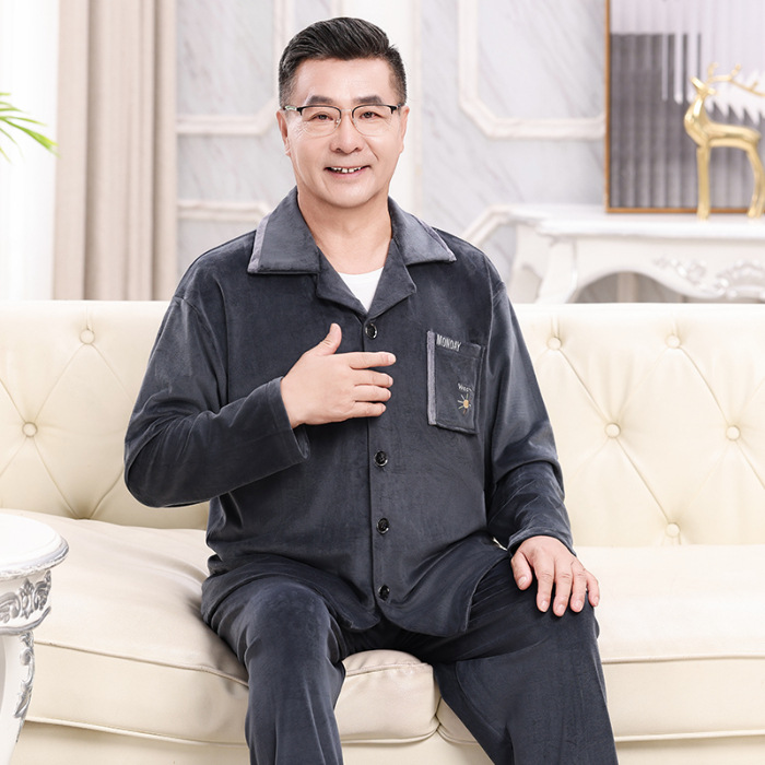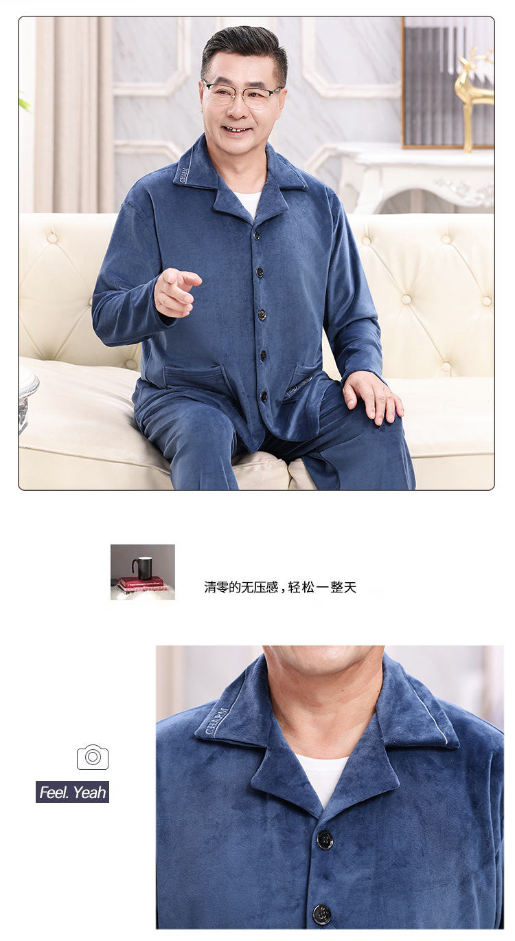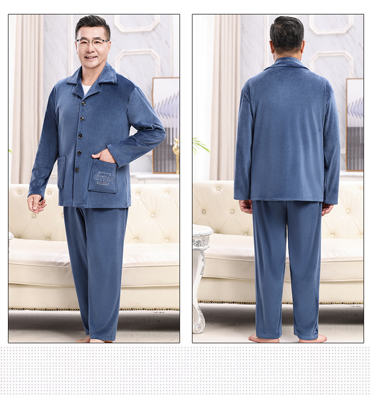 남자 잠옷 섬 벨벳 자카드 중년 아빠 가을과 겨울 카디건 긴팔 바지 따뜻한 2 피스 홈 의류