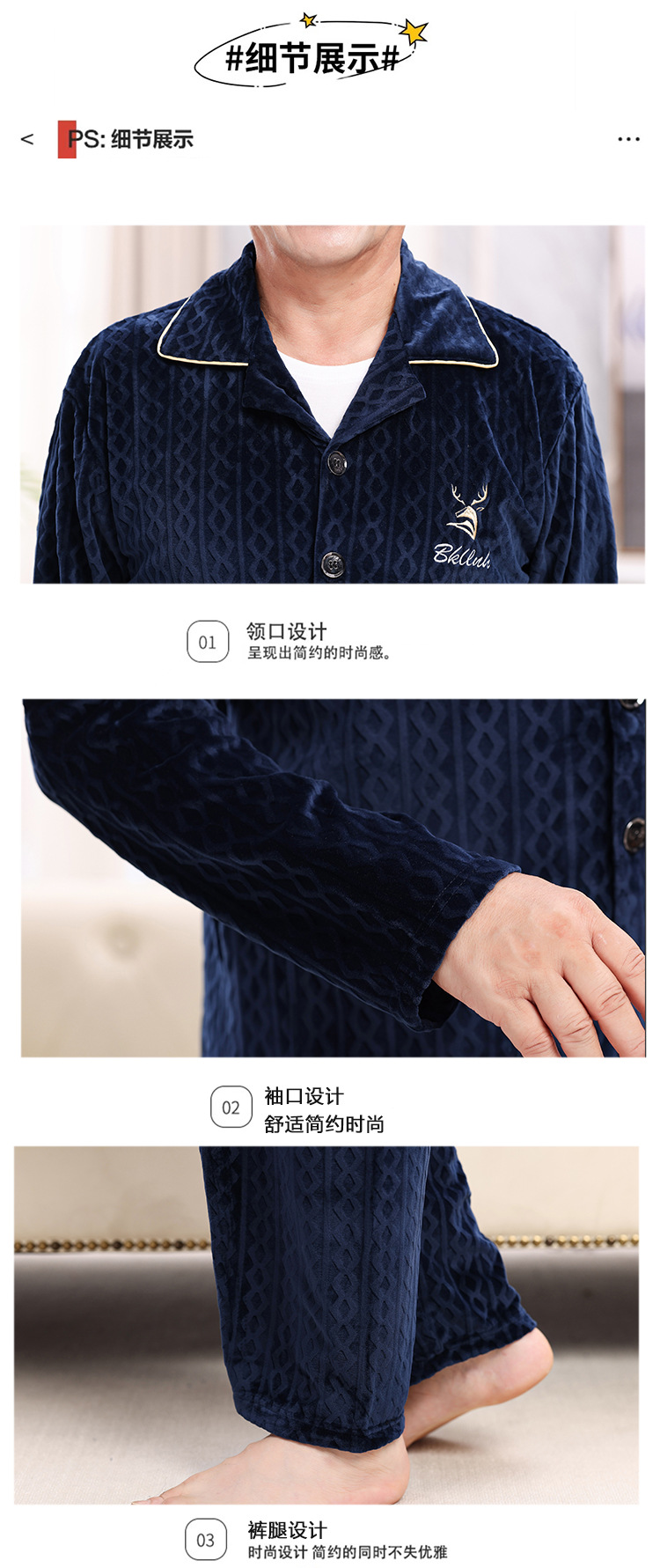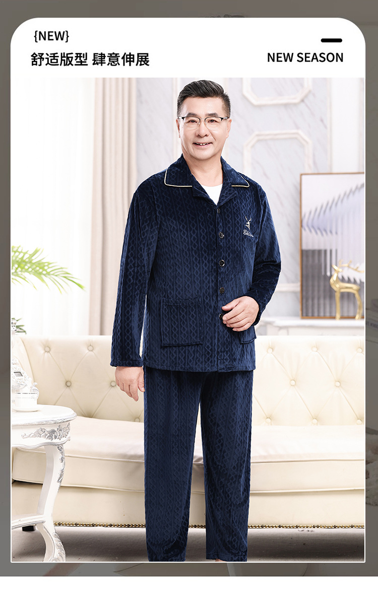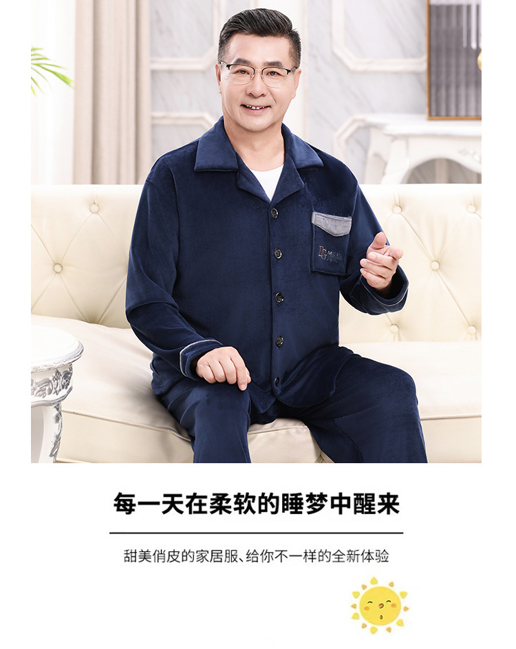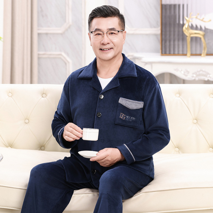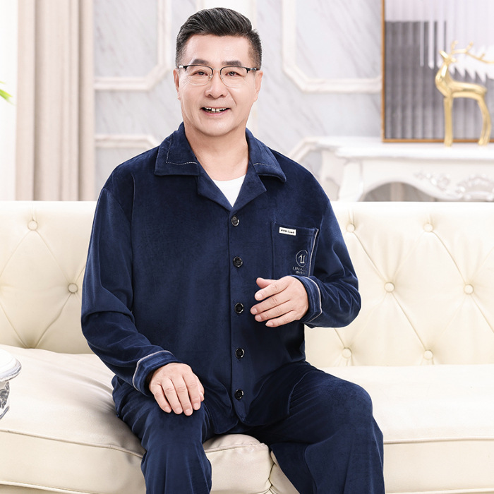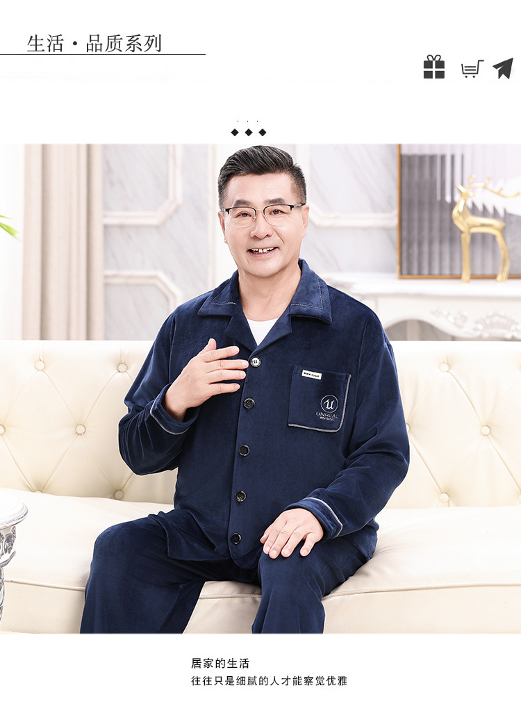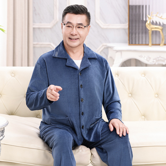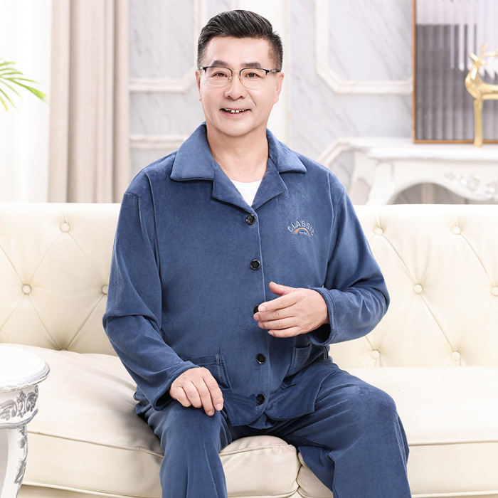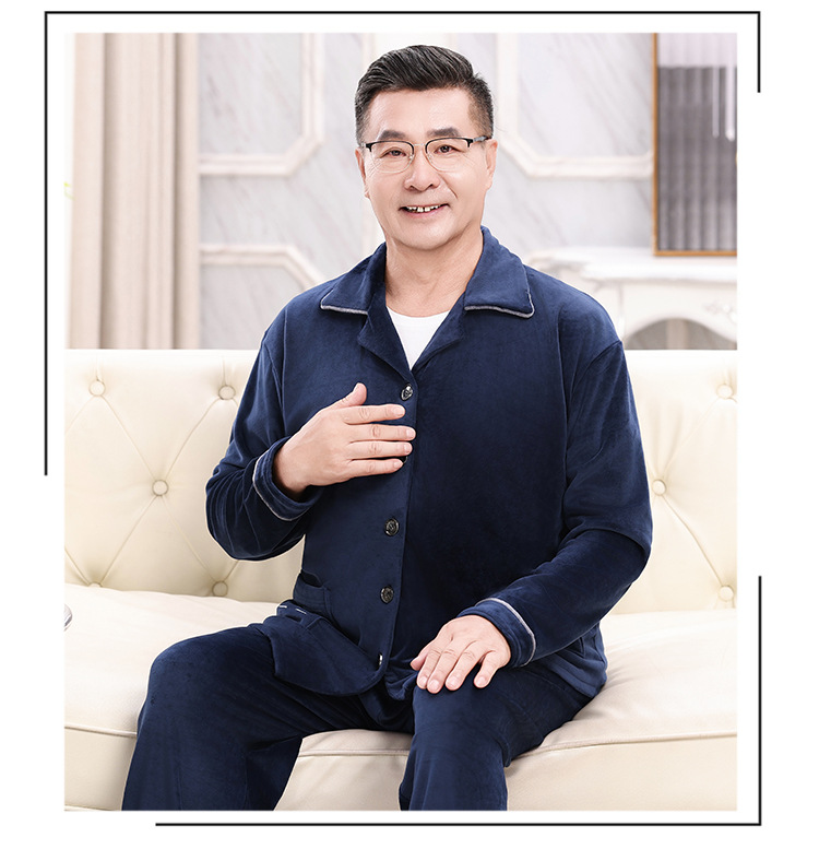 남자 잠옷 섬 벨벳 자카드 중년 아빠 가을과 겨울 카디건 긴팔 바지 따뜻한 2 피스 홈 의류
