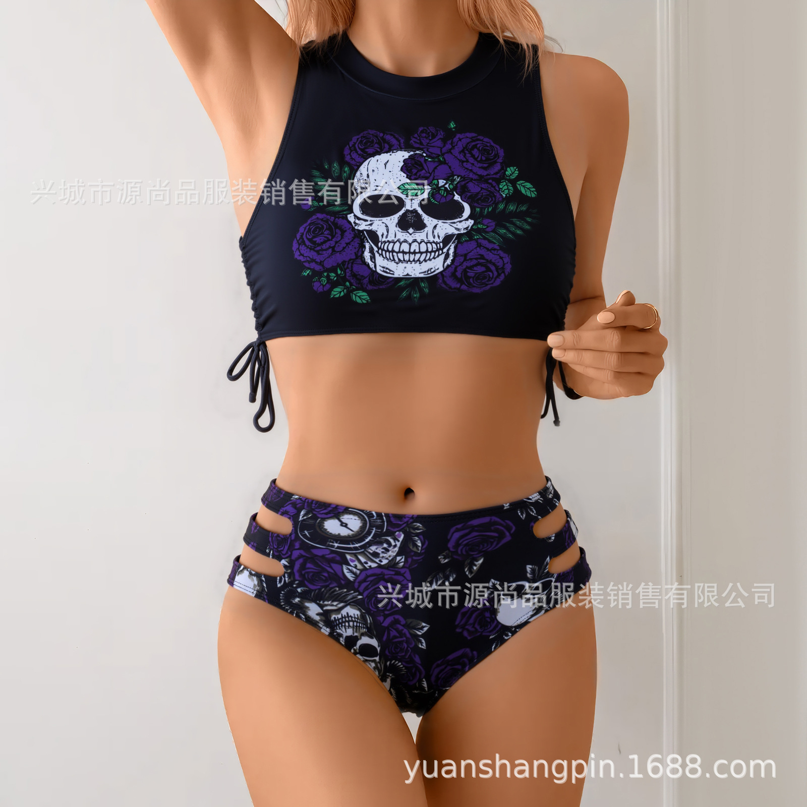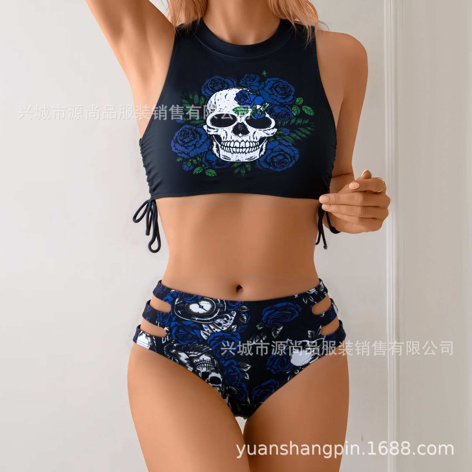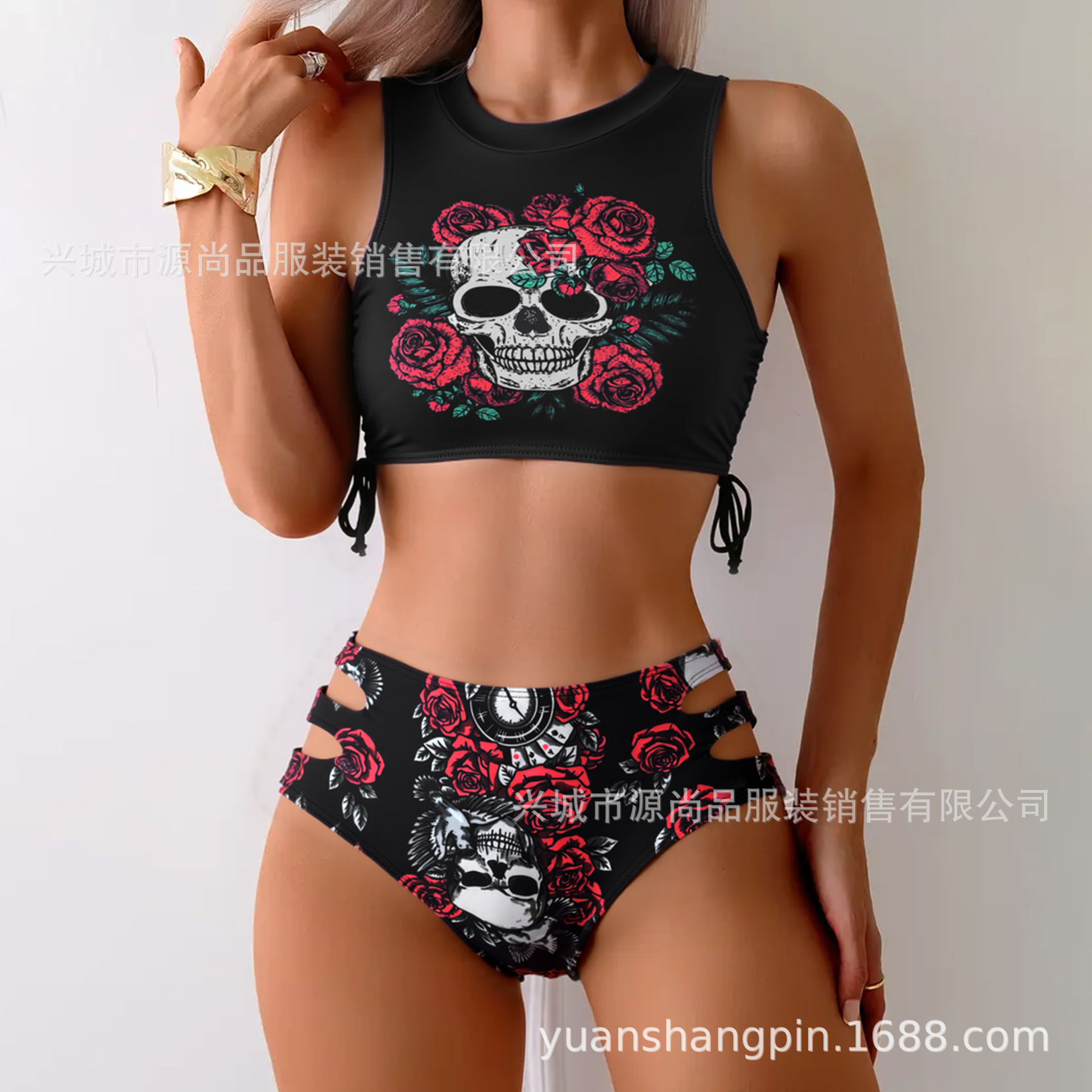 유럽과 미국 스타일의 섹시한 비키니 2026년형 꽃과 해골 무늬 타이트한 투피스 수영복 여성용 해변 러시아