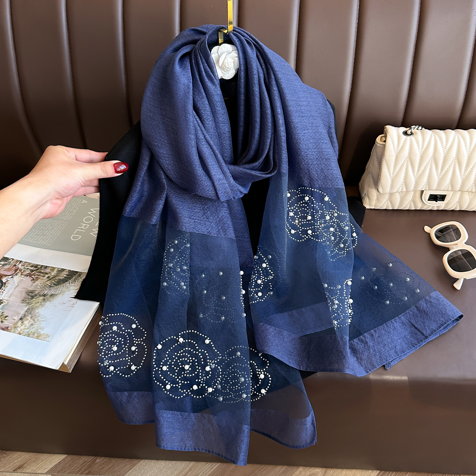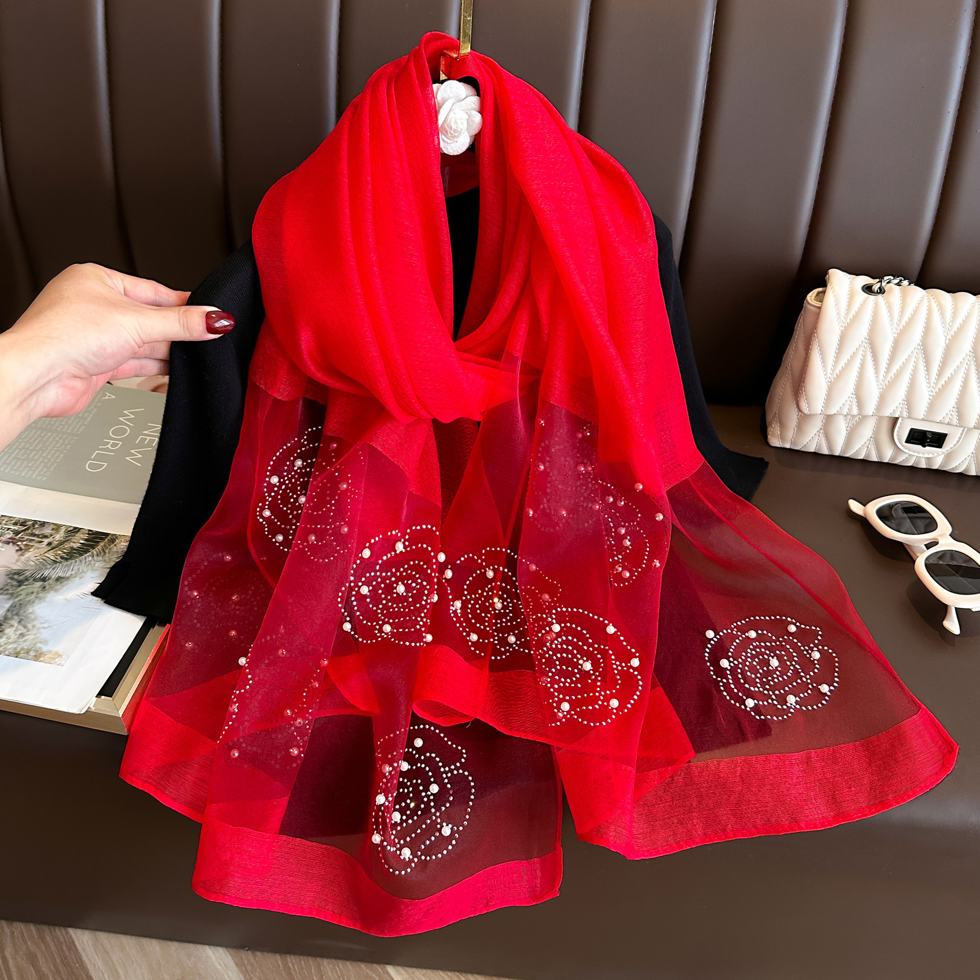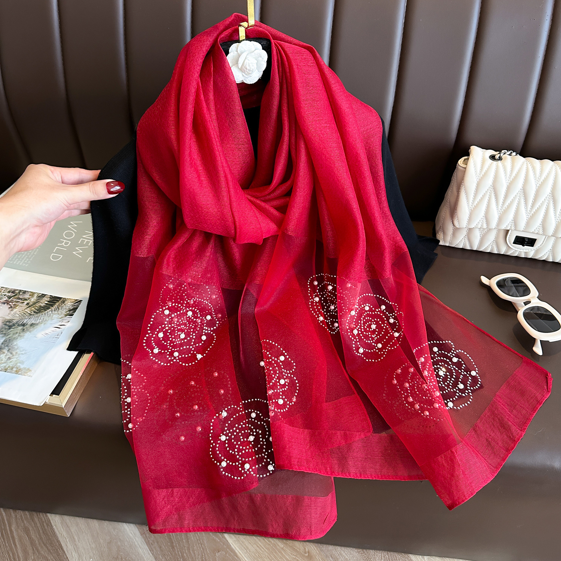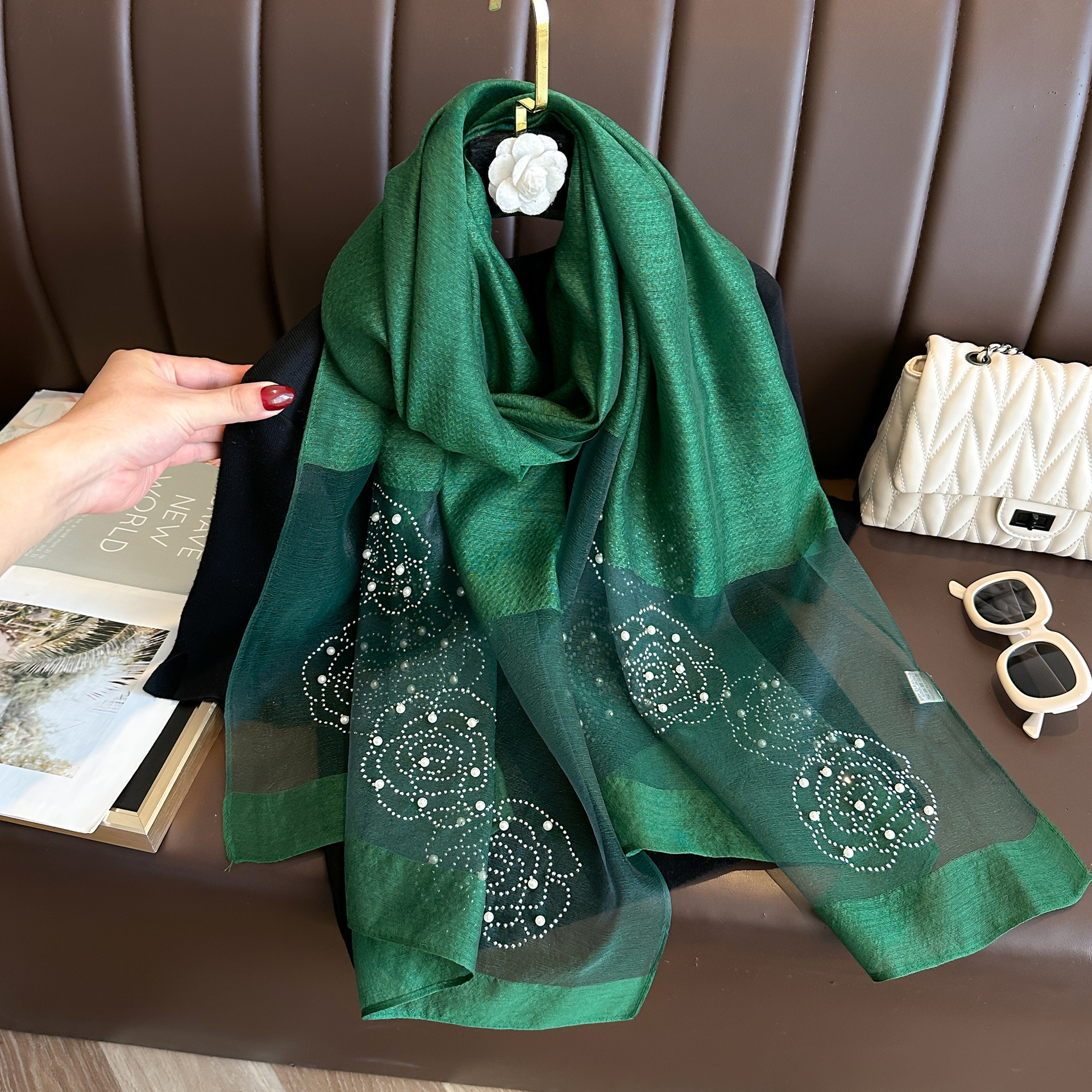 새로운 패션 핫 드릴링 동백 모방 실크 스카프 여성의 겨울 따뜻한 긴 스카프 신장 바오 터 스카프 장식 스카프스토어 가기
