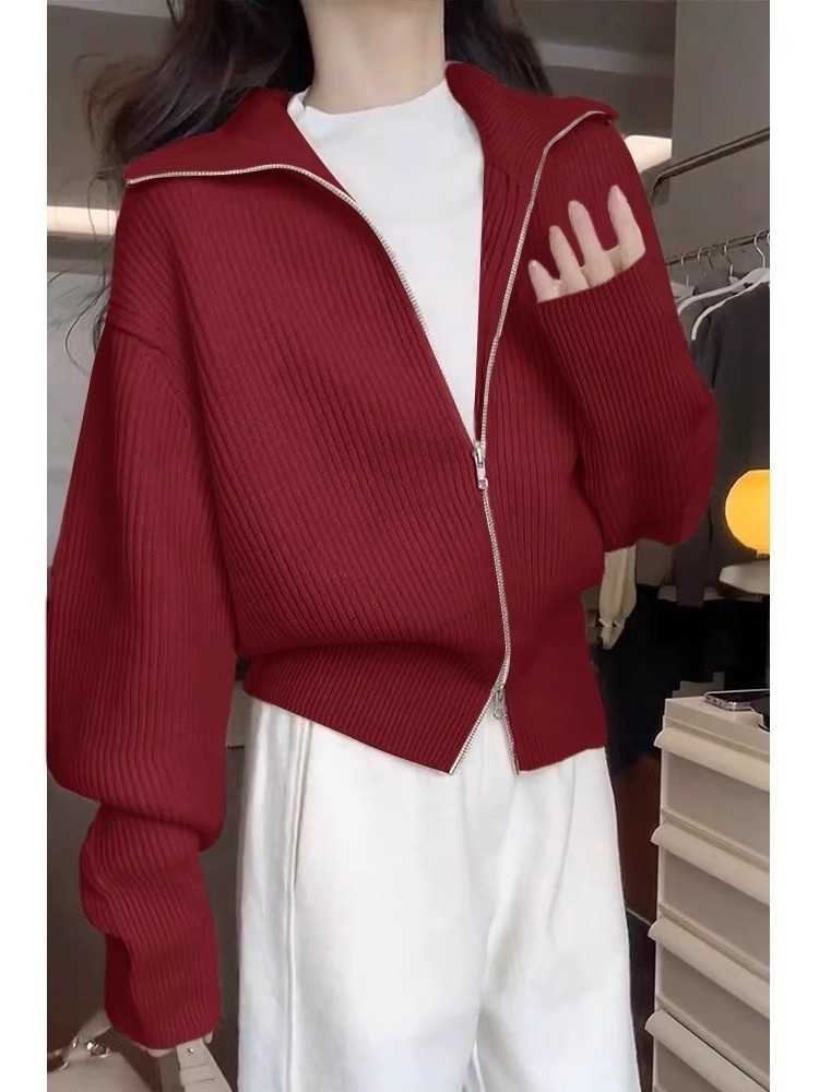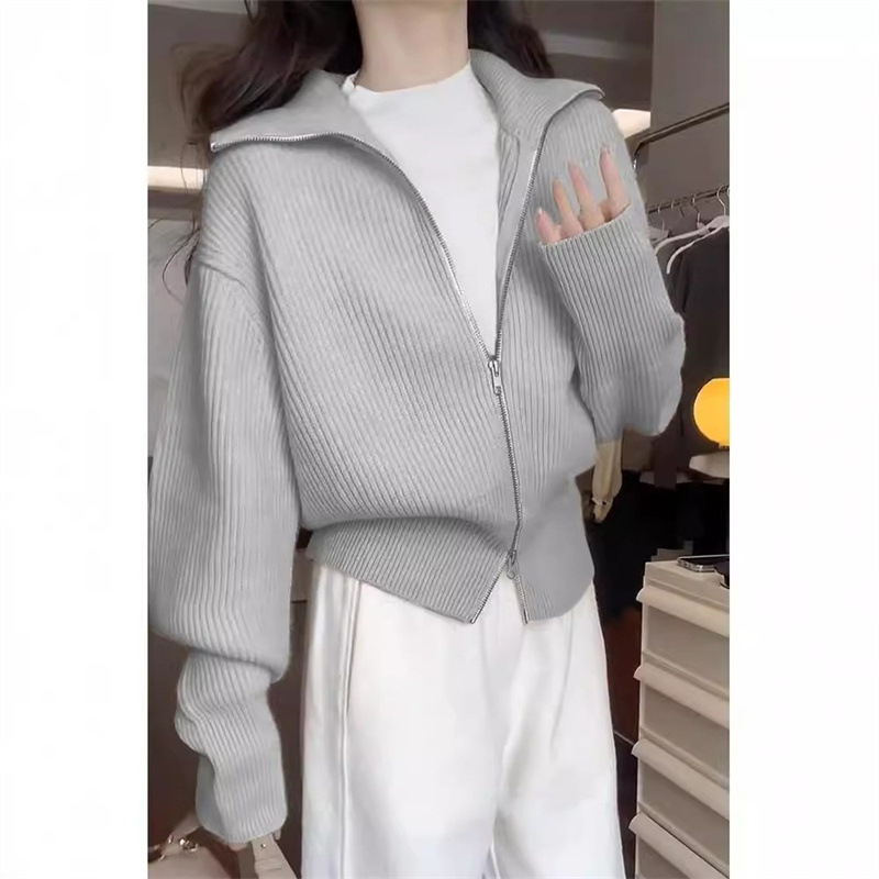 게으른 스타일 더블 지퍼 옷깃 니트 카디건 여성 가을 및 겨울 대학 스타일 루즈 소프트 왁스 짧은 스웨터 코트