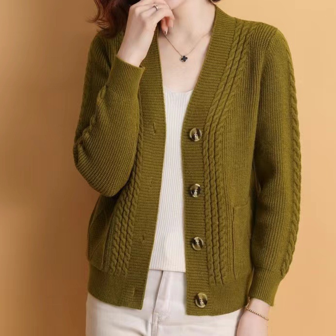 2024 가을과 겨울 V 넥 니트 카디건 여성 외부 트위스트 긴 소매 기질 캐주얼 스웨터 여성의 편안한 코트 도매