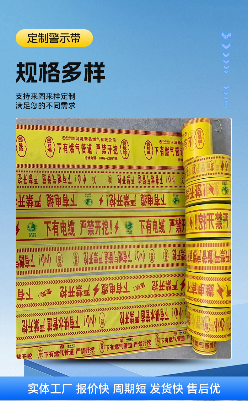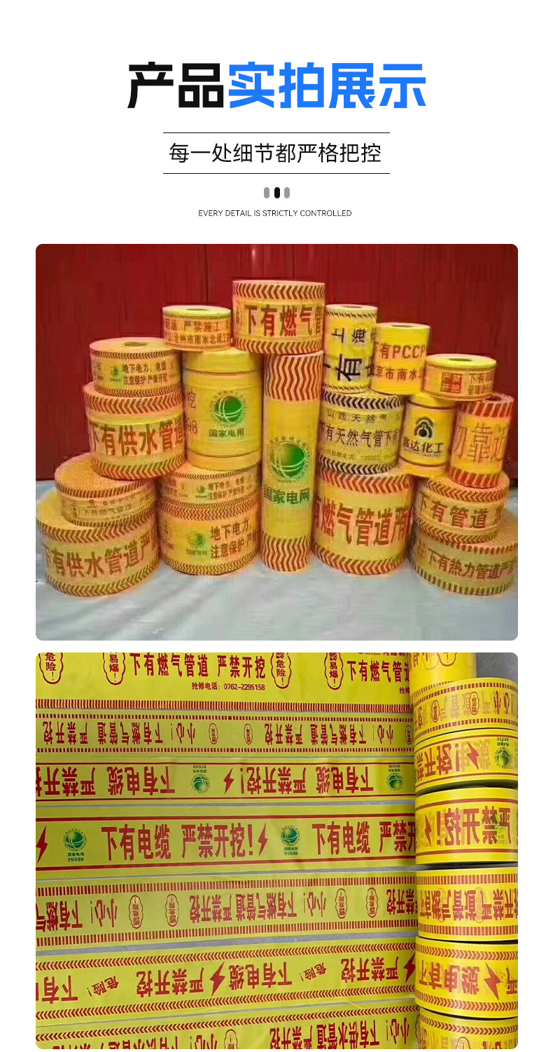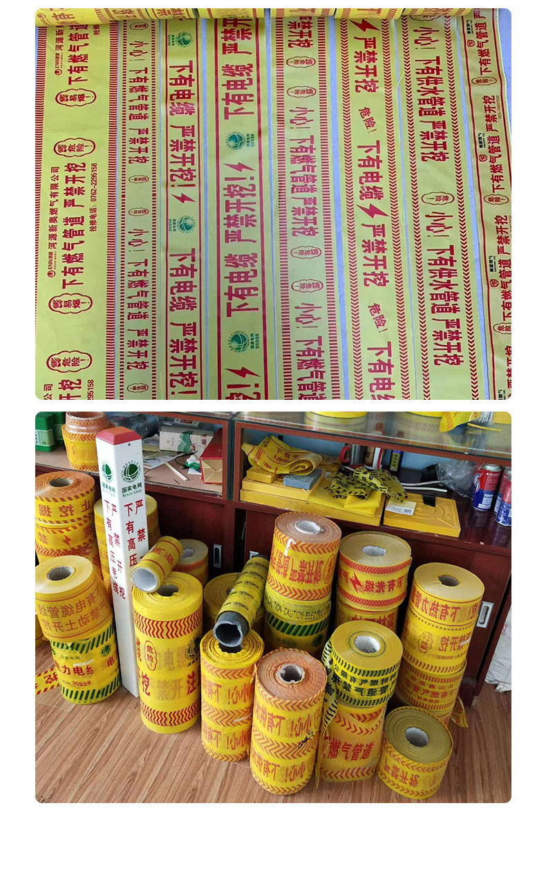 묻힌 경고 벨트 PE 케이블 경고 벨트 전원 가스 급수 파이프 라인 식별 벨트 감지 가능한 철사로 덮인 매장 벨트스토어 가기