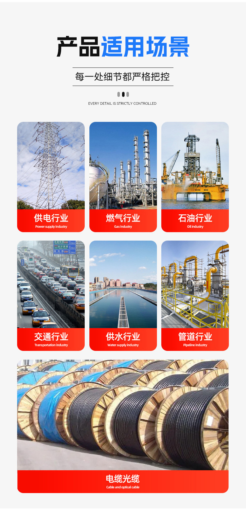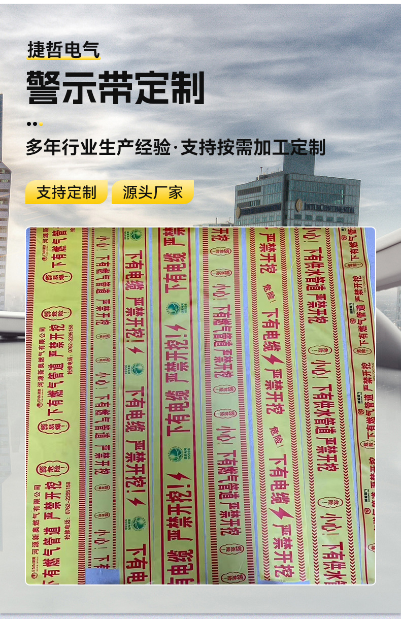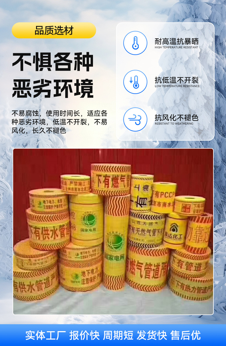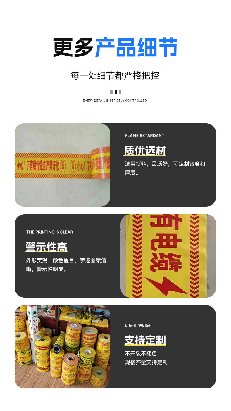 묻힌 경고 벨트 PE 케이블 경고 벨트 전원 가스 급수 파이프 라인 식별 벨트 감지 가능한 철사로 덮인 매장 벨트스토어 가기
