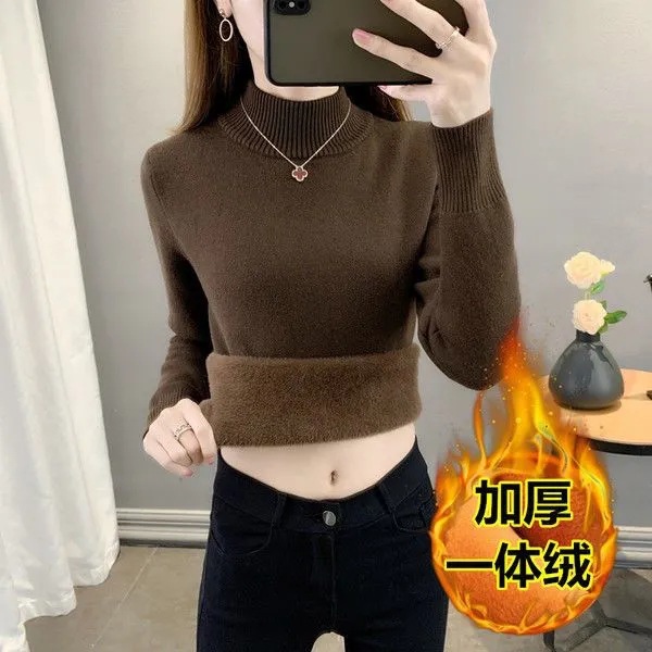가을과 겨울 새로운 스웨터 여성의 두꺼운 원피스 벨벳 내부 느슨한 하프 터틀넥 풀오버 베이스 스웨터 따뜻한 탑스토어 가기