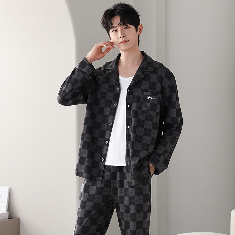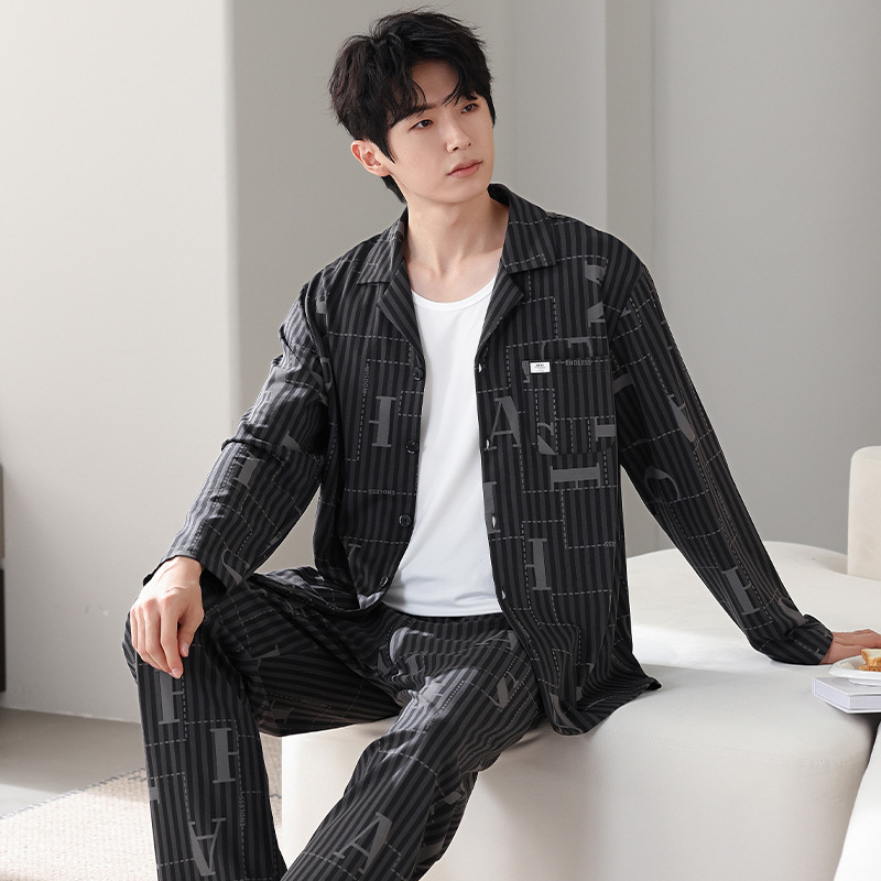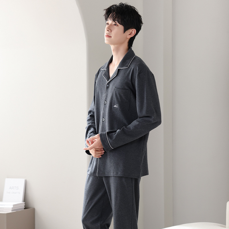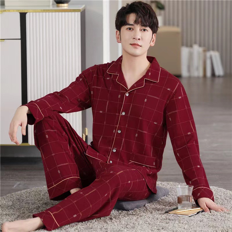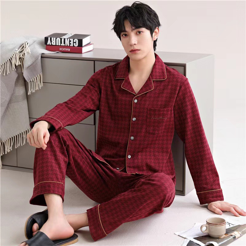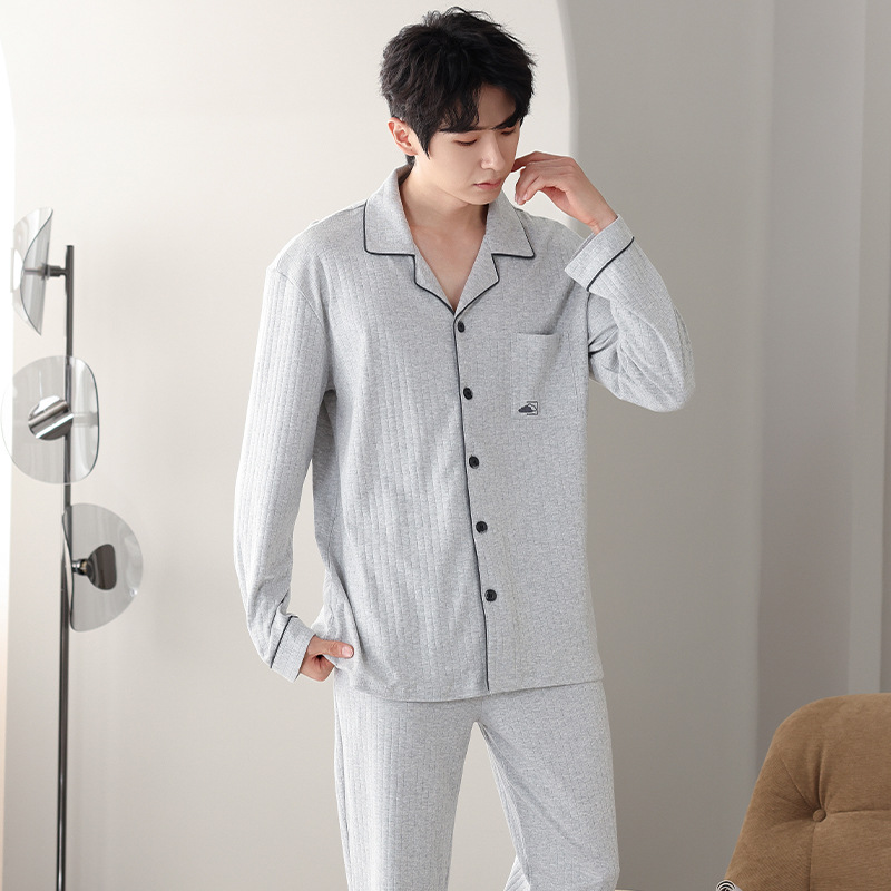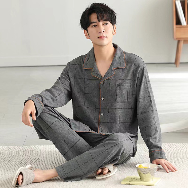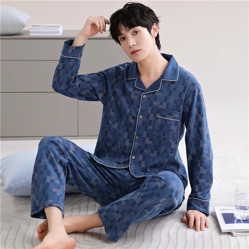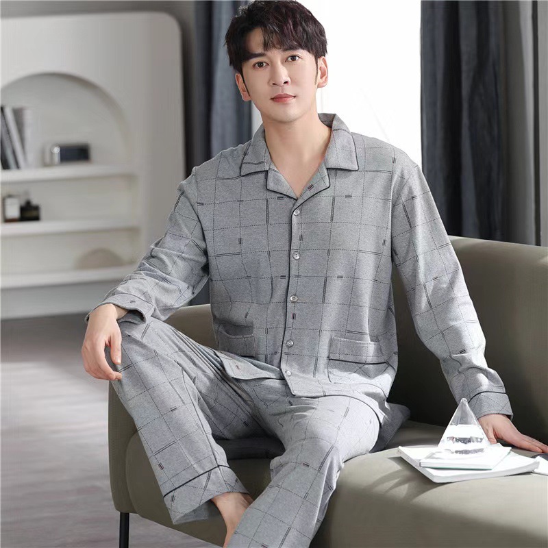 잠옷 남자의 봄과 가을 면 긴 소매 십대 코튼 옷깃 겨울 플러스 사이즈 겉옷 세트스토어 가기