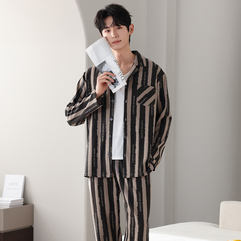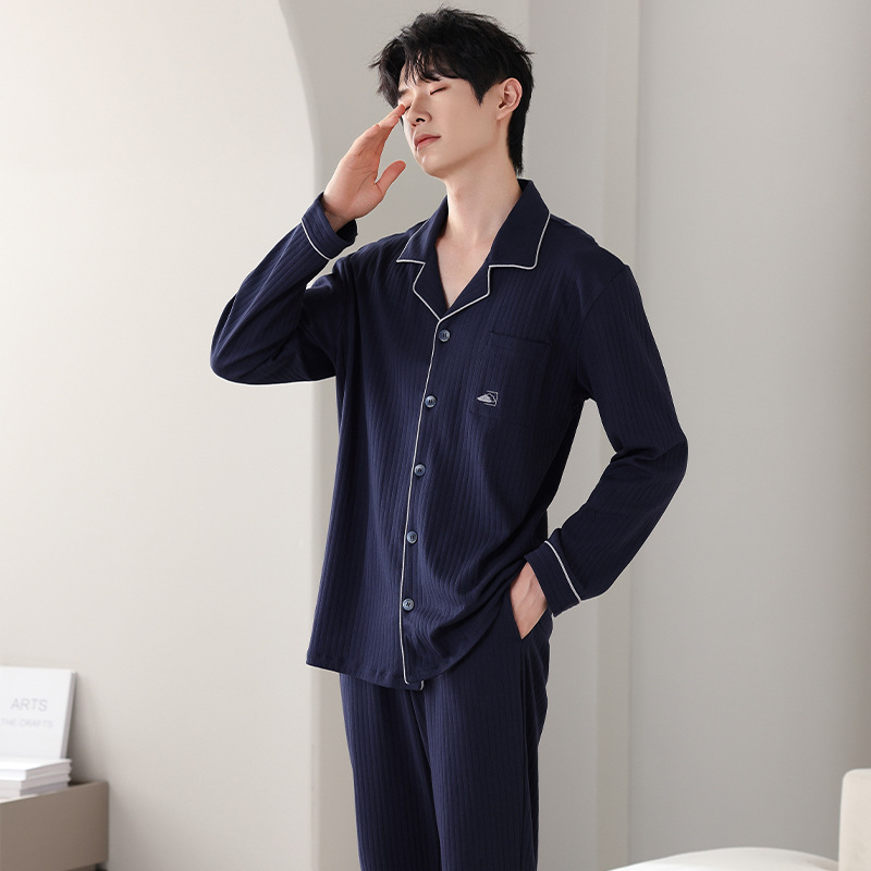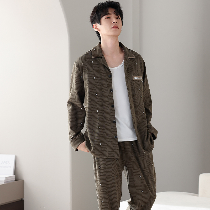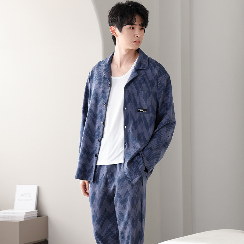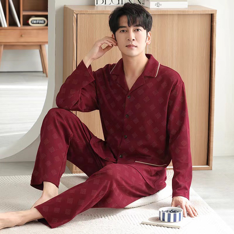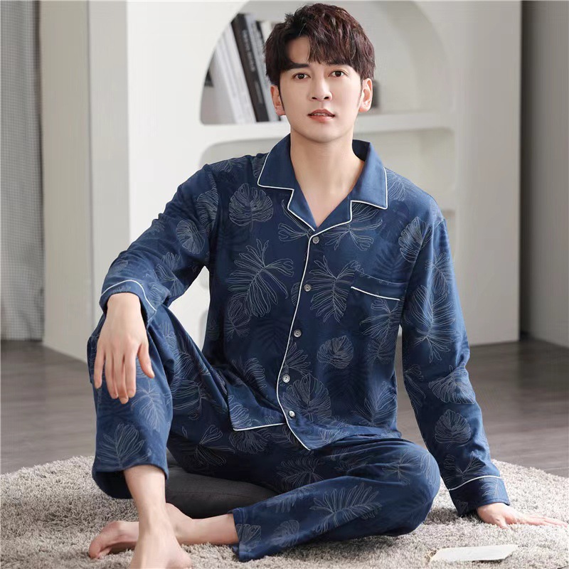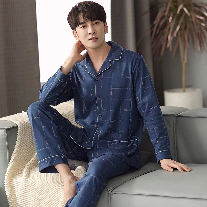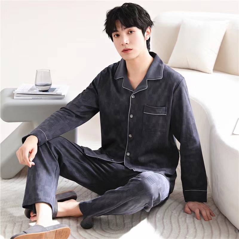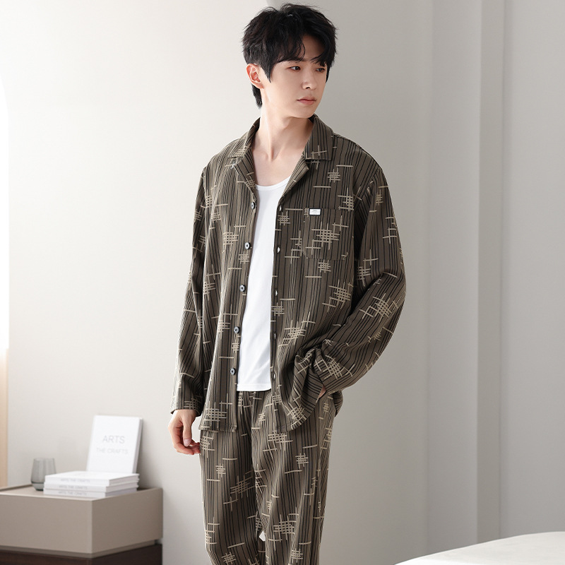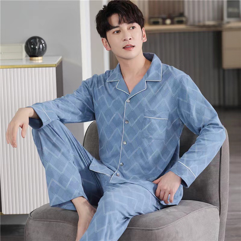 잠옷 남자의 봄과 가을 면 긴 소매 십대 코튼 옷깃 겨울 플러스 사이즈 겉옷 세트스토어 가기