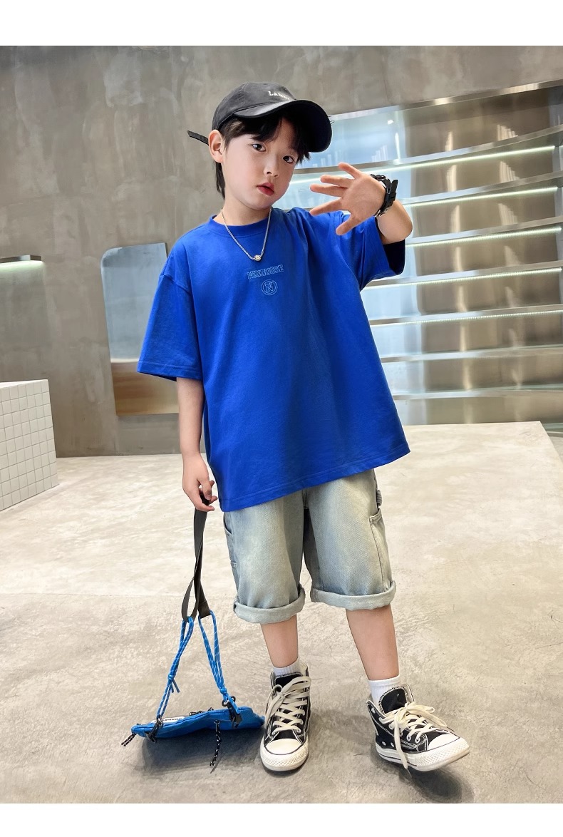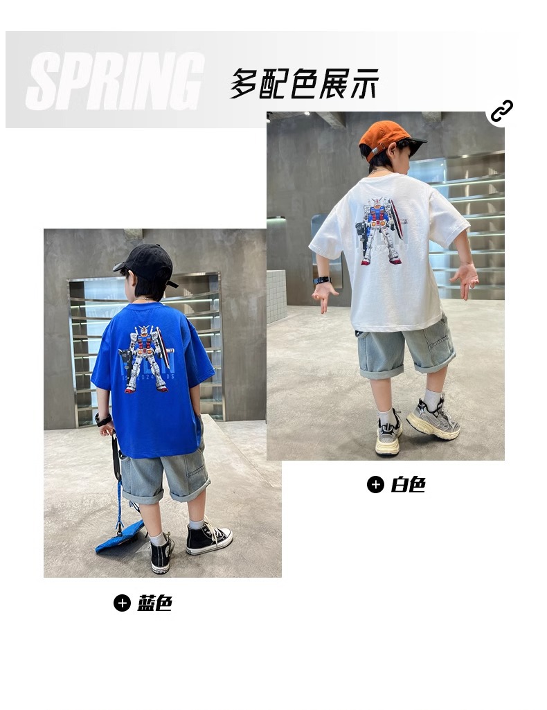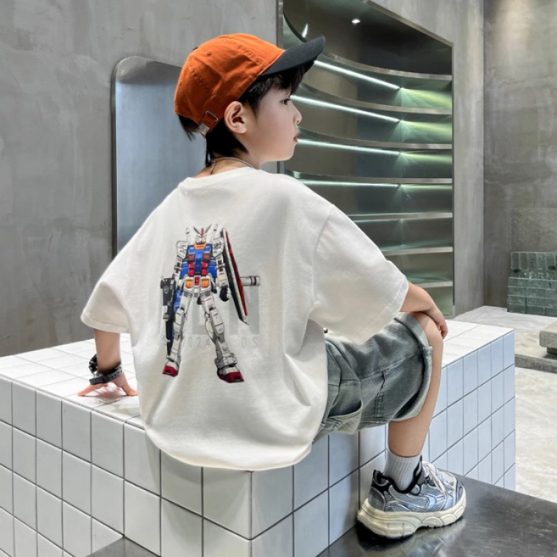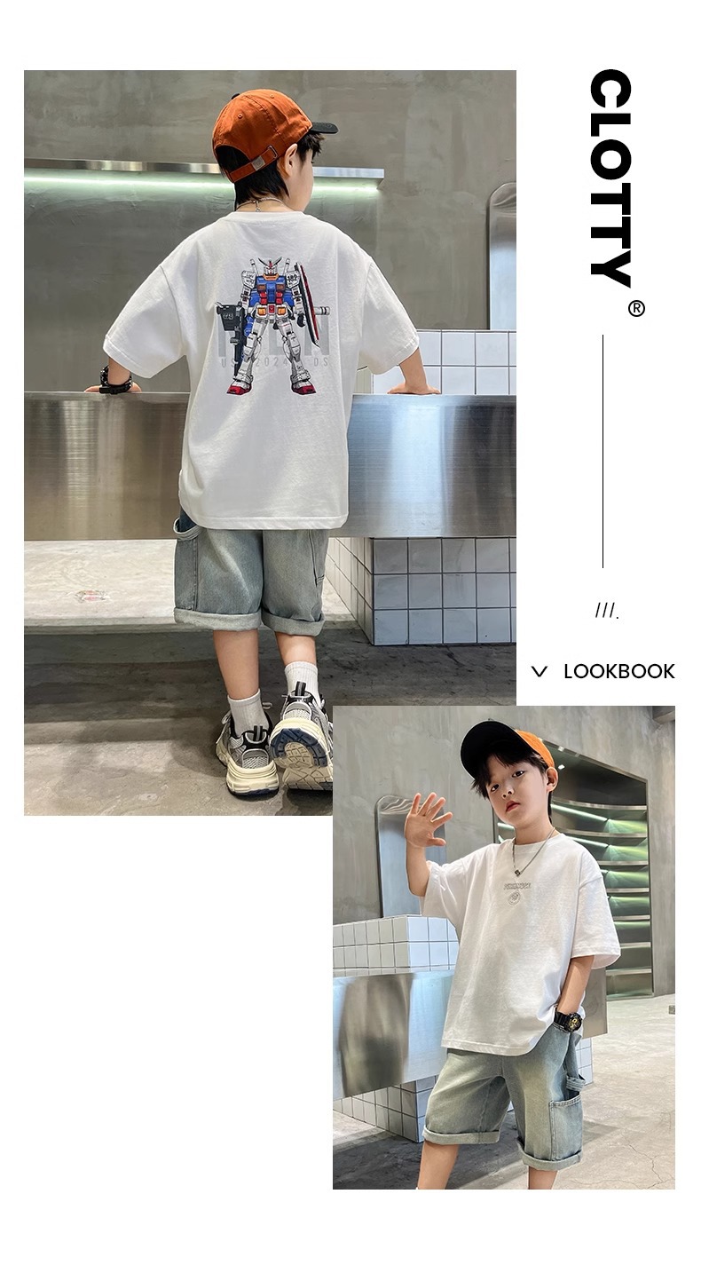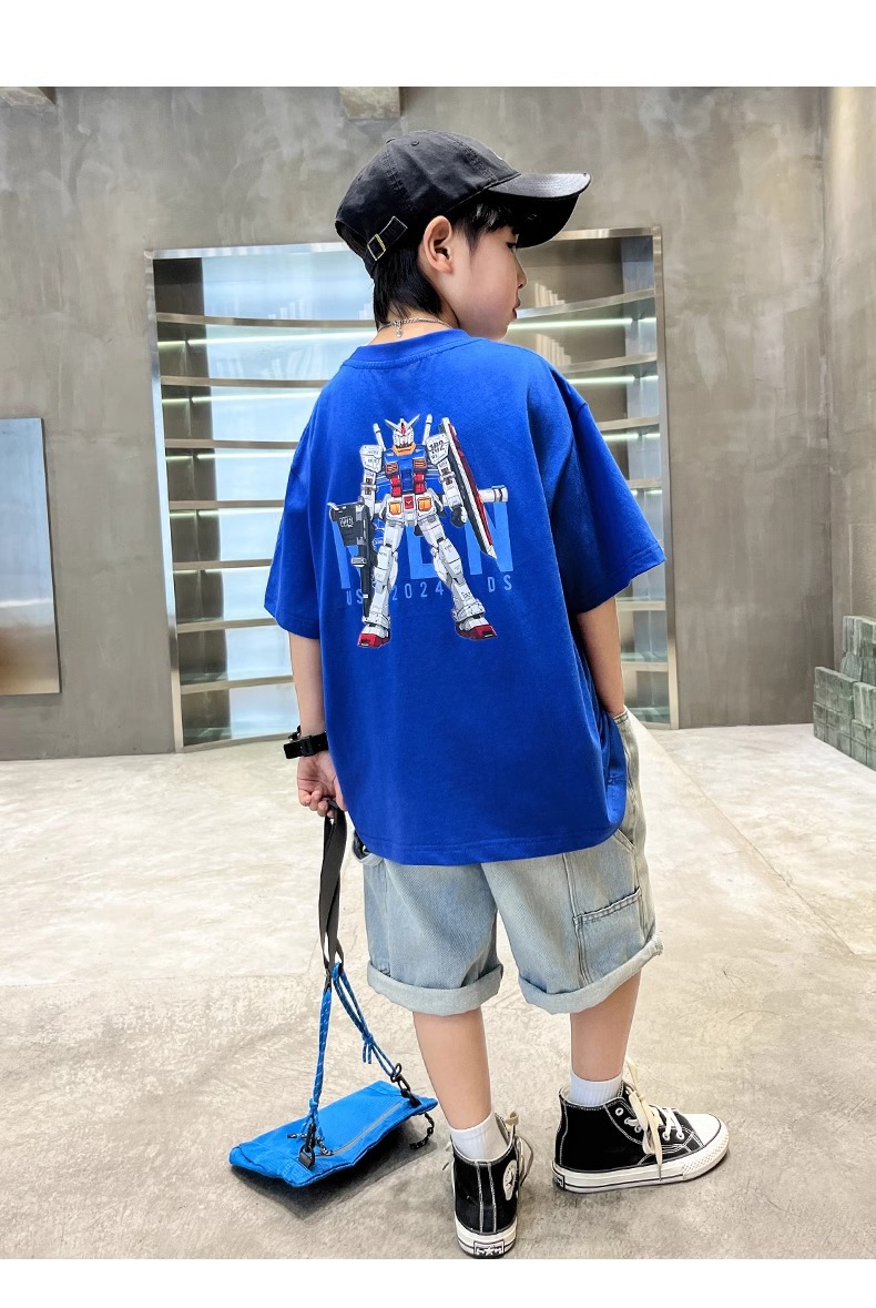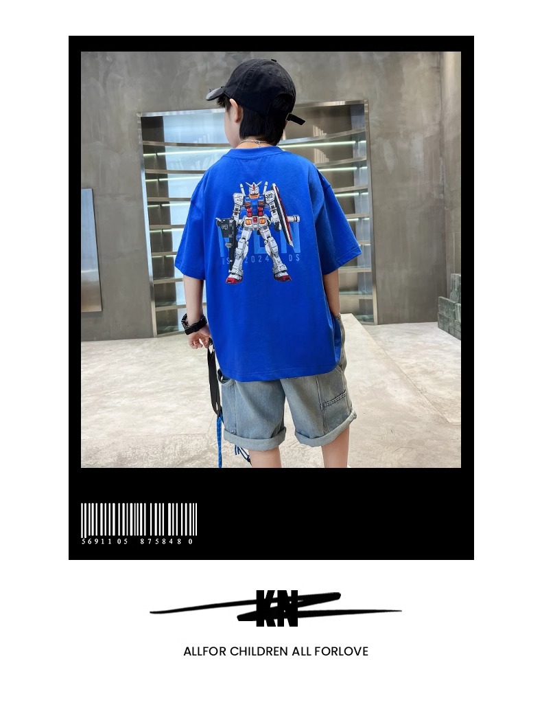 순수 코튼 소년 반팔 티셔츠 2025 여름 중형 및 대형 어린이 느슨한 핫 스타일 잘 생긴 만화 애니메이션 인쇄스토어 가기