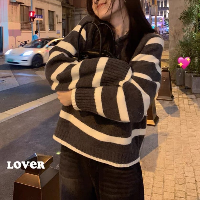 한국 스타일 레트로 스트라이프 후드 스웨터 여성의 가을 및 겨울 새로운 느슨한 슬리밍 컬러 매칭 올 매치 풀오버 스웨터 여성 트렌디스토어 가기