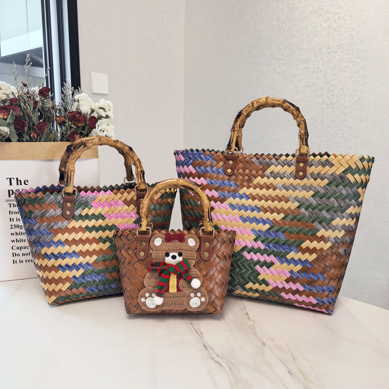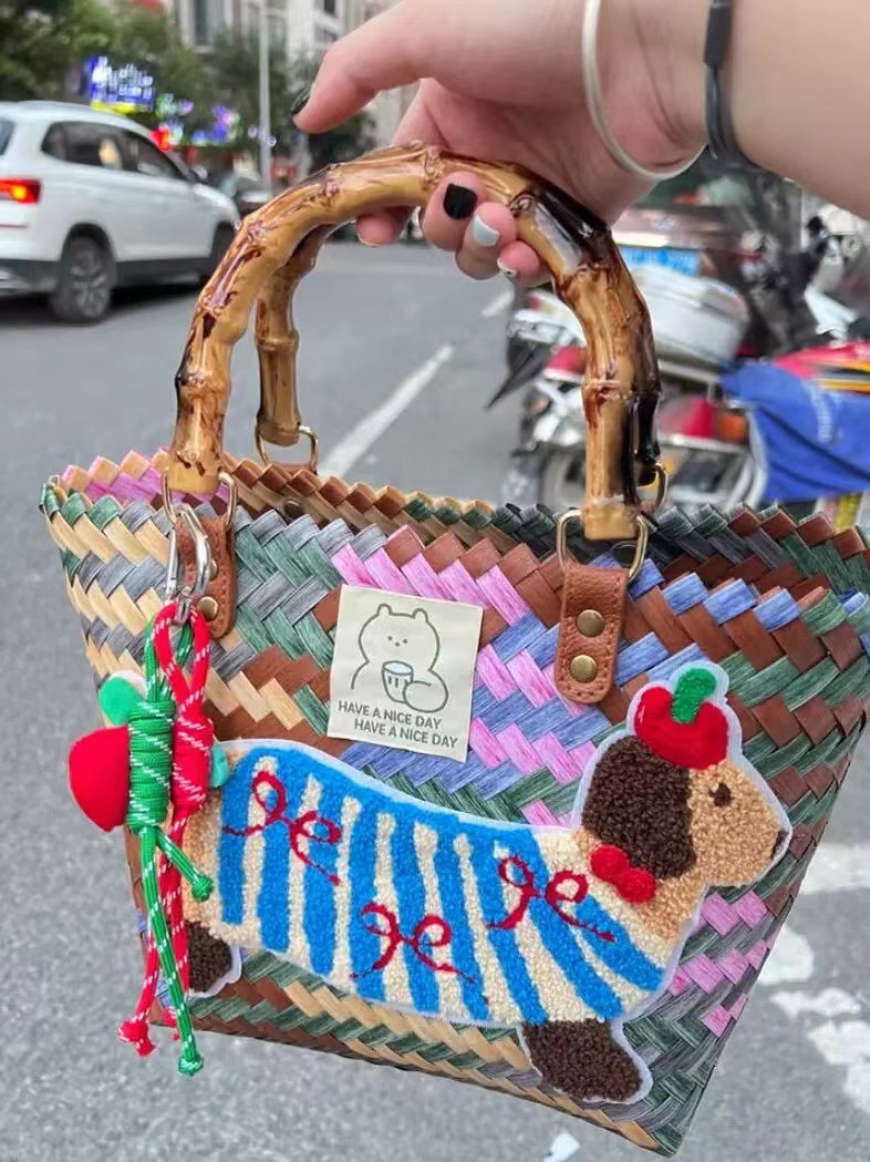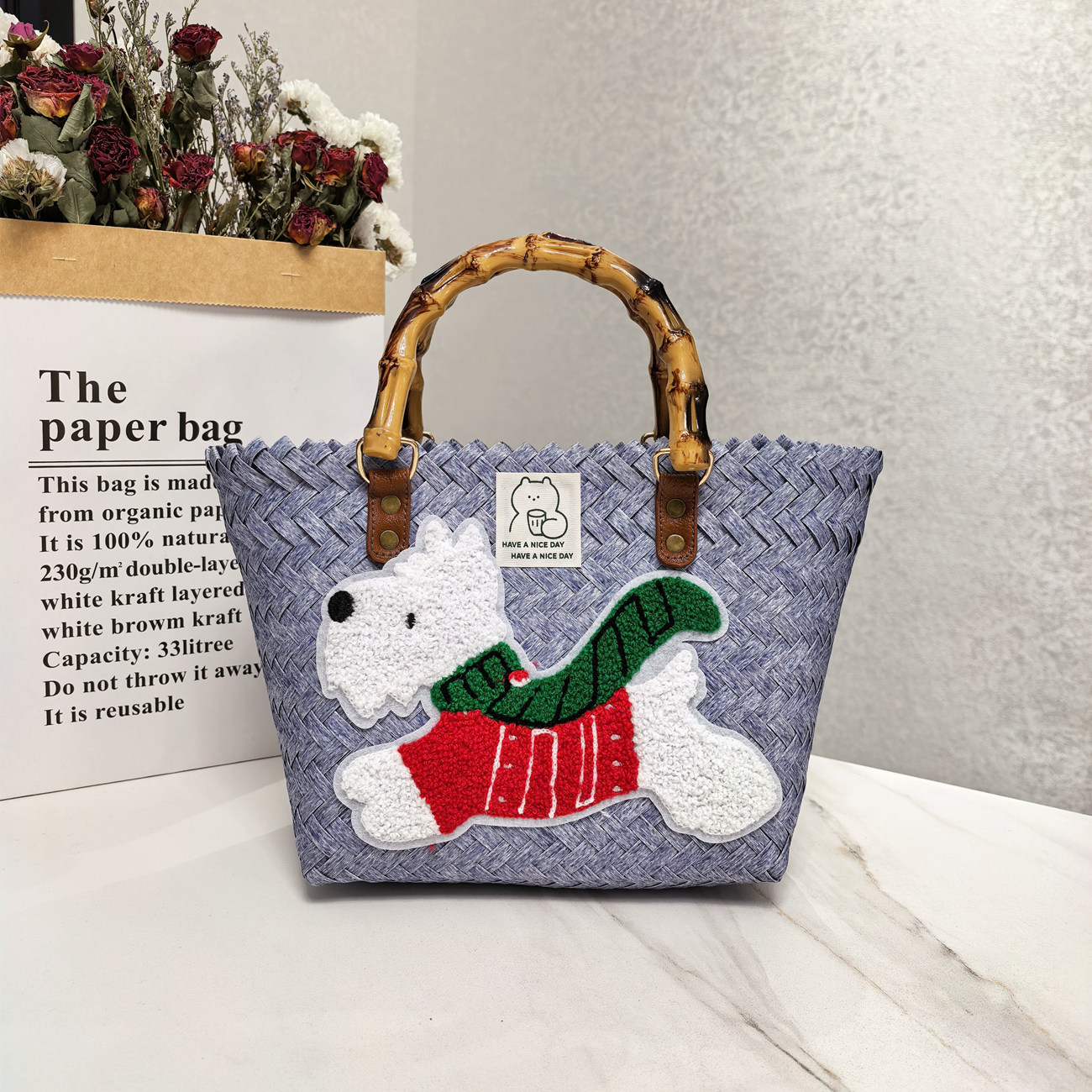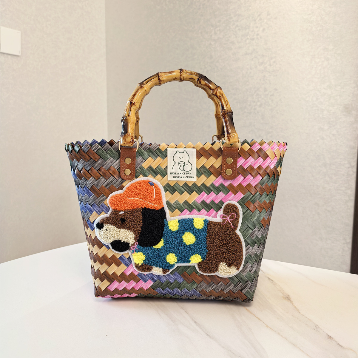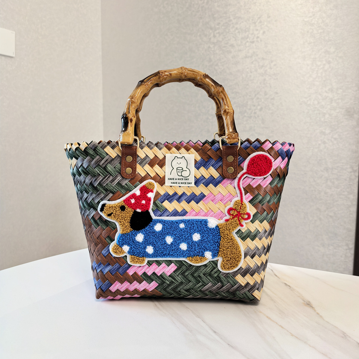 빈티지 줄무늬 Weenie 개 짠 가방 핸드백 나일론 로프 펜던트 토트 백 손을 들고 여성 가방 비치 백