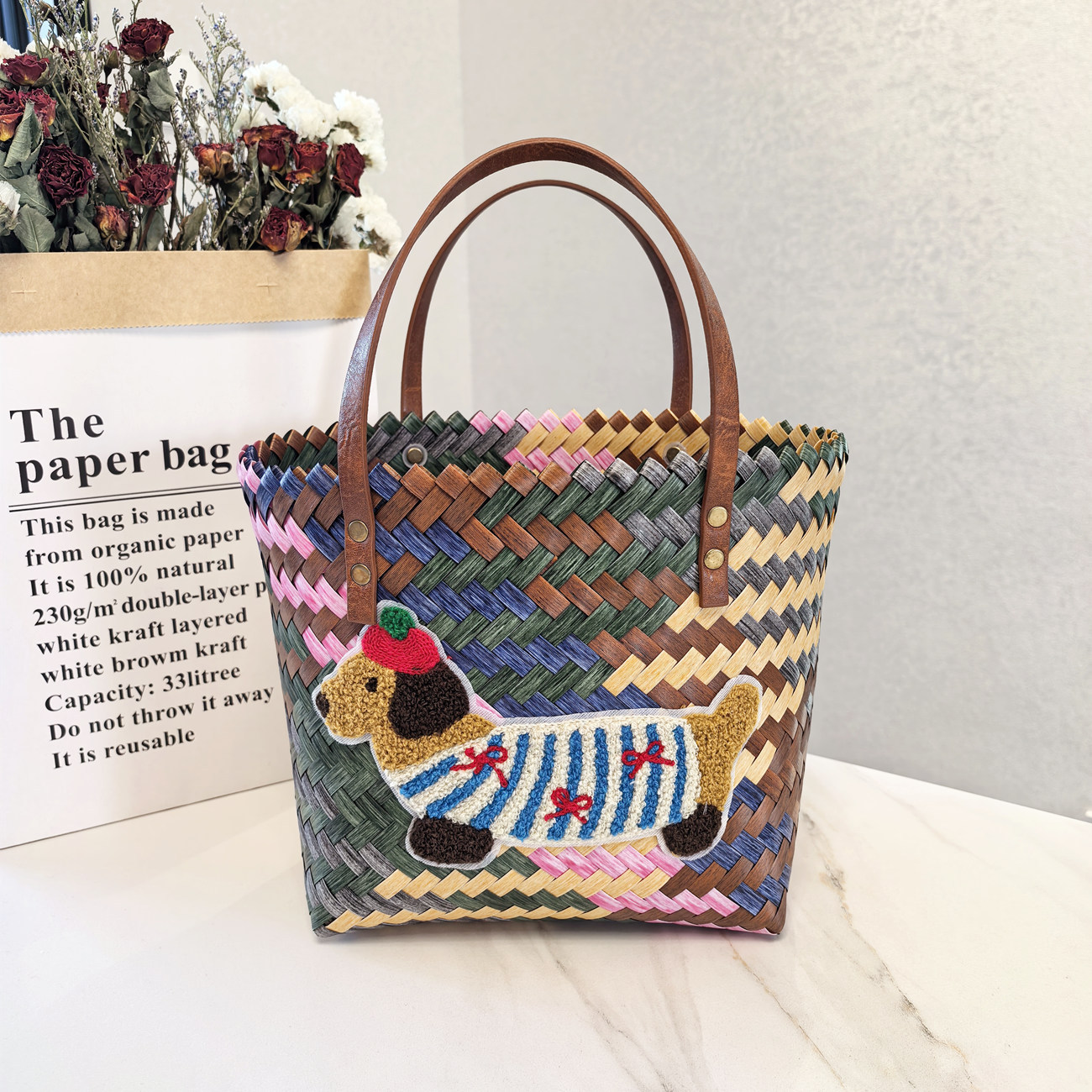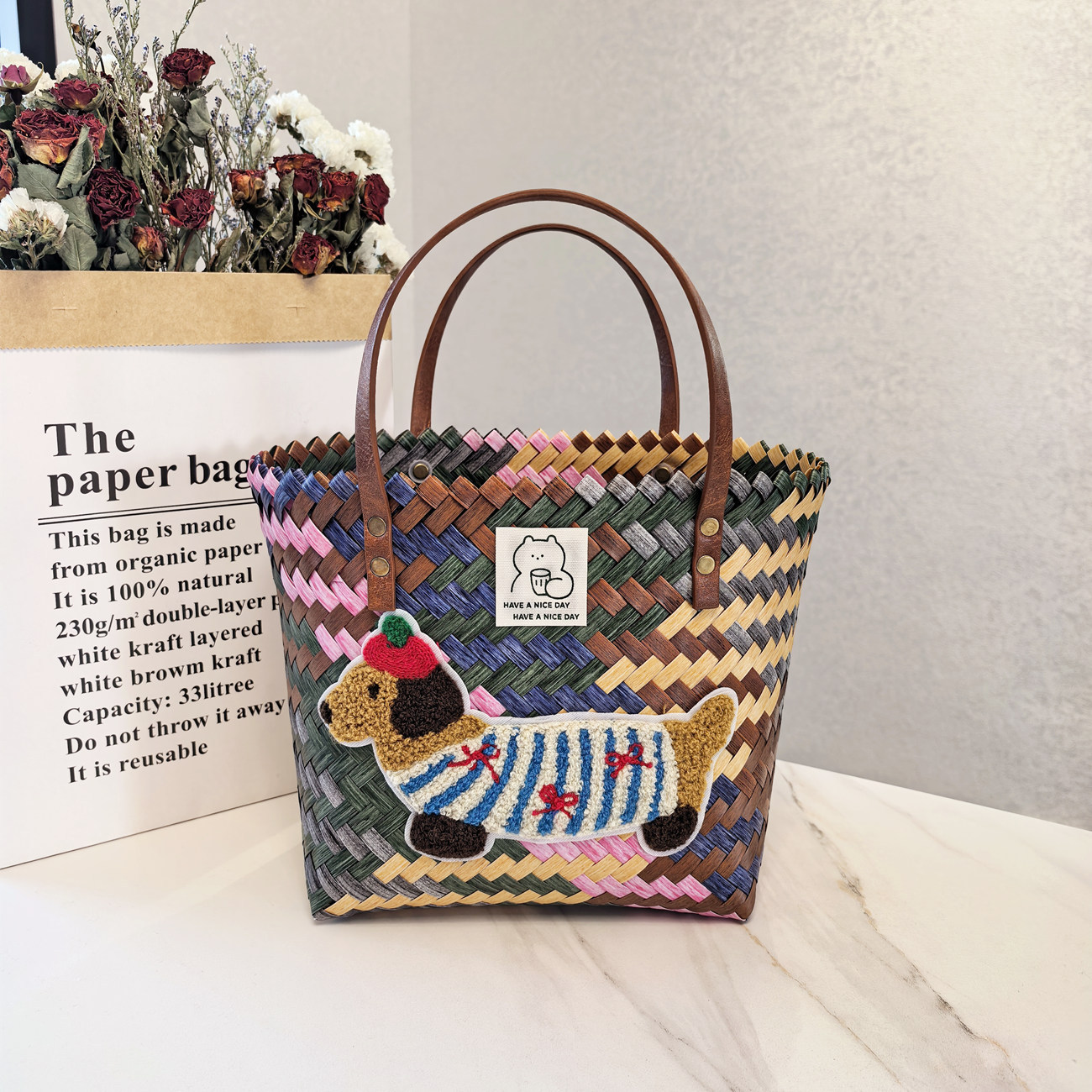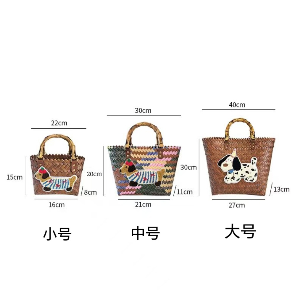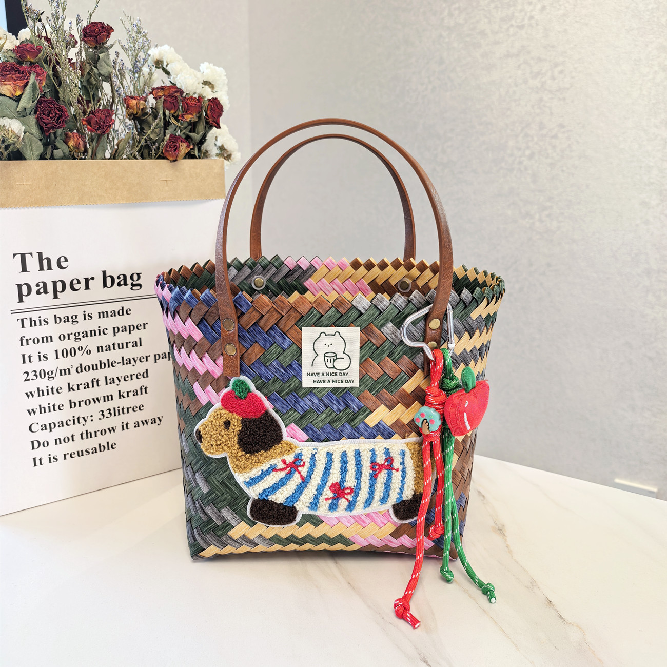빈티지 줄무늬 Weenie 개 짠 가방 핸드백 나일론 로프 펜던트 토트 백 손을 들고 여성 가방 비치 백스토어 가기