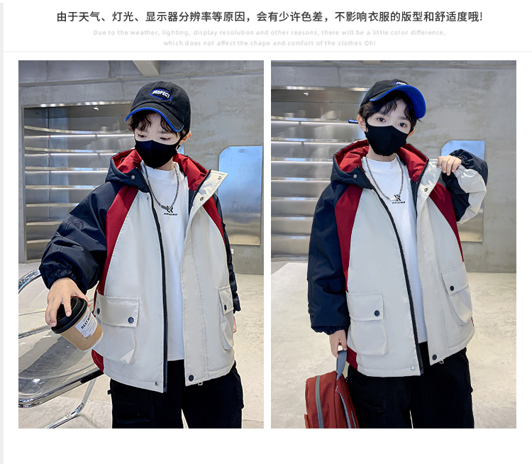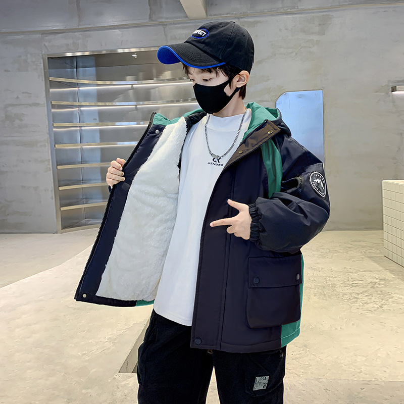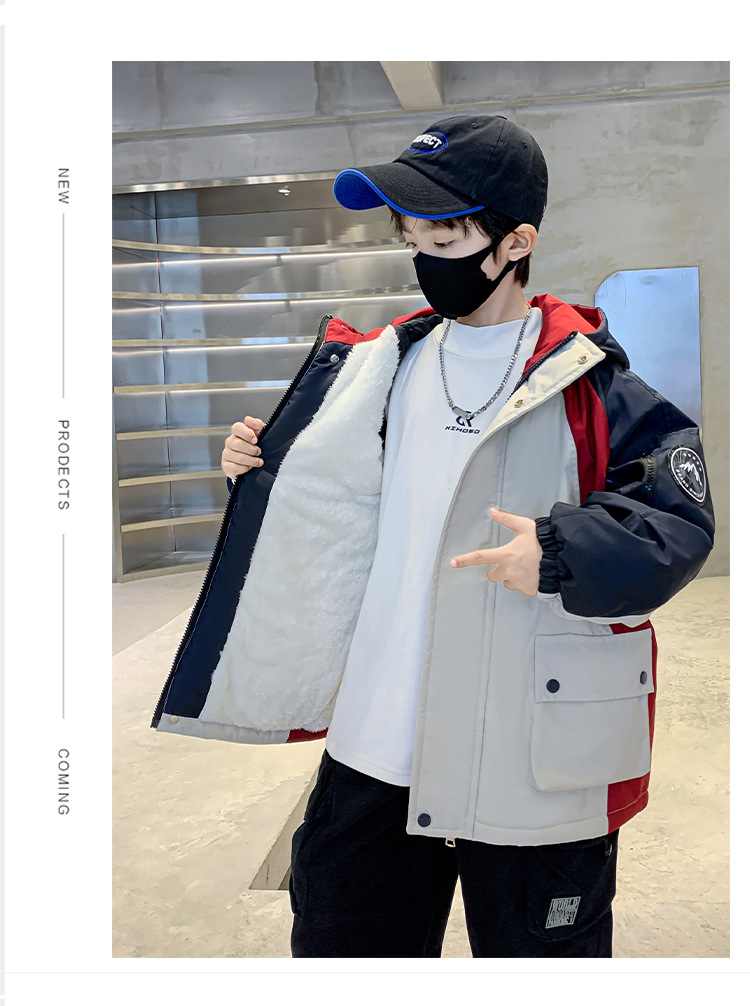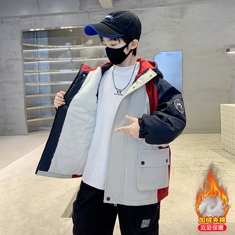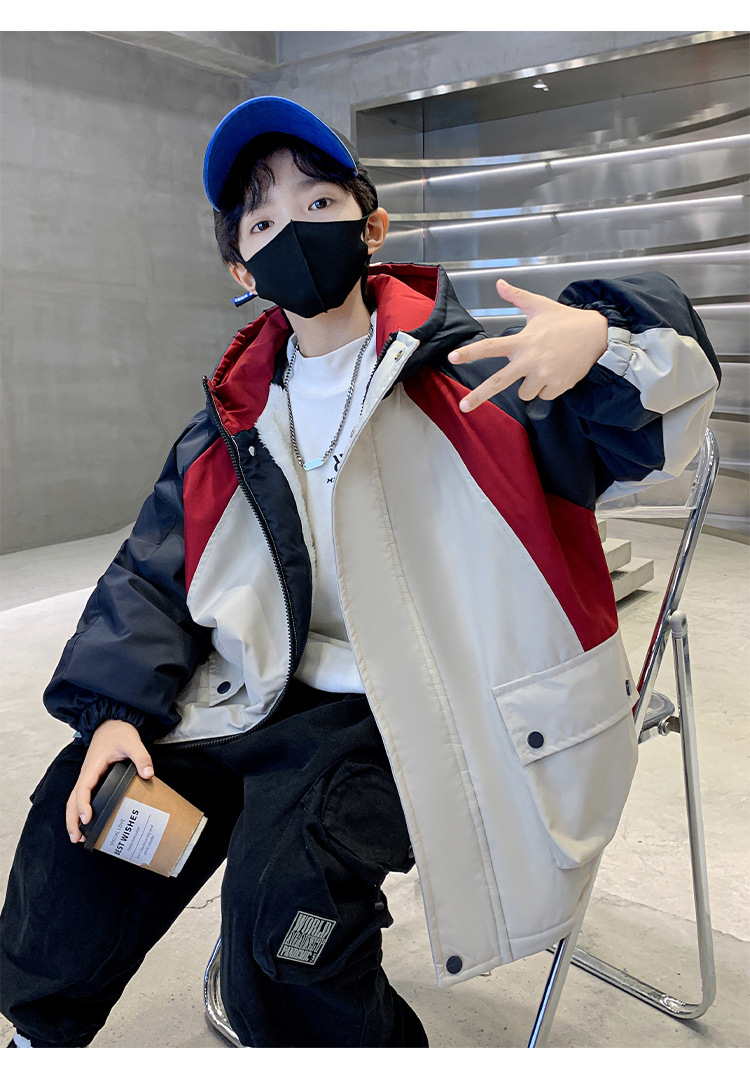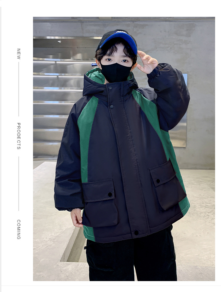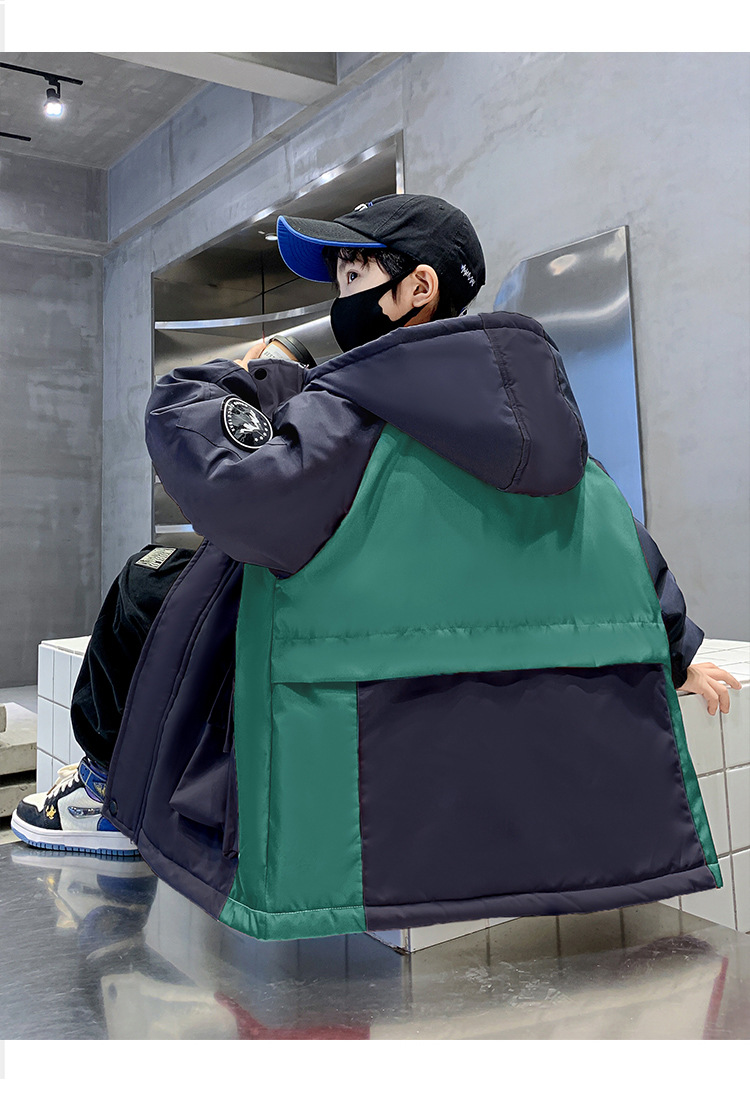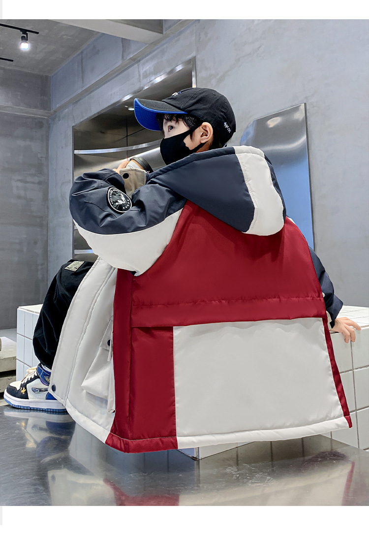 어린이 겨울복 소년의 새 기모 컬러 블록 파커 코트 2024 어린이 캐주얼 따뜻한 후드 코트 트렌디