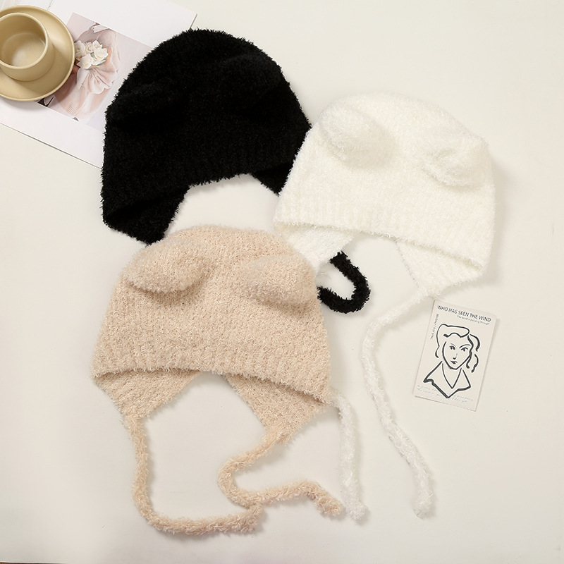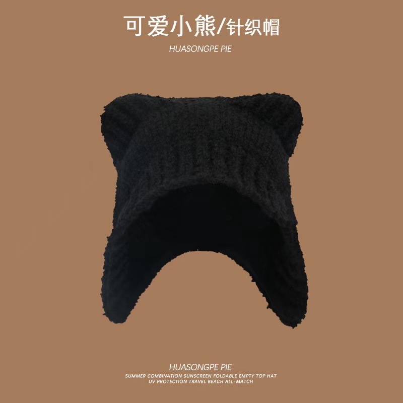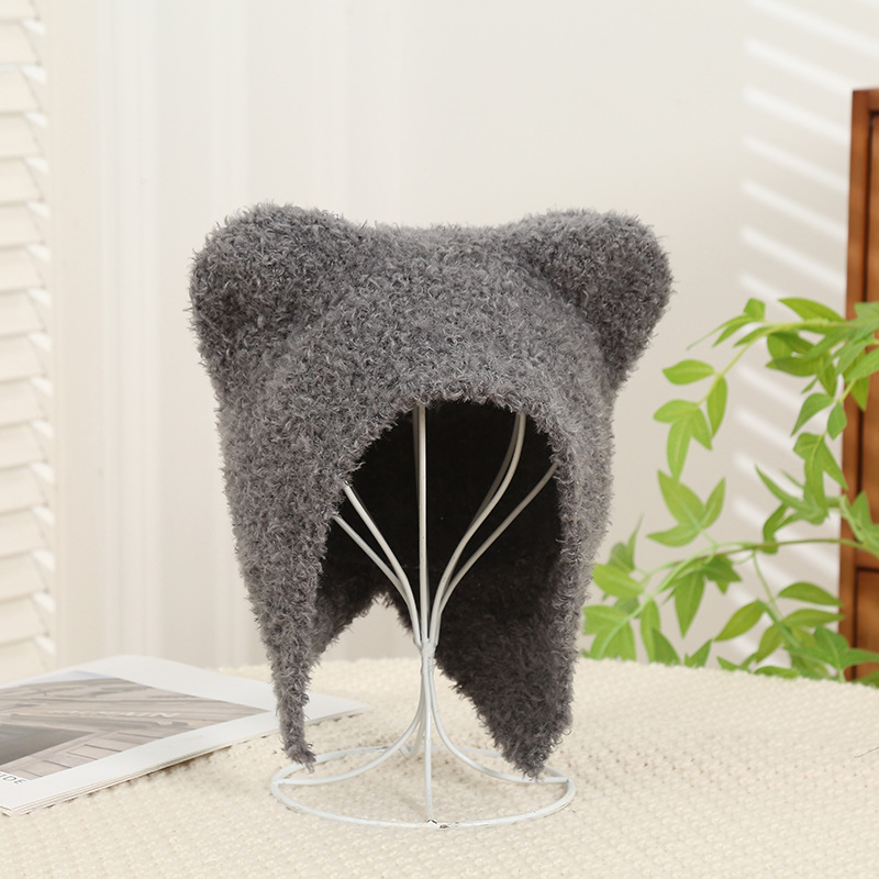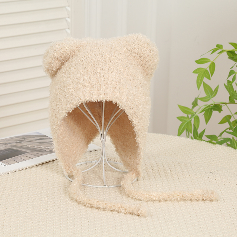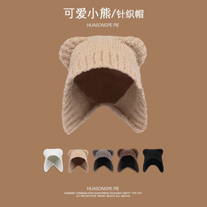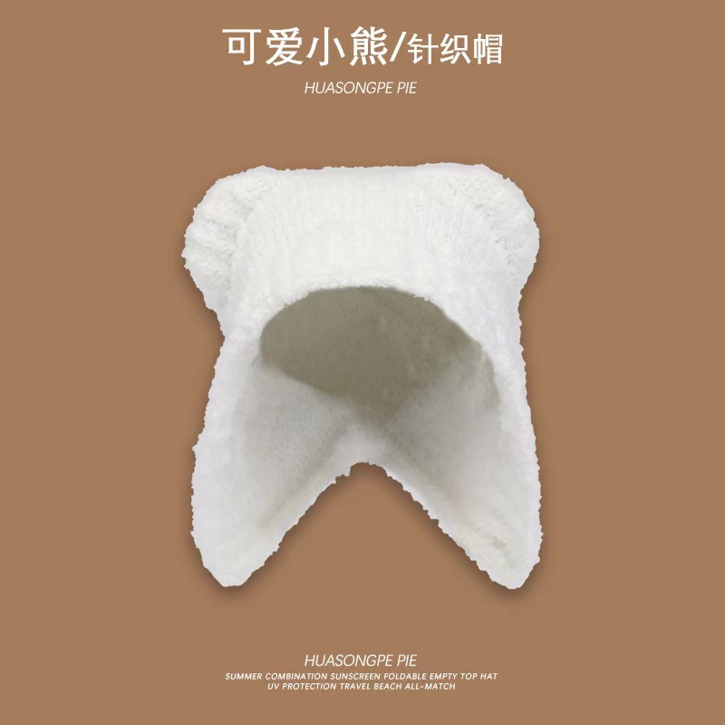 여성을위한 귀여운 곰 귀 모자 겨울 따뜻한 니트 귀 보호 모자 달콤하고 젊은 감기 방지 모직 모자 플러시