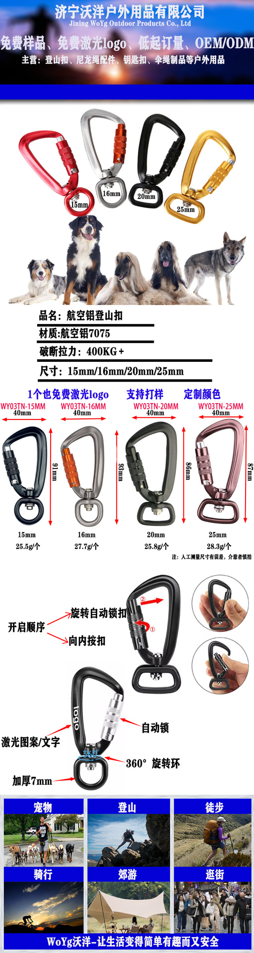 항공 알루미늄 회전 카라비너 16mm 회전 링 스프링 후크 자동 잠금 자물쇠 무료 레이저 로고 개