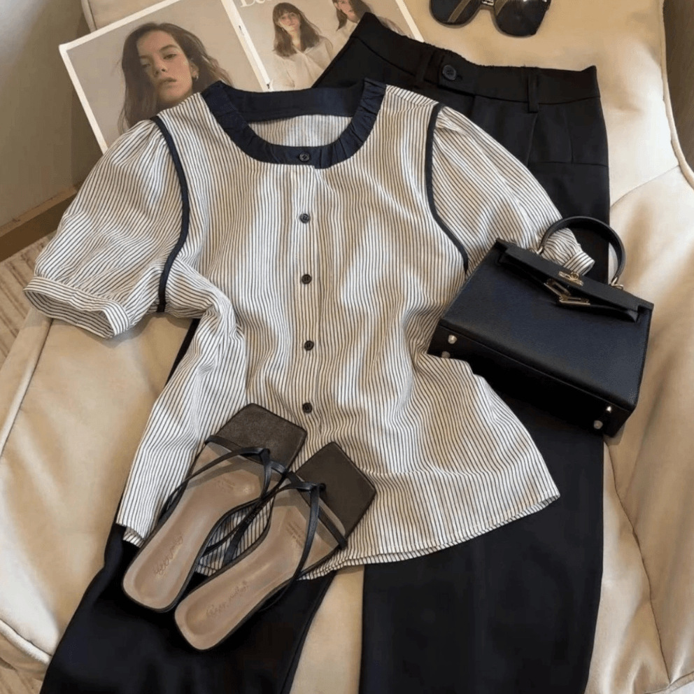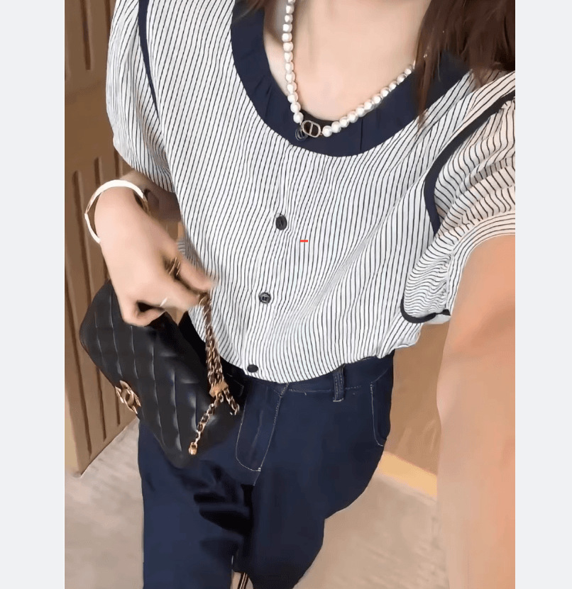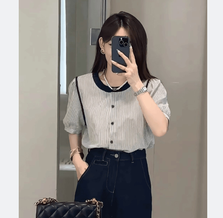 크루 넥 컬러 블록 반팔 줄무늬 셔츠 여성의 2024 여름 새로운 느슨한 슬리밍 캐주얼 퍼프 소매 작은 셔츠