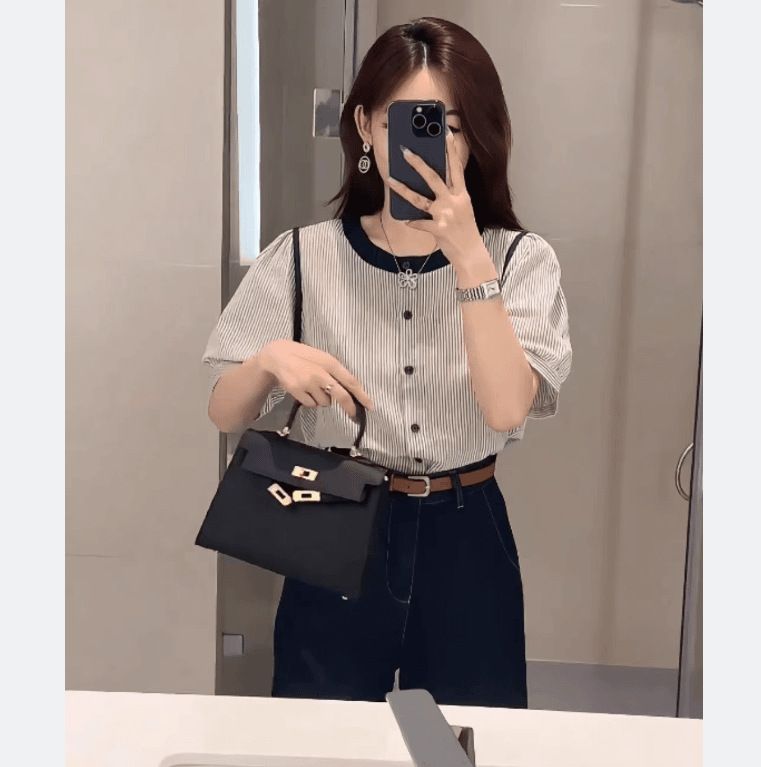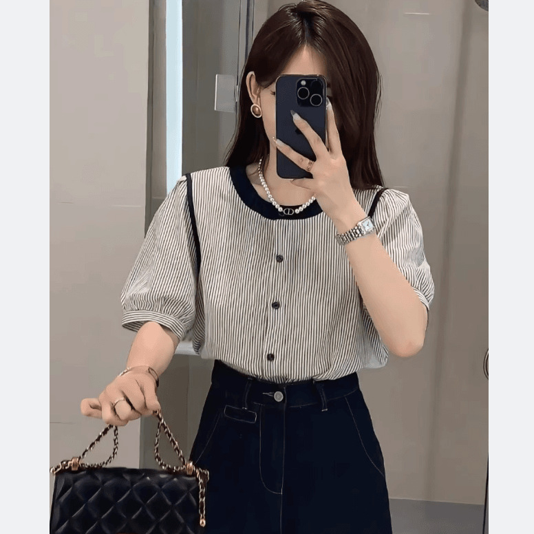 크루 넥 컬러 블록 반팔 줄무늬 셔츠 여성의 2024 여름 새로운 느슨한 슬리밍 캐주얼 퍼프 소매 작은 셔츠스토어 가기