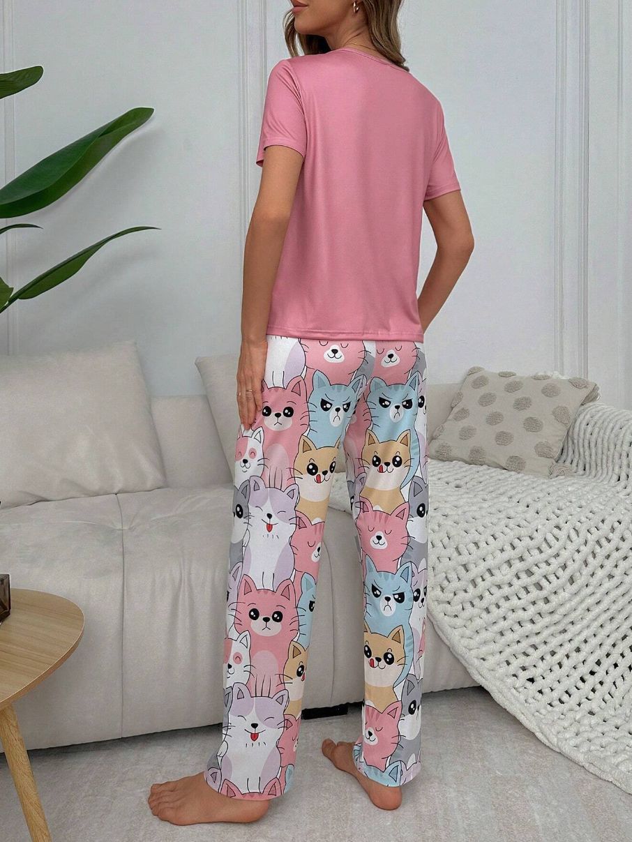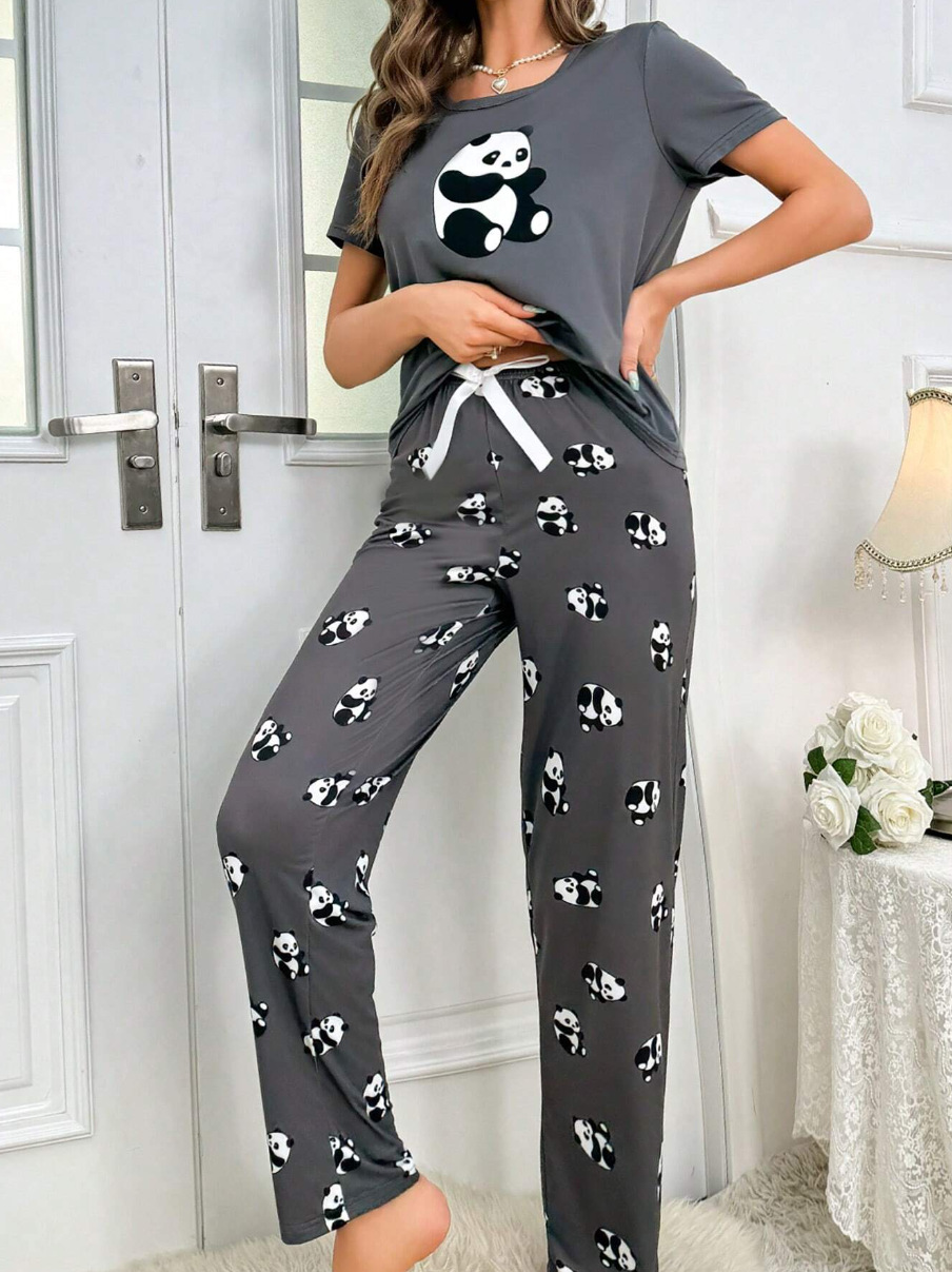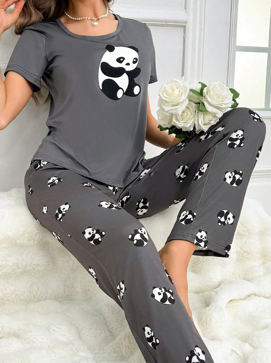 유럽과 미국의 신상 홈웨어 팬더 프린트 풀오버 반팔 티셔츠 긴바지 루즈핏 잠옷 세트 여성용