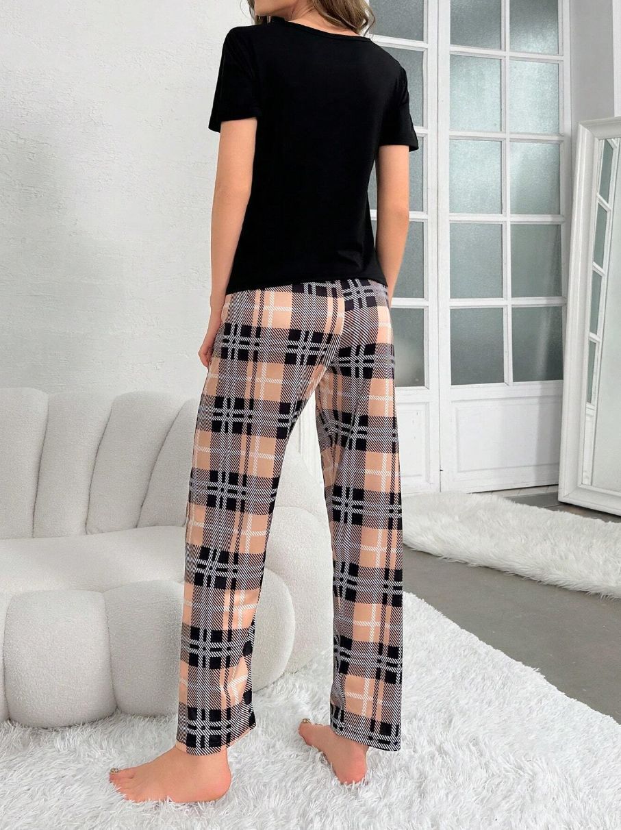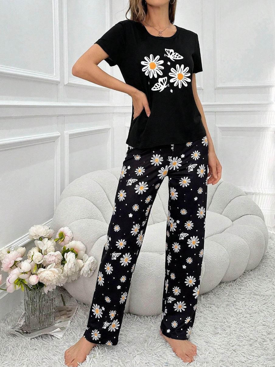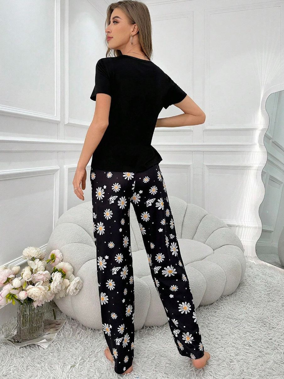 유럽과 미국의 신상 홈웨어 팬더 프린트 풀오버 반팔 티셔츠 긴바지 루즈핏 잠옷 세트 여성용