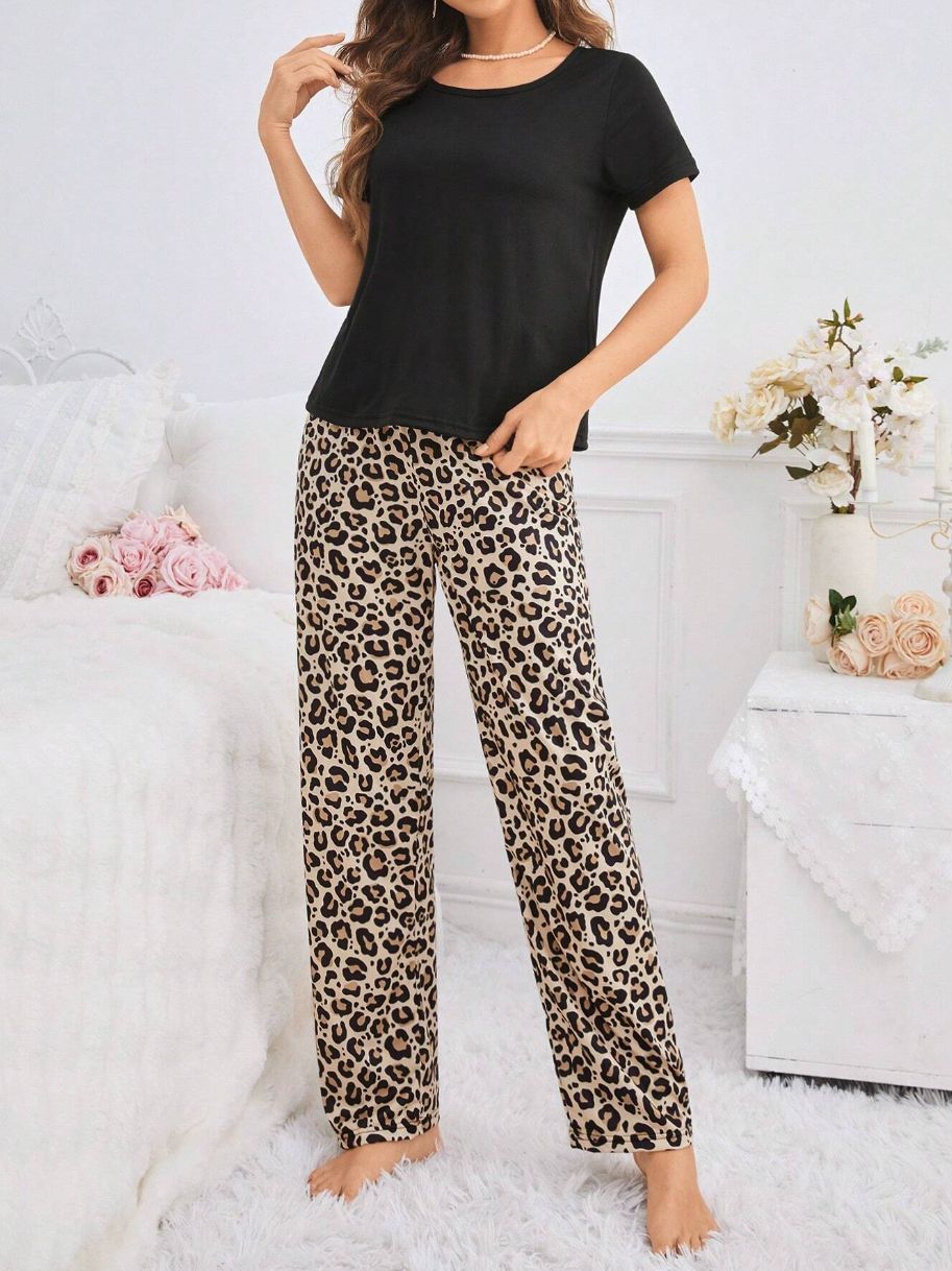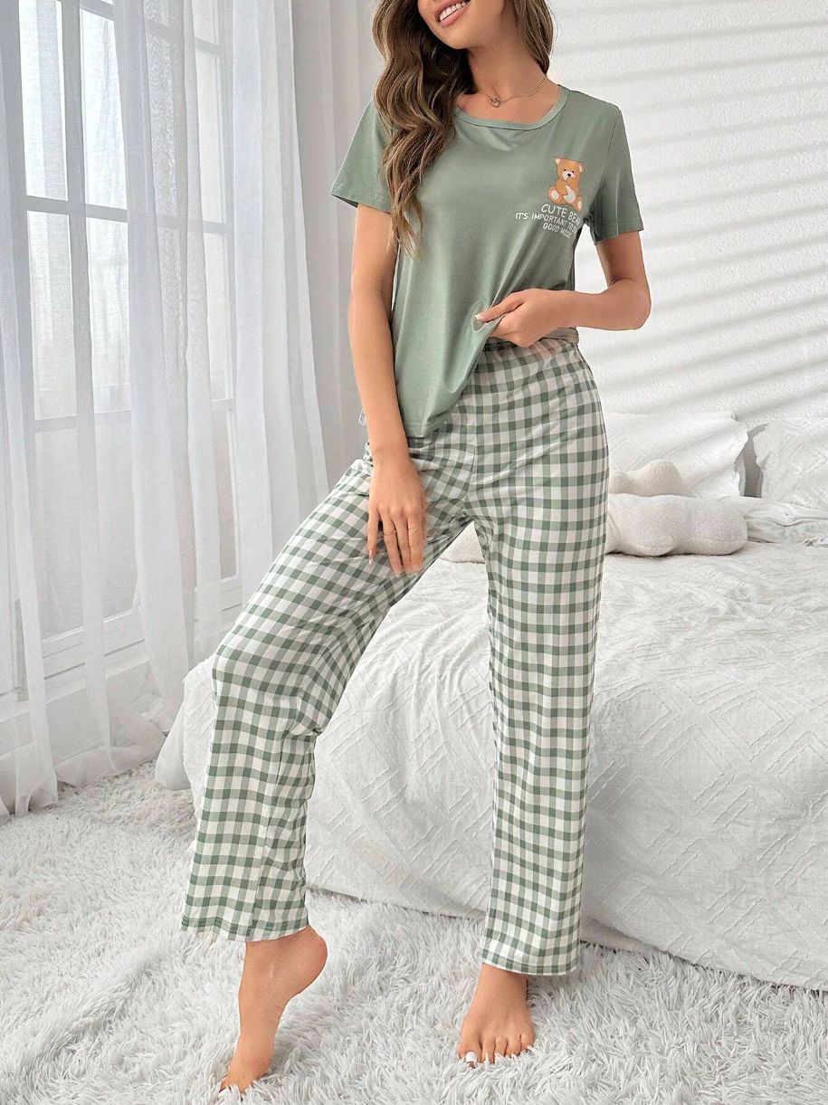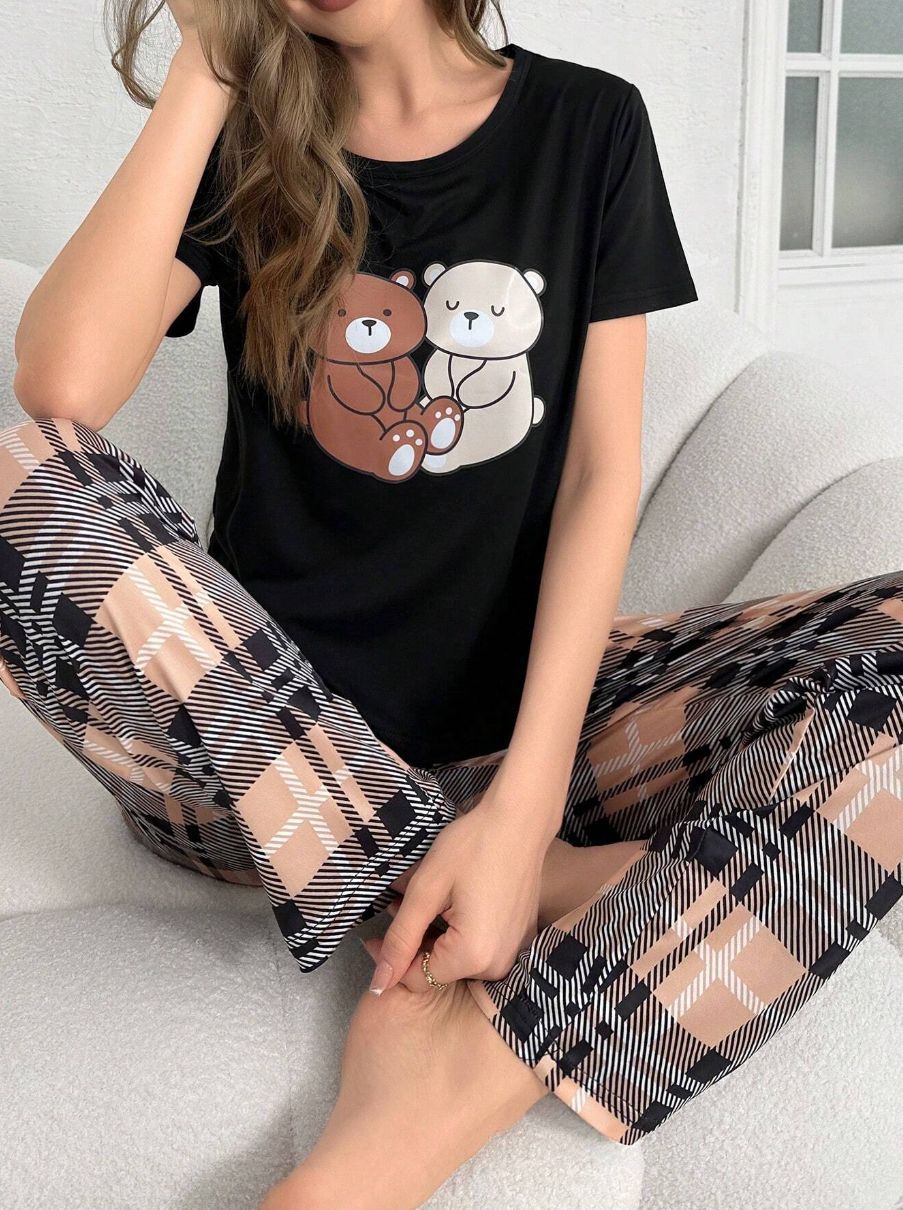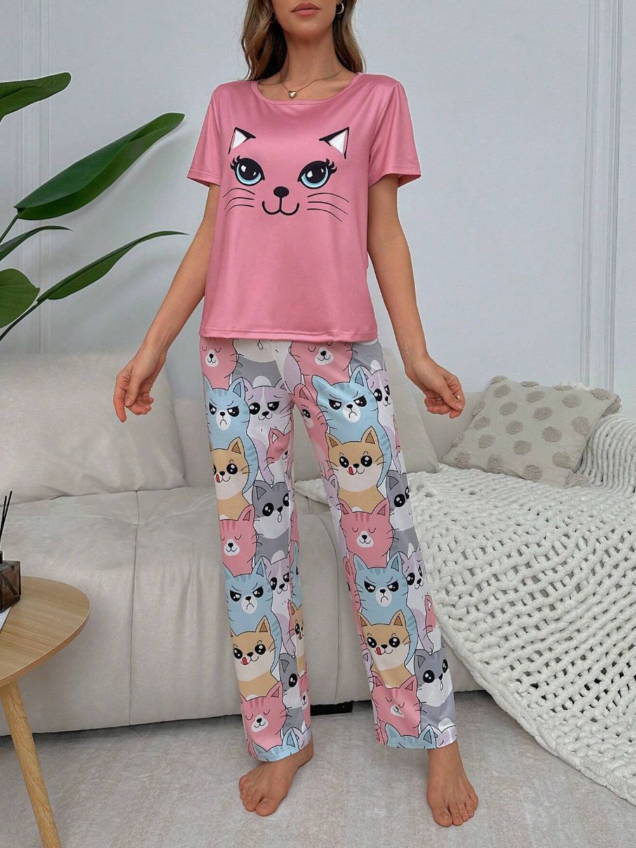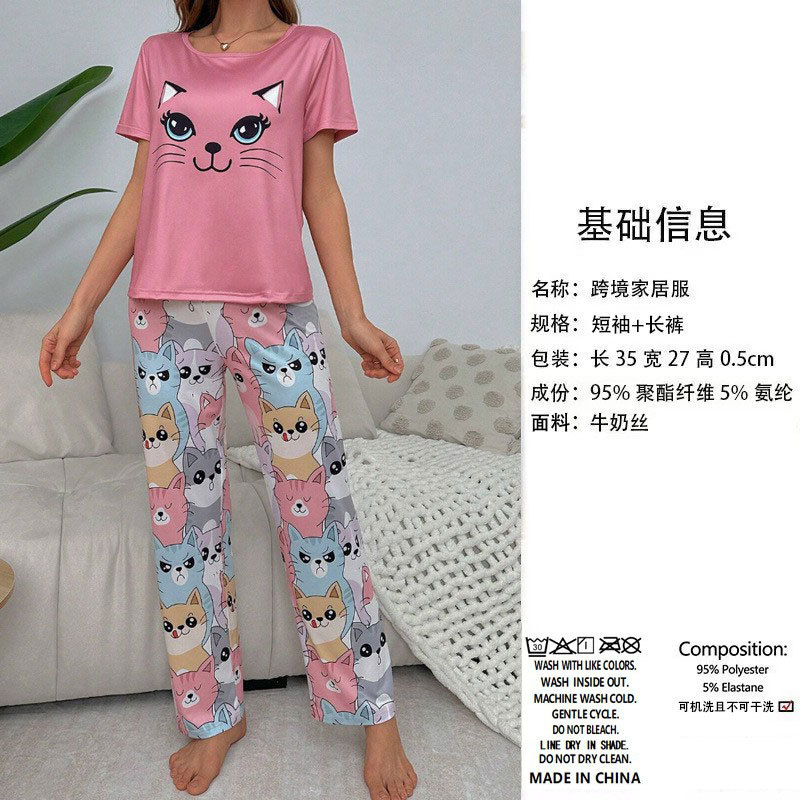 유럽과 미국의 신상 홈웨어 팬더 프린트 풀오버 반팔 티셔츠 긴바지 루즈핏 잠옷 세트 여성용스토어 가기