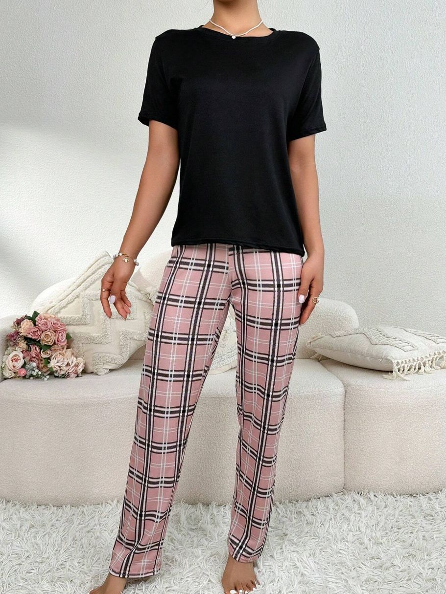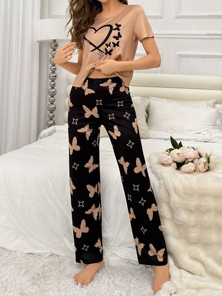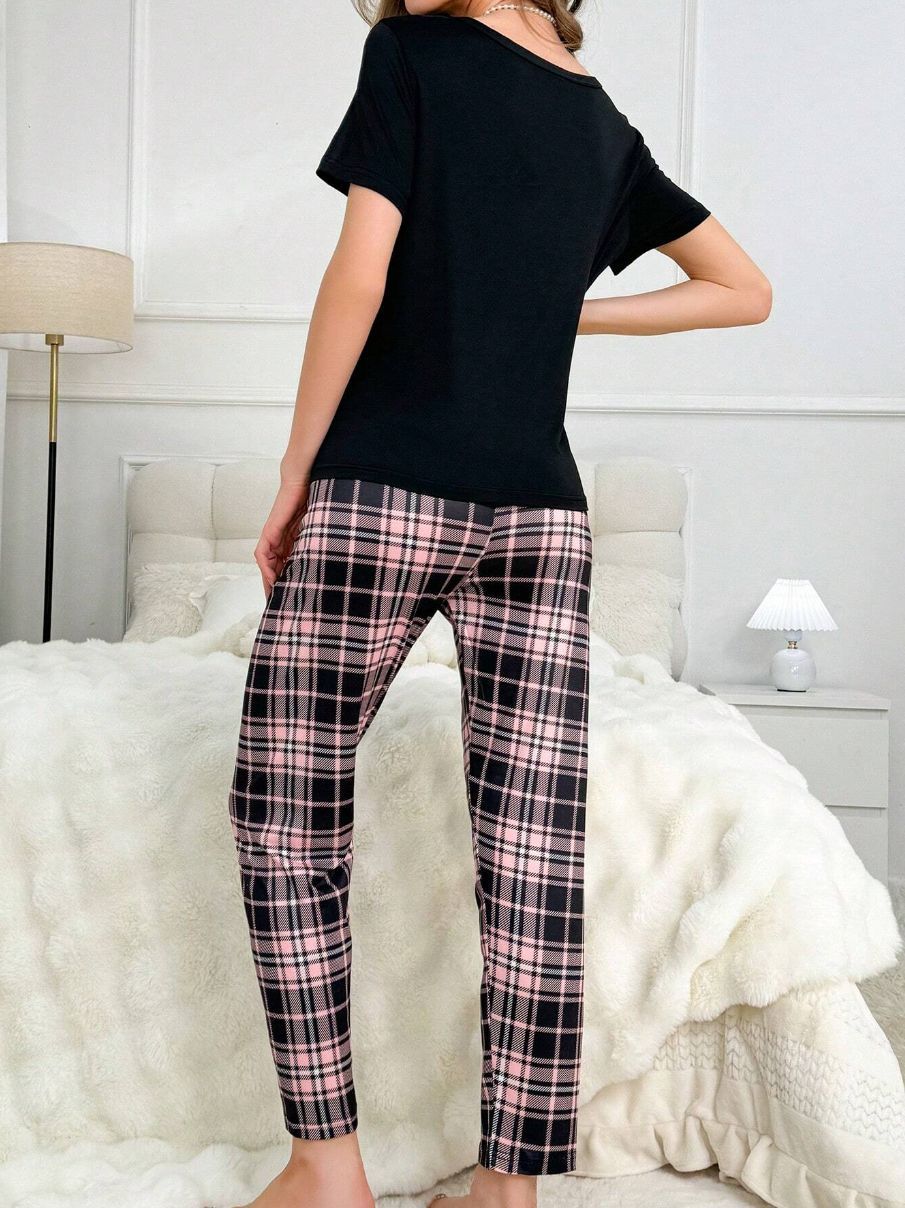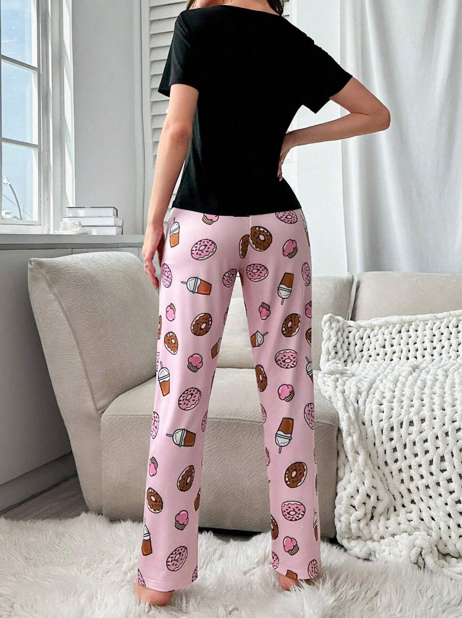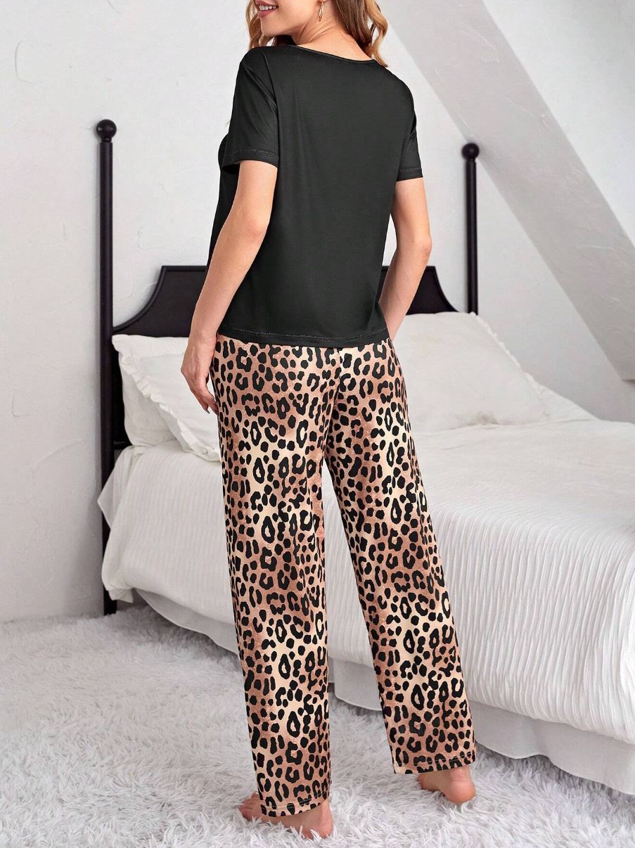 유럽과 미국의 신상 홈웨어 팬더 프린트 풀오버 반팔 티셔츠 긴바지 루즈핏 잠옷 세트 여성용스토어 가기