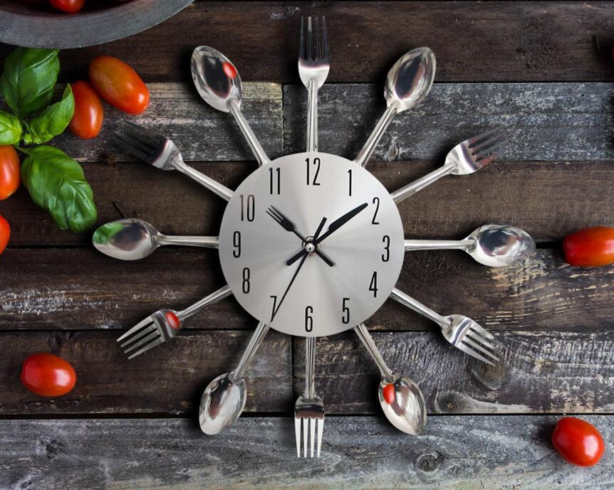 금속 스테인레스 스틸 나이프와 포크 시계 홈 장식 선물 공예 창조적 인 철 금속 입구 침묵 벽 시계스토어 가기