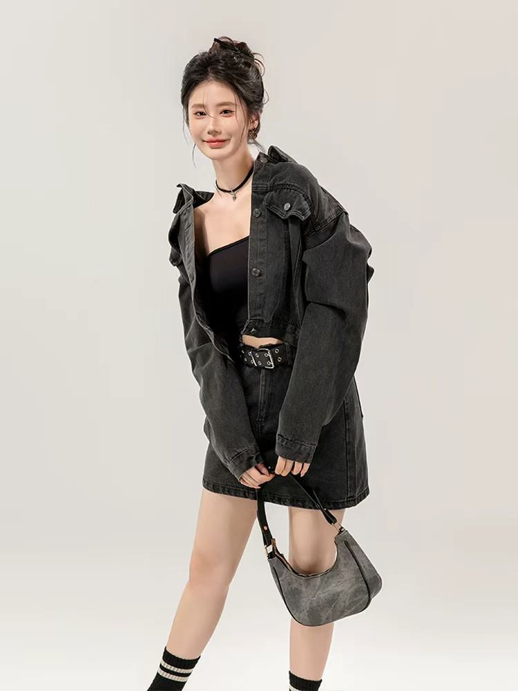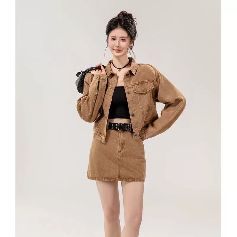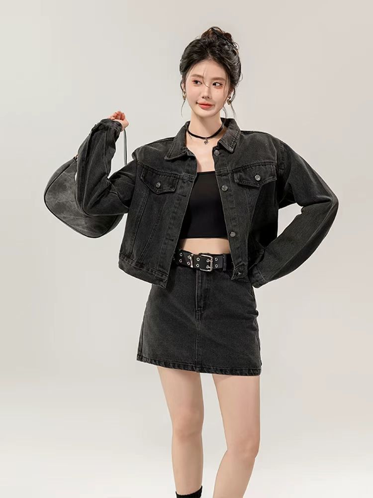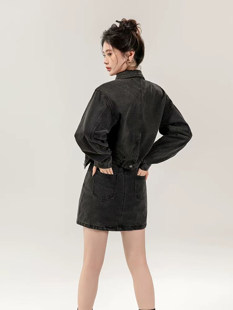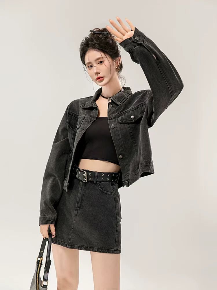 유럽 역 짧은 데님 코트 스커트 세트 여성의 초가을 새로운 빈티지 슬림핏 슬리밍 스커트 투피스 세트스토어 가기