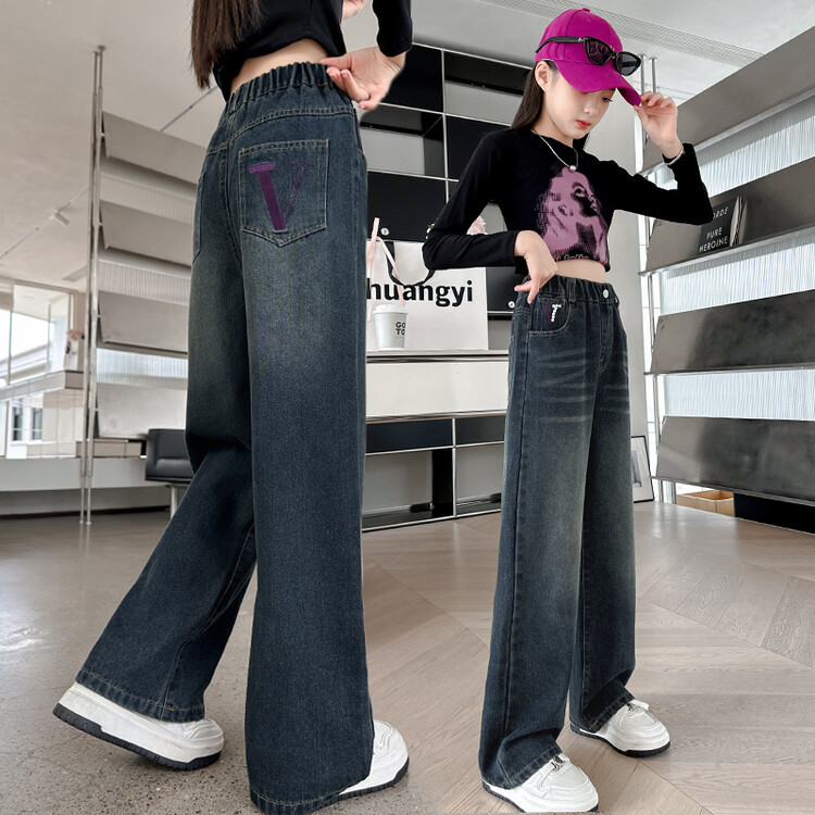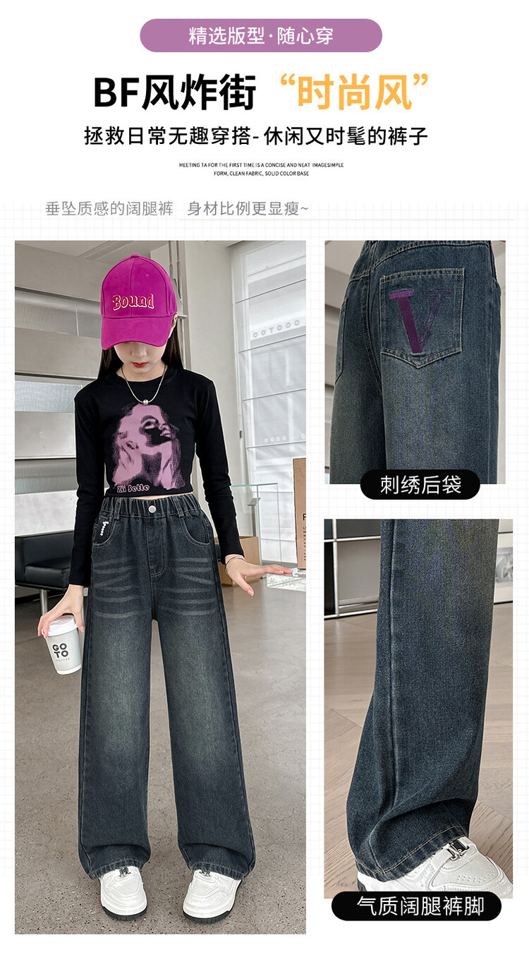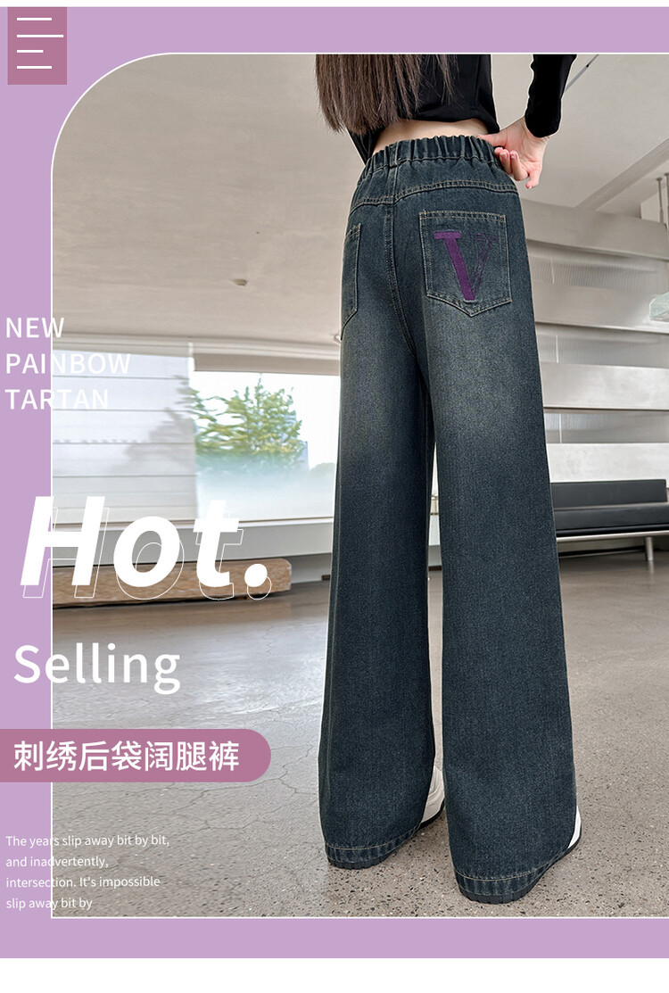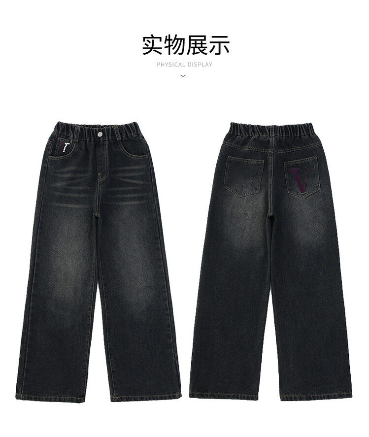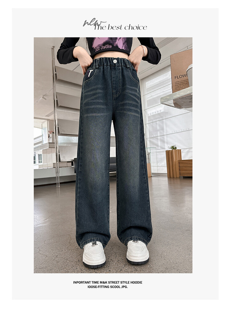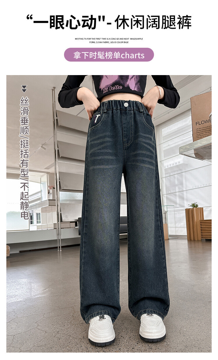 소녀 캐주얼 청바지 가을과 겨울 2024 새로운 서양식 바지 큰 어린이 스트레이트 기모 두꺼운 넓은 다리 바지스토어 가기
