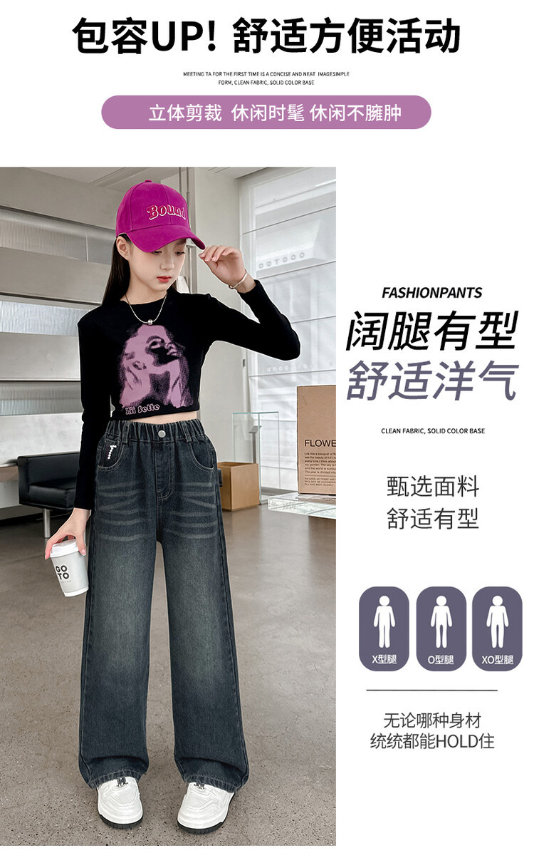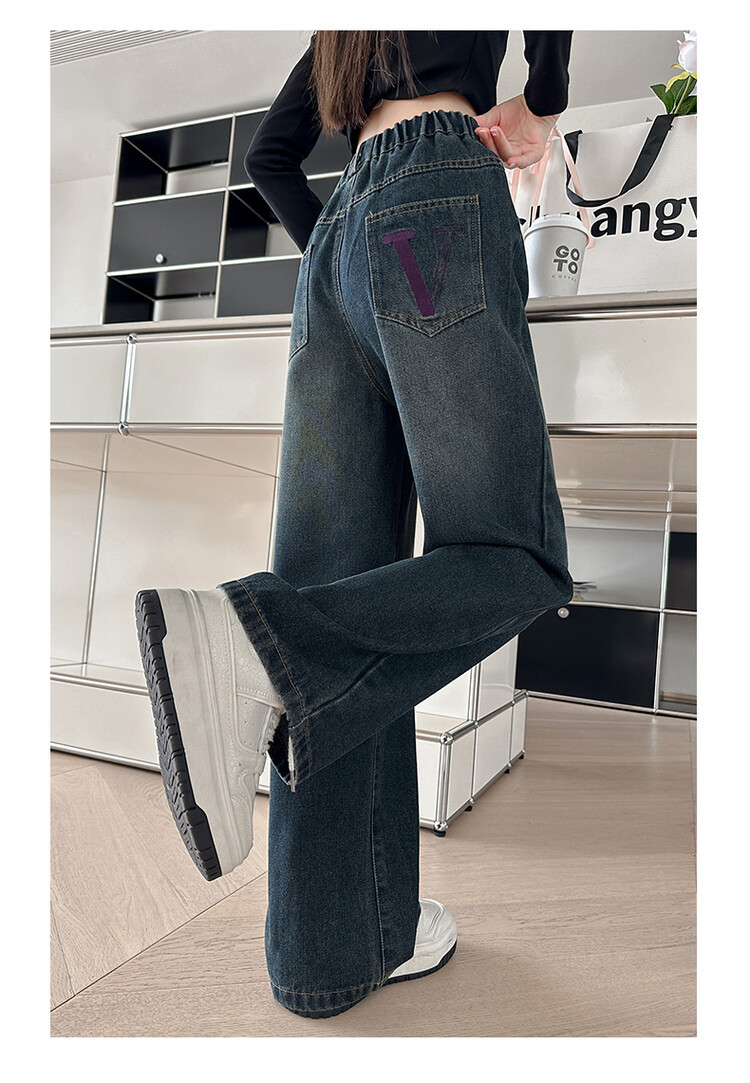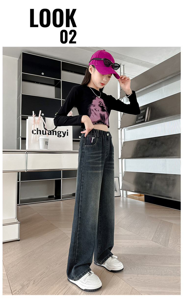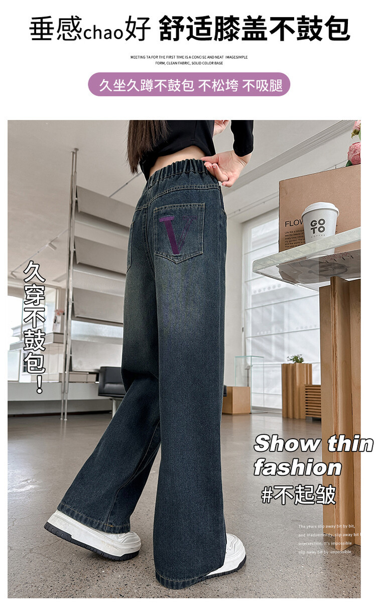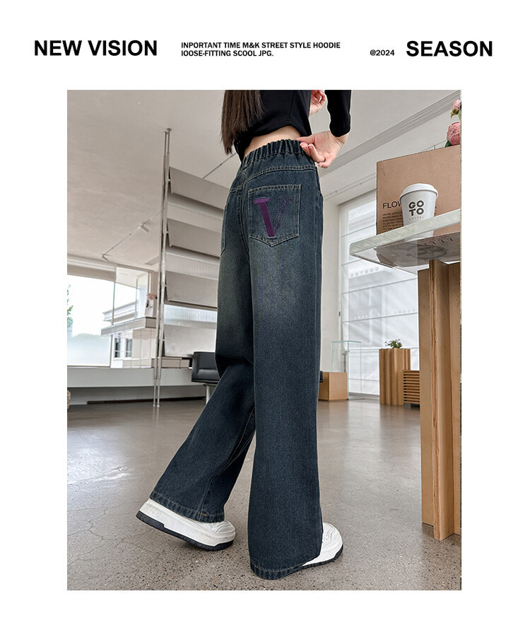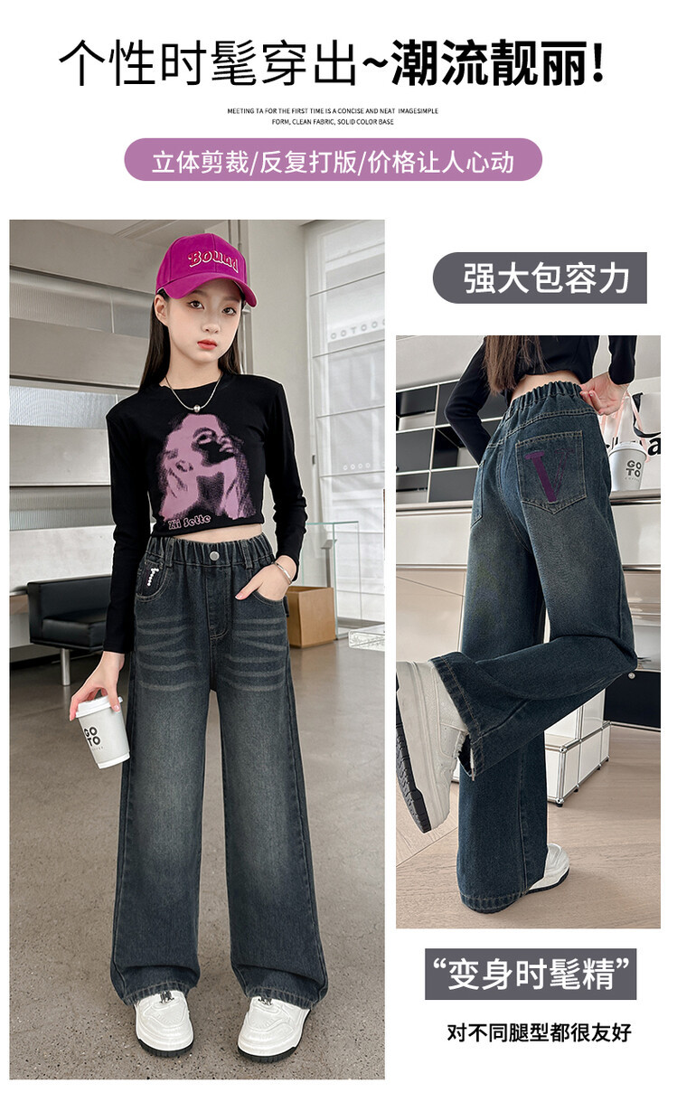 소녀 캐주얼 청바지 가을과 겨울 2024 새로운 서양식 바지 큰 어린이 스트레이트 기모 두꺼운 넓은 다리 바지스토어 가기