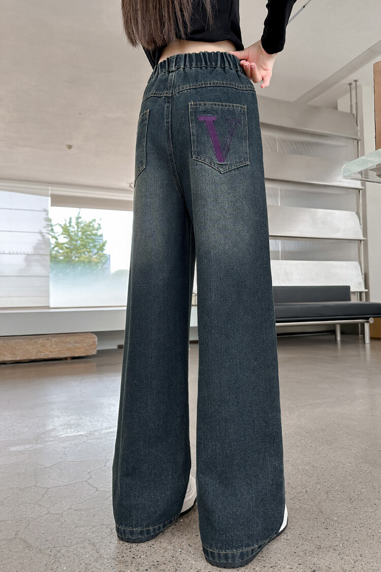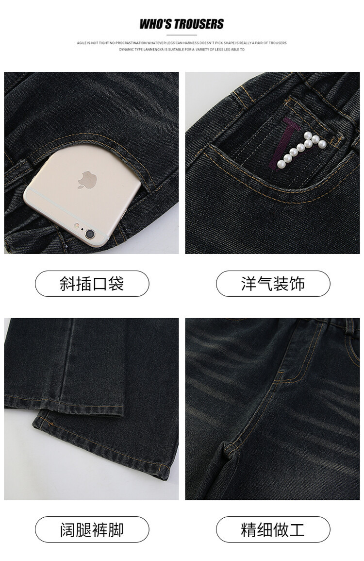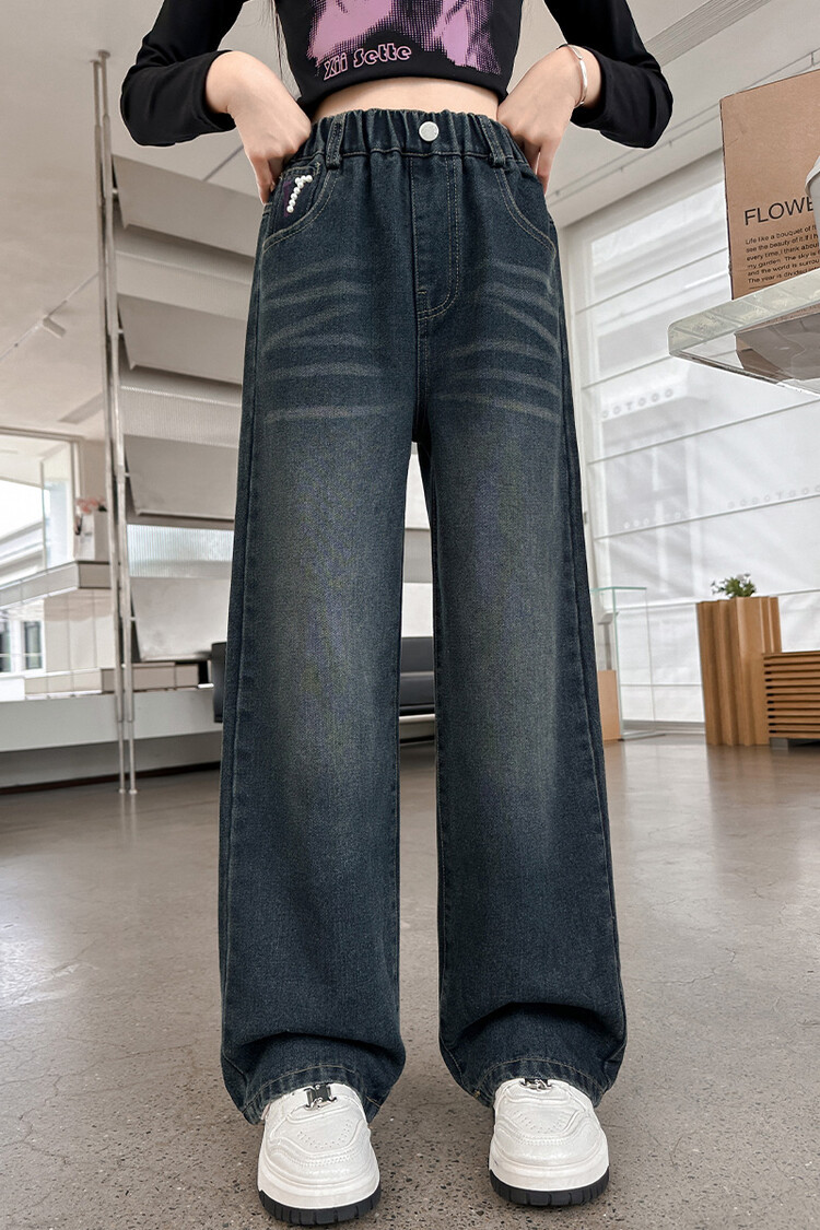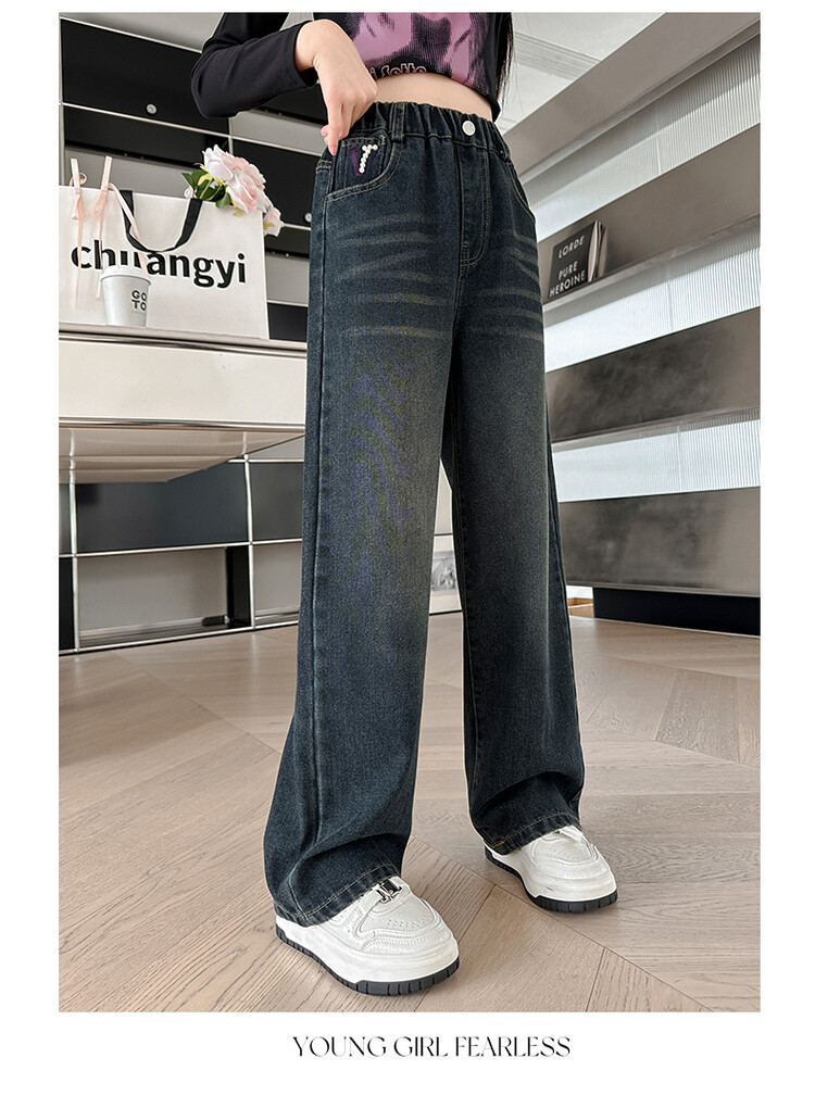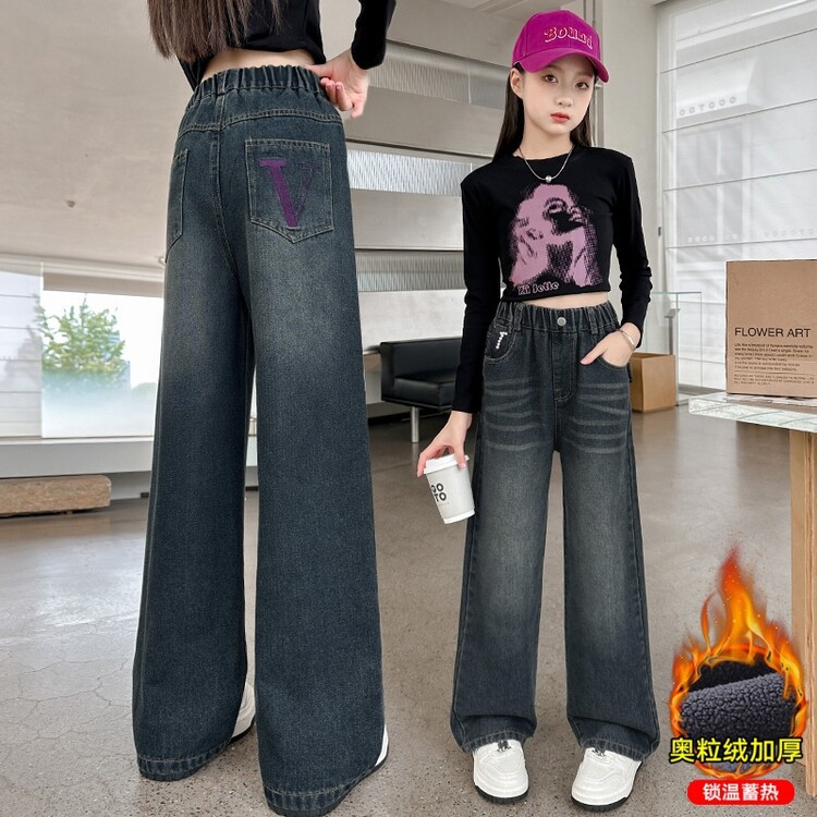 소녀 캐주얼 청바지 가을과 겨울 2024 새로운 서양식 바지 큰 어린이 스트레이트 기모 두꺼운 넓은 다리 바지