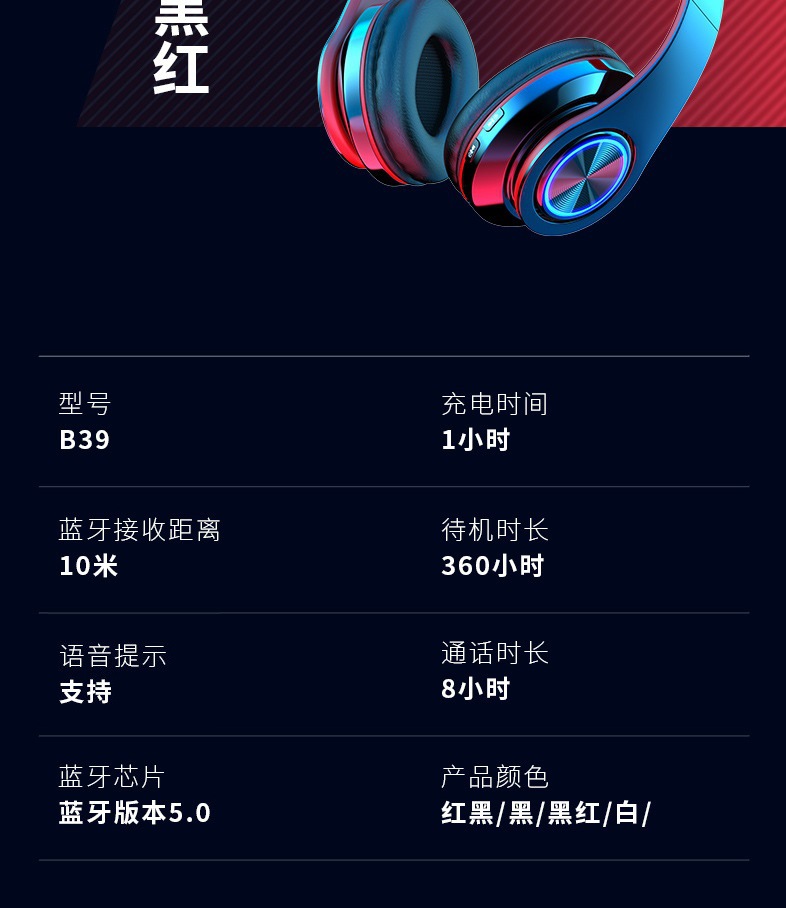 서브 우퍼 그물 붉은 국경 폭발 B39 발광 블루투스 헤드셋 긴 내구성 무선 헤드셋 제조 업체 도매