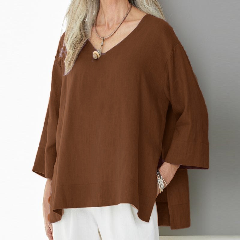 많은 수의 재고 국경 간 AliExpress Amazon V-넥 느슨한 분할 캐주얼 단색 면 린넨 탑스토어 가기