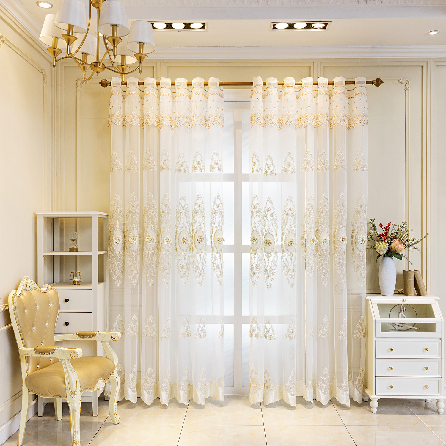국경 간 벨벳 자수 유럽 네일 비드 자수 투명 커튼 창 화면 발코니 거실 빌라 재고 도매 완료스토어 가기