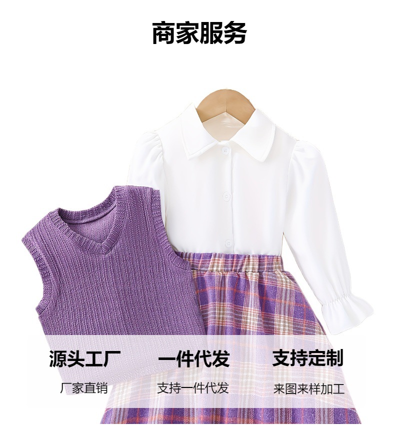 국경 간 소녀의 원피스 세트 한국식 다크 퍼플 니트 조끼 프레렐리스 원피스 인형 칼라 셔츠 아카데미 스타일 3 피스 세트스토어 가기