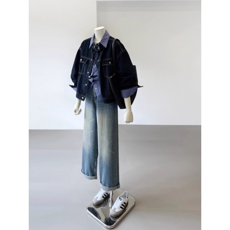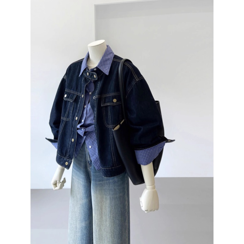 빈티지 유행 다크 블루 데님 재킷 여성의 2024 가을 새로운 작은 칼라 느슨한 싱글 브레스트 캐주얼 재킷스토어 가기