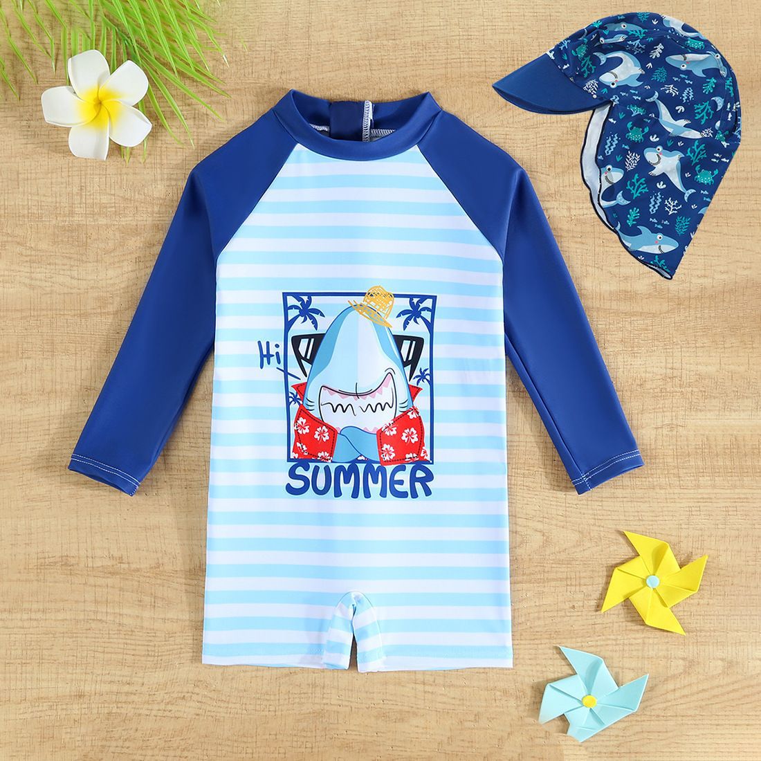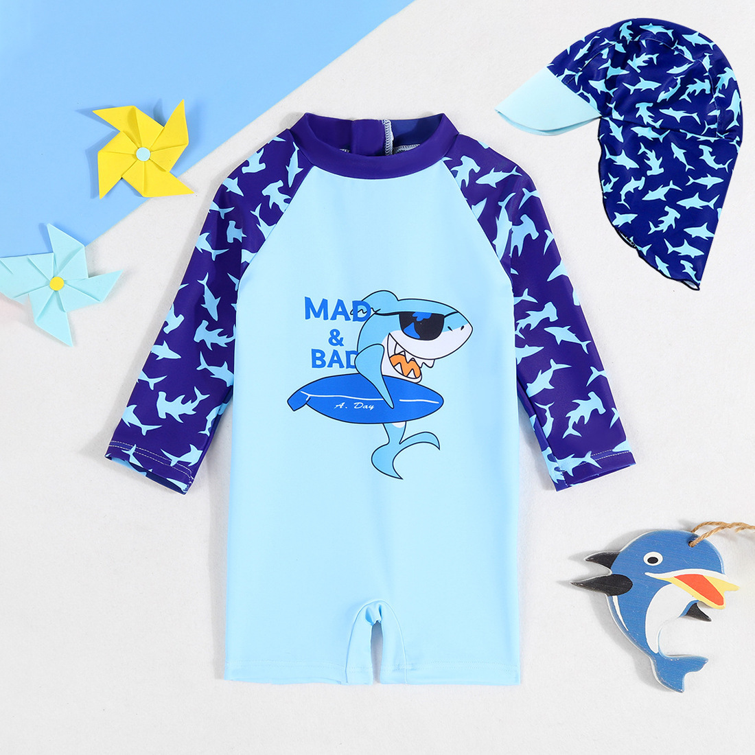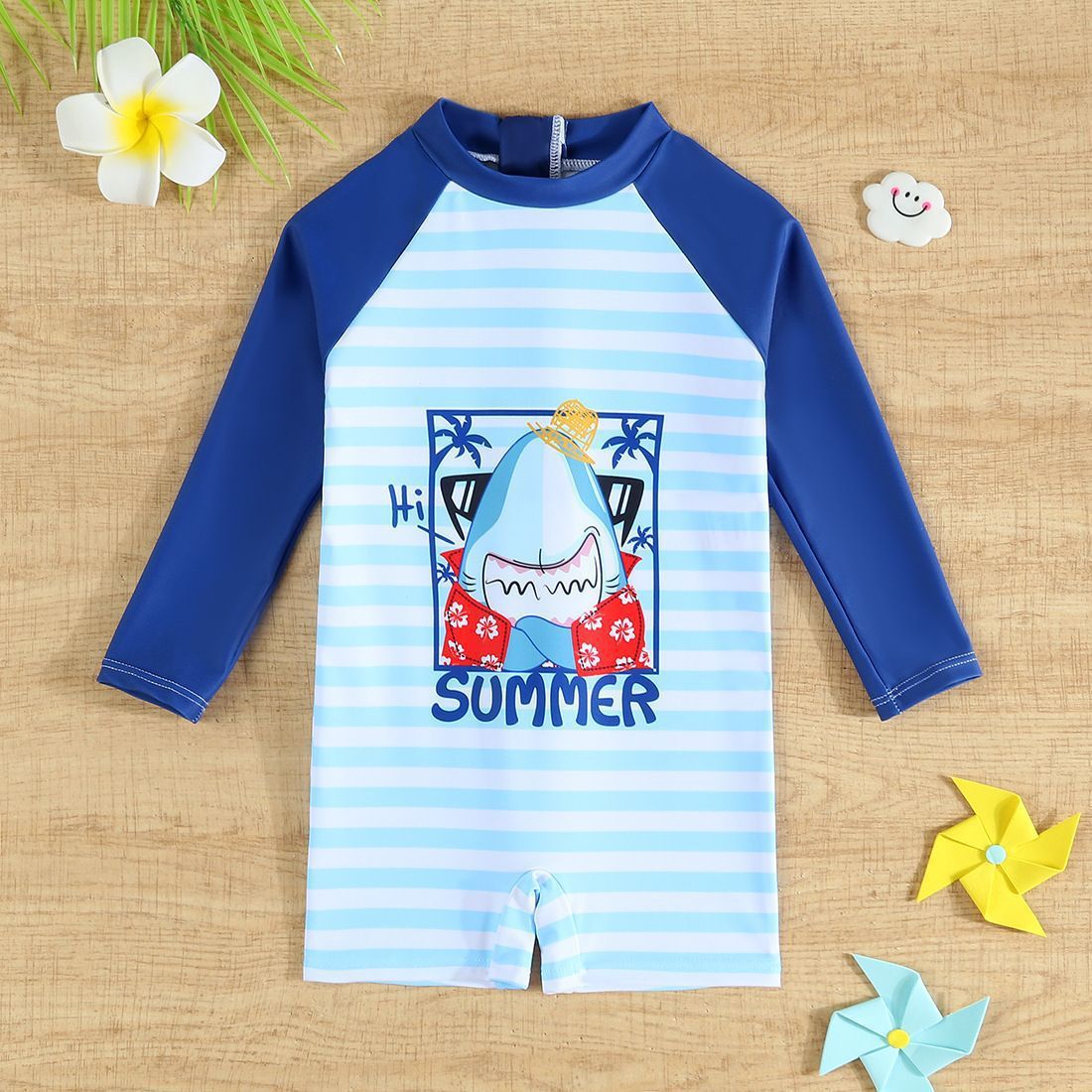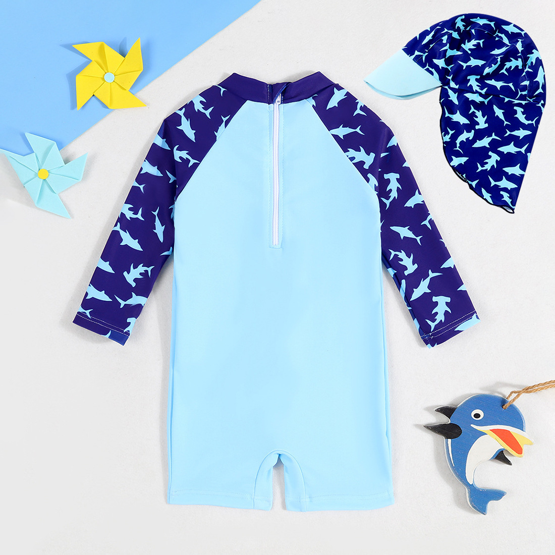 2024 어린이 수영복 소년 원피스 수영복 어린이 사이즈 지퍼 스케이트 보드 상어 모자