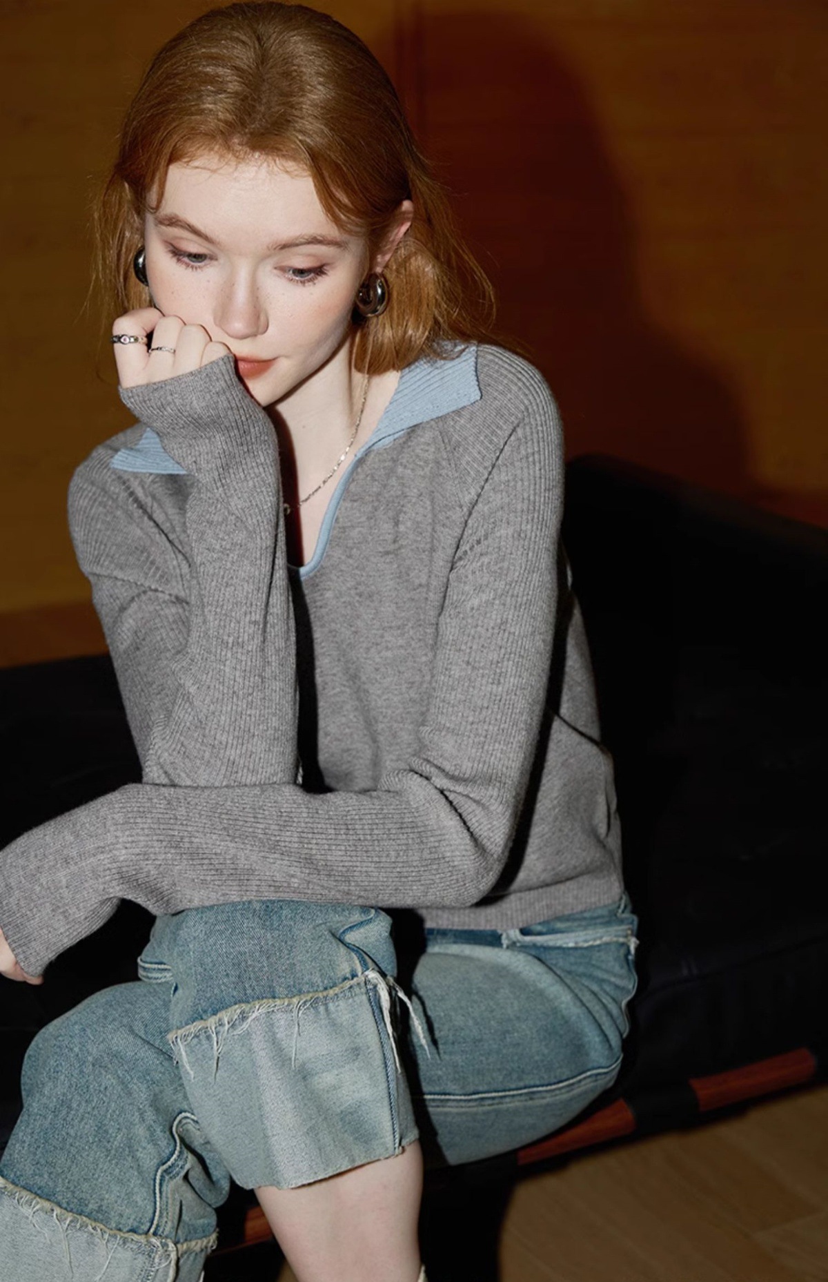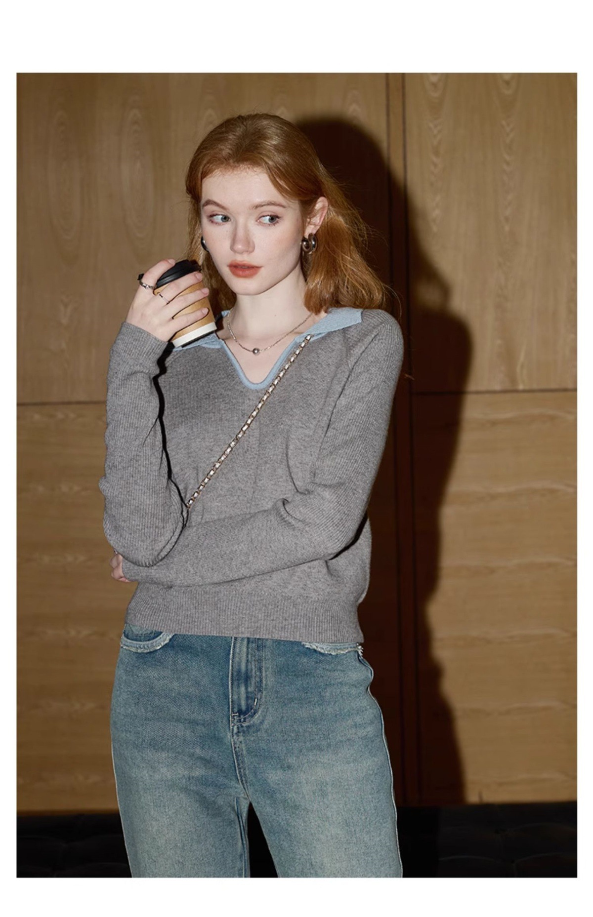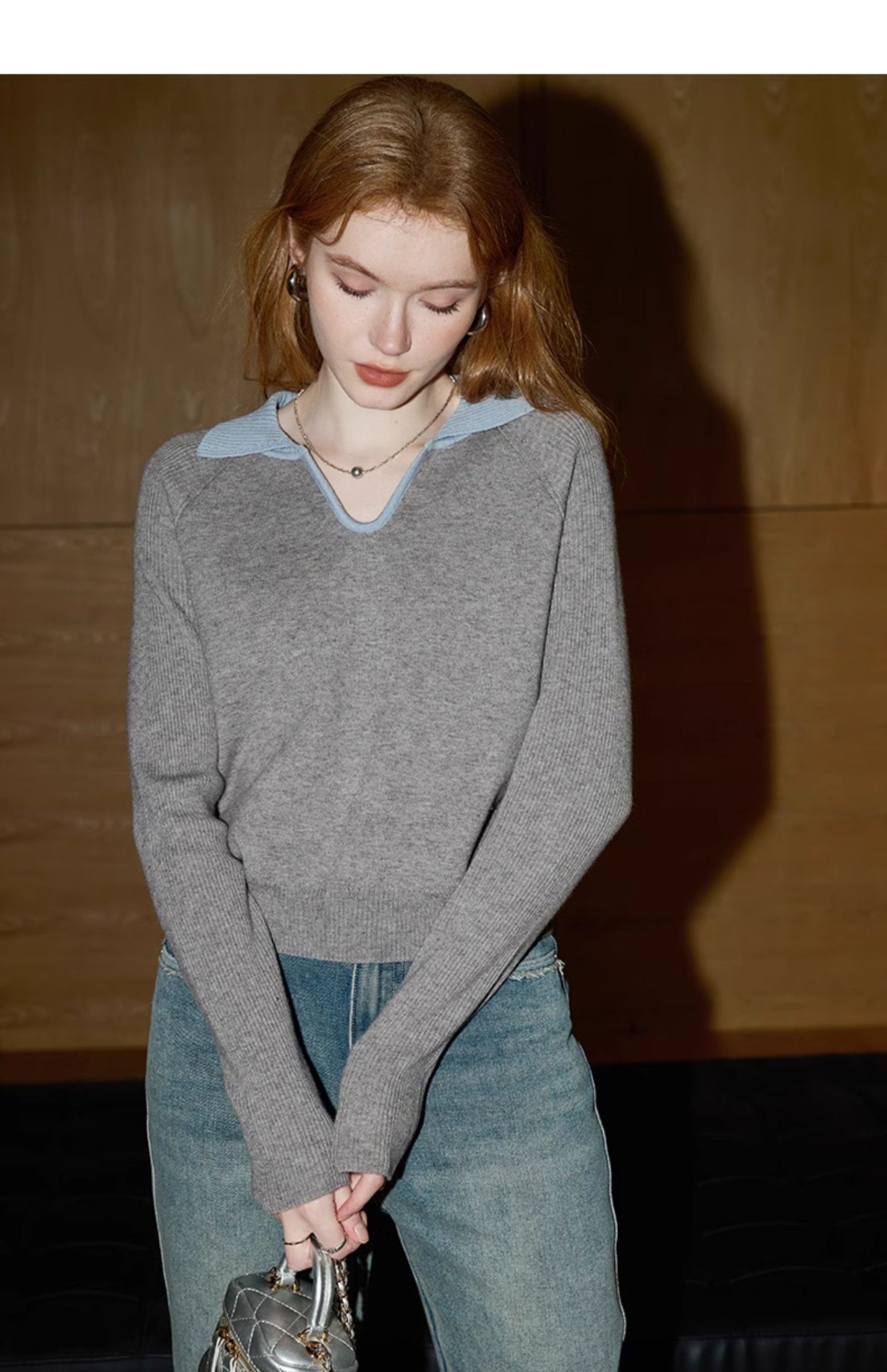 • 올해 유행하는 그레이 예쁜 니트 스웨터/시크한 스플라이싱 긴팔 탑/슬림 브이넥 숏탑