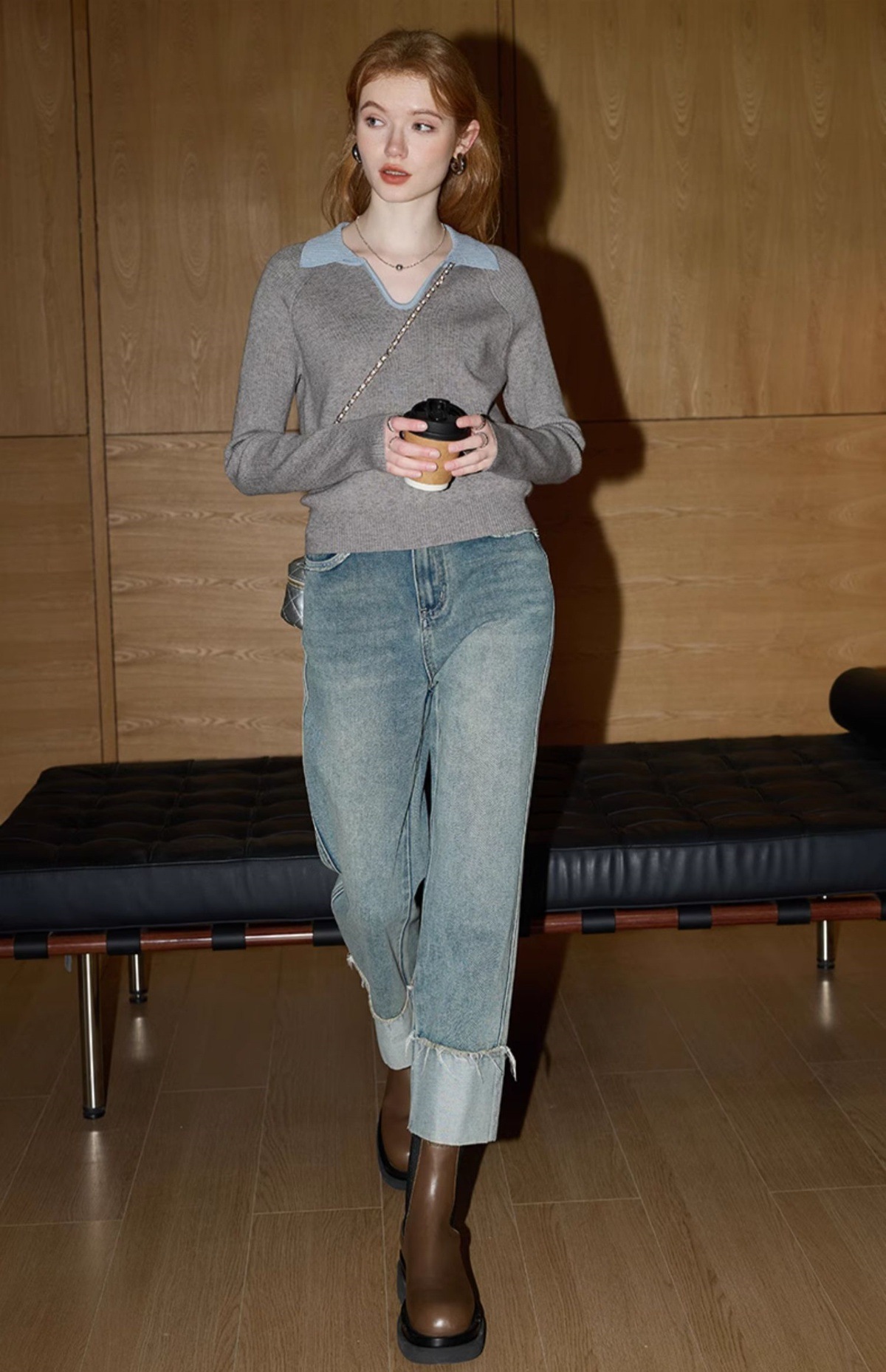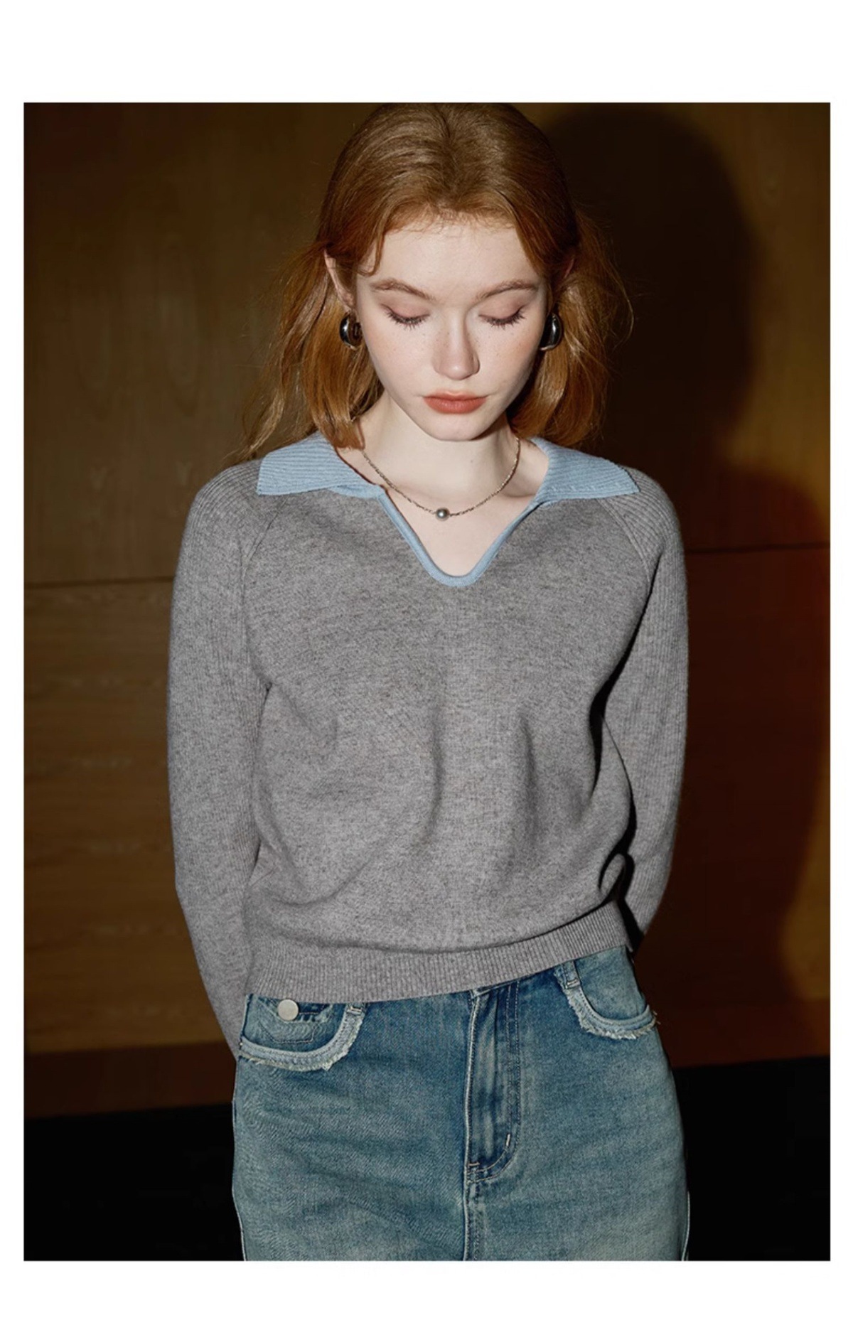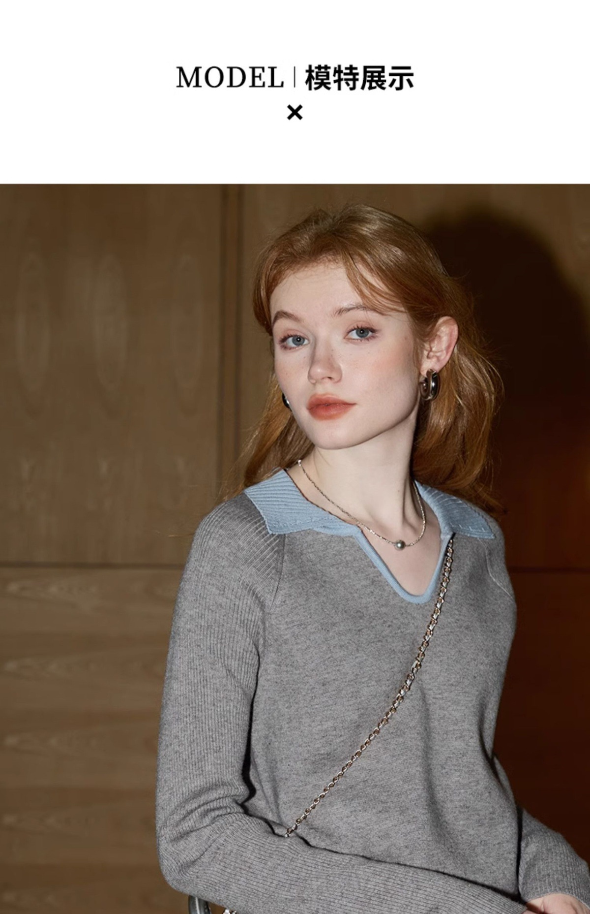 • 올해 유행하는 그레이 예쁜 니트 스웨터/시크한 스플라이싱 긴팔 탑/슬림 브이넥 숏탑
