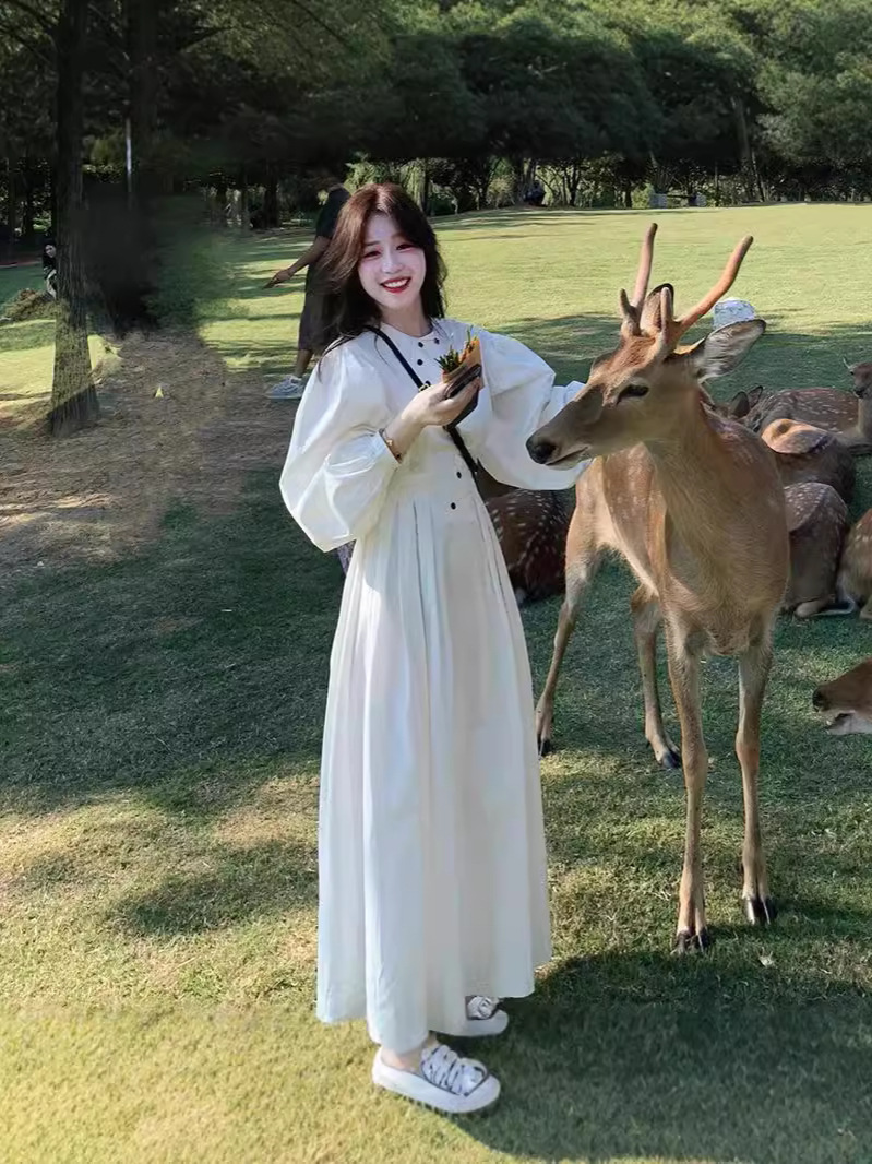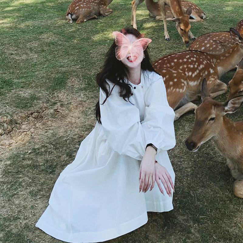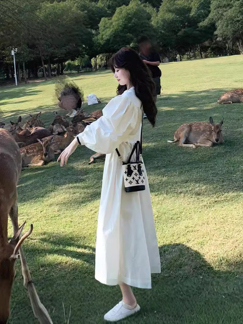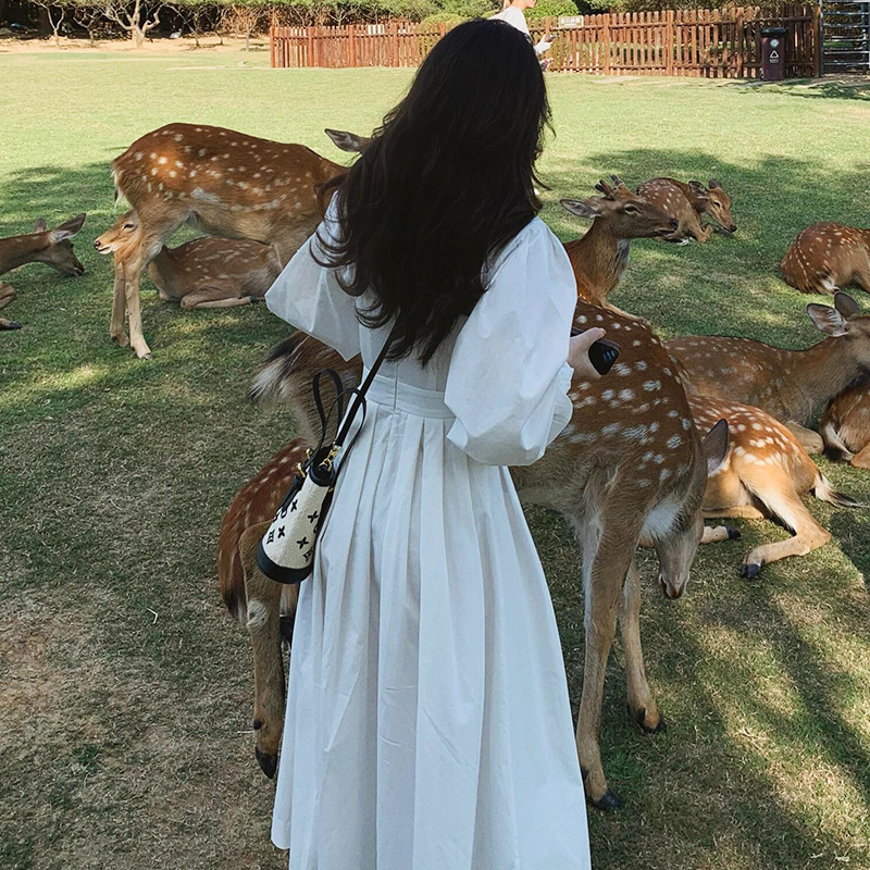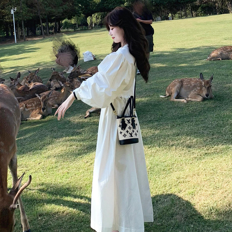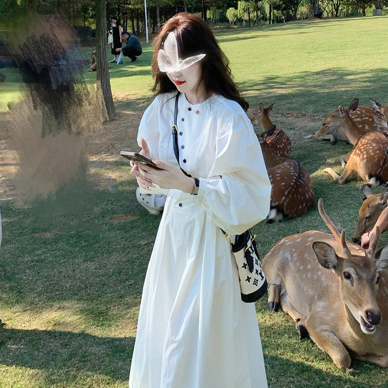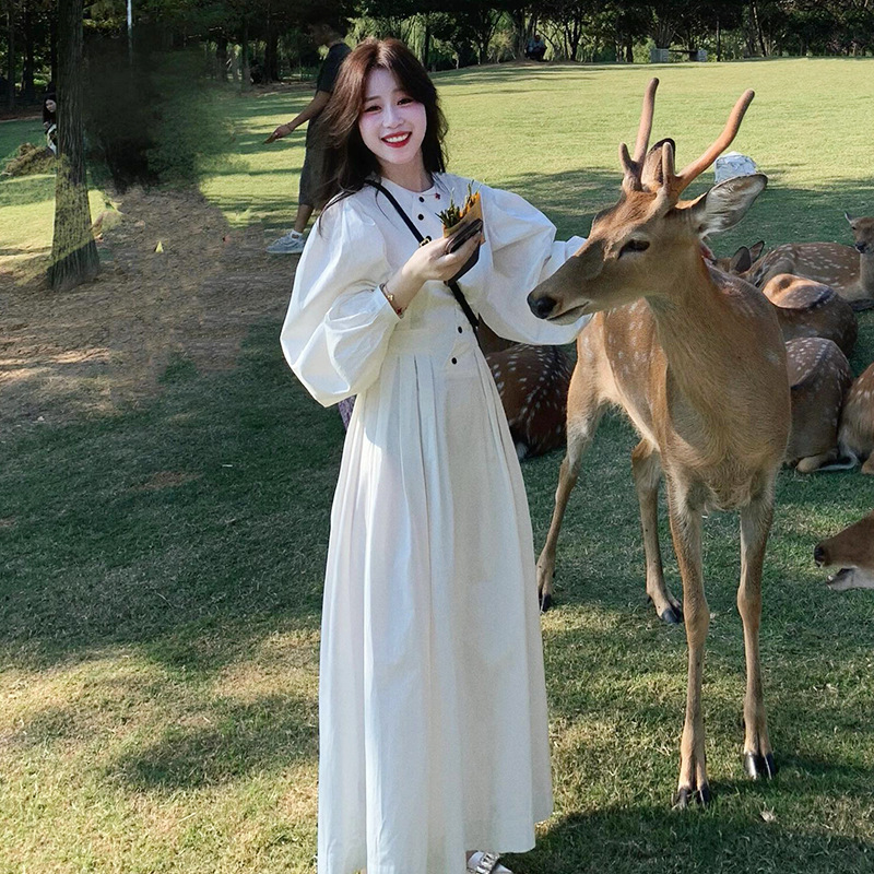 프랑스 스타일 차 브레이크 화이트 타이트 허리 긴팔 원피스 여성 가을 하이 엔드 우아한 슬리밍 롱 스커트스토어 가기