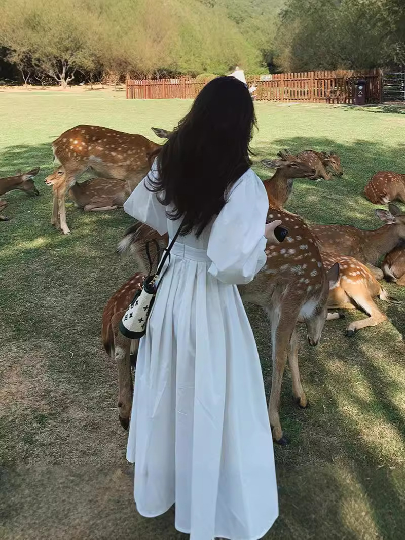 프랑스 스타일 차 브레이크 화이트 타이트 허리 긴팔 원피스 여성 가을 하이 엔드 우아한 슬리밍 롱 스커트
