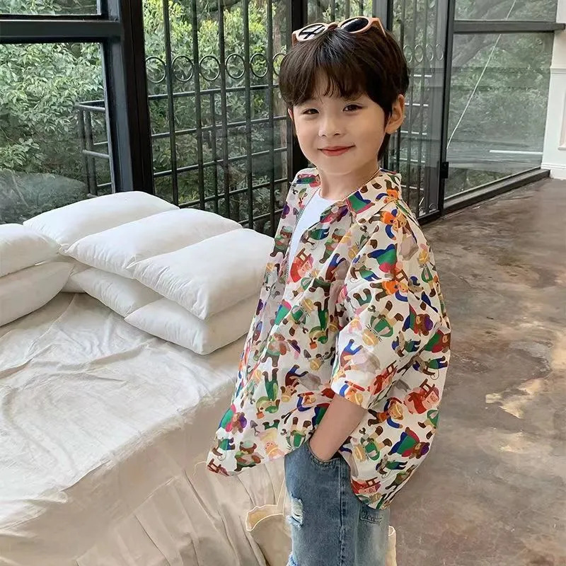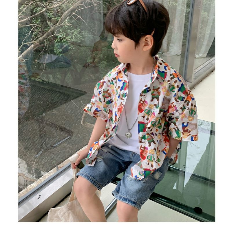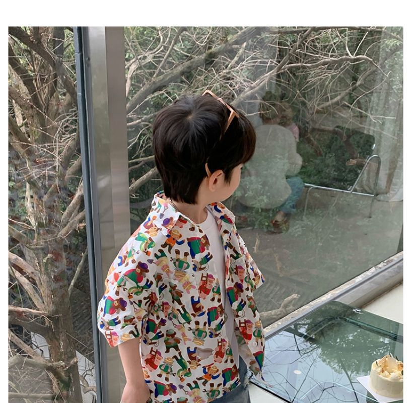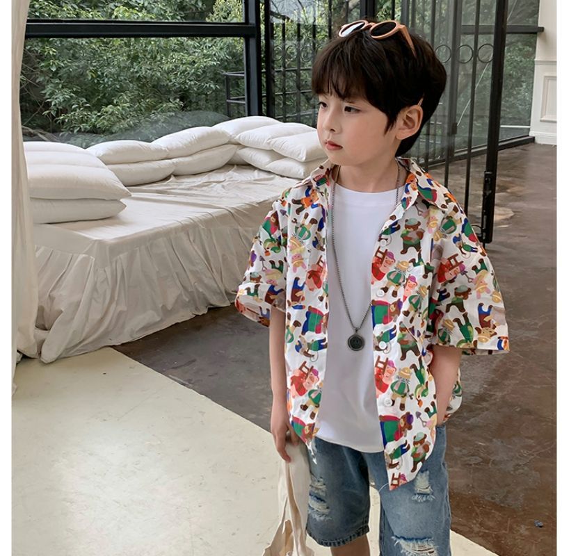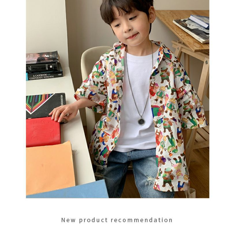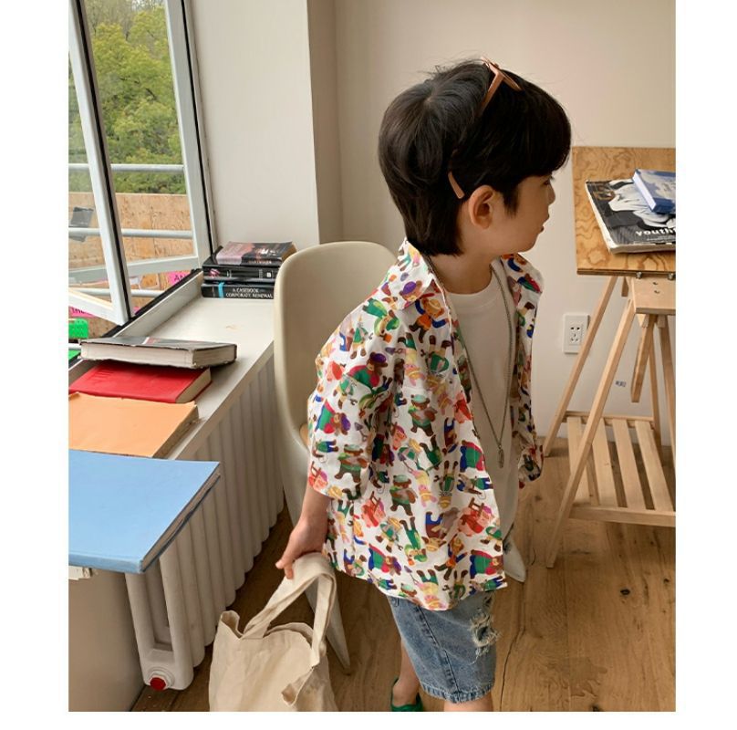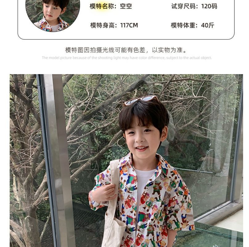 소년 반팔 꽃 셔츠 어린이 한국 스타일 셔츠 어린이 유행 여름 탑 만화 2023 새로운 아기의 탑