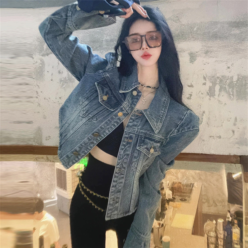 중공업 직각 어깨 자켓 짧은 데님 재킷 여성 아메리칸 스타일 레트로 느슨한 캐주얼 어깨 패드 재킷 탑스토어 가기