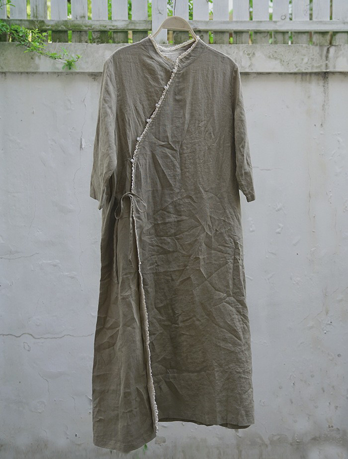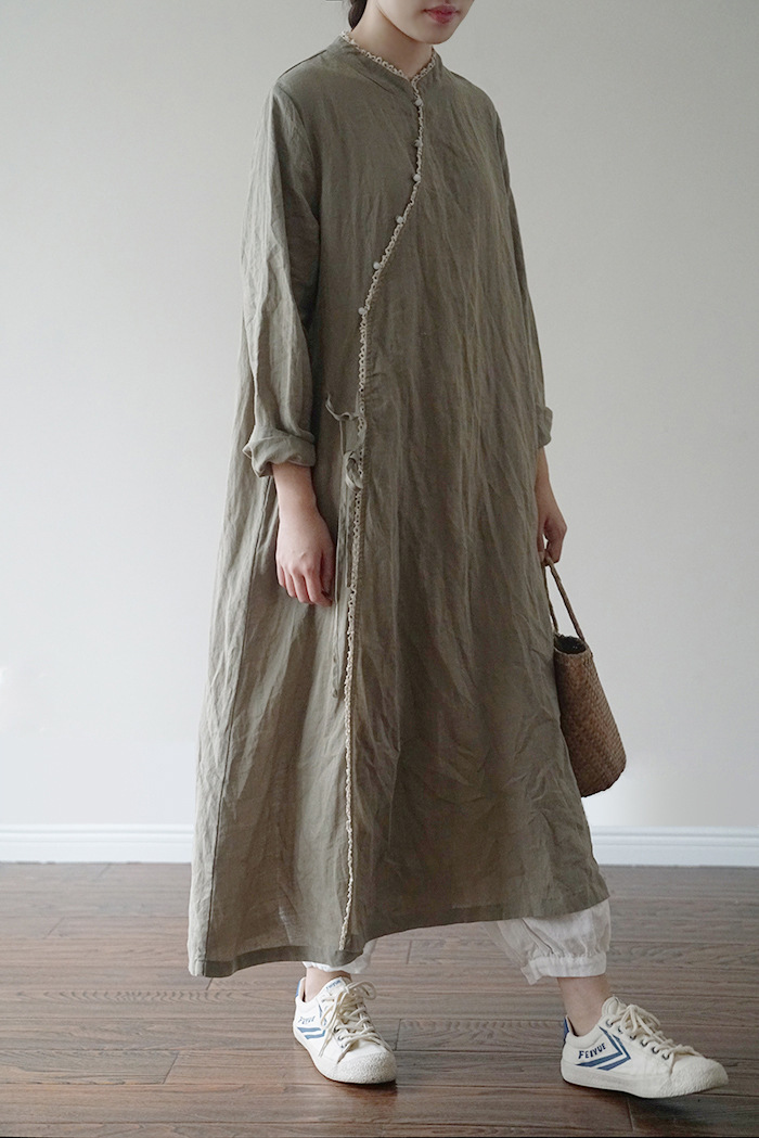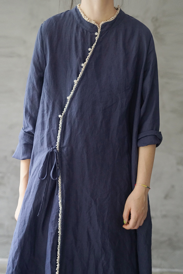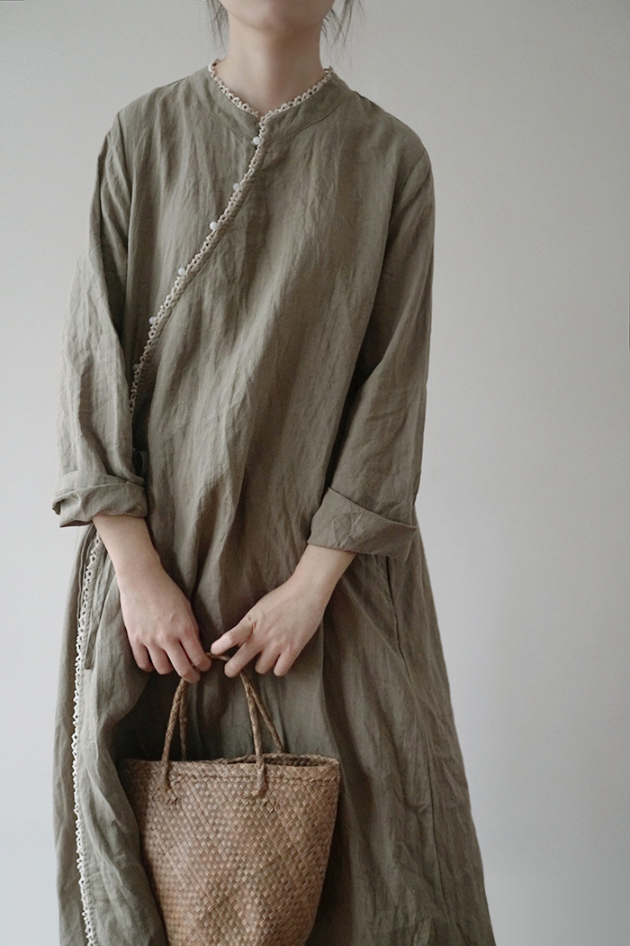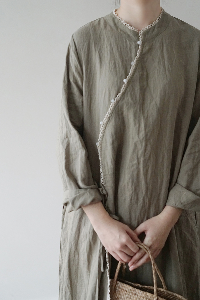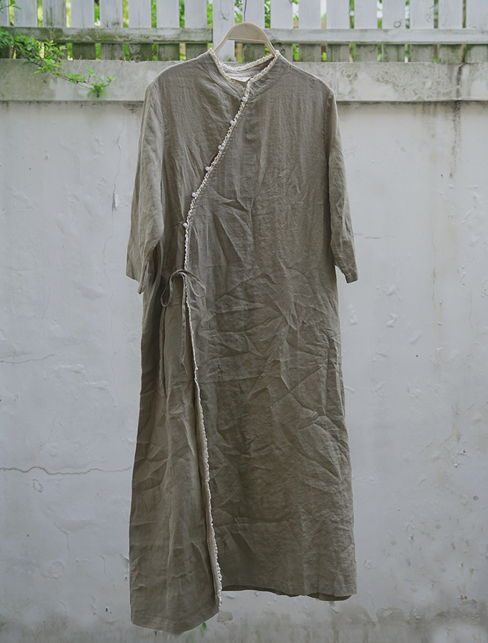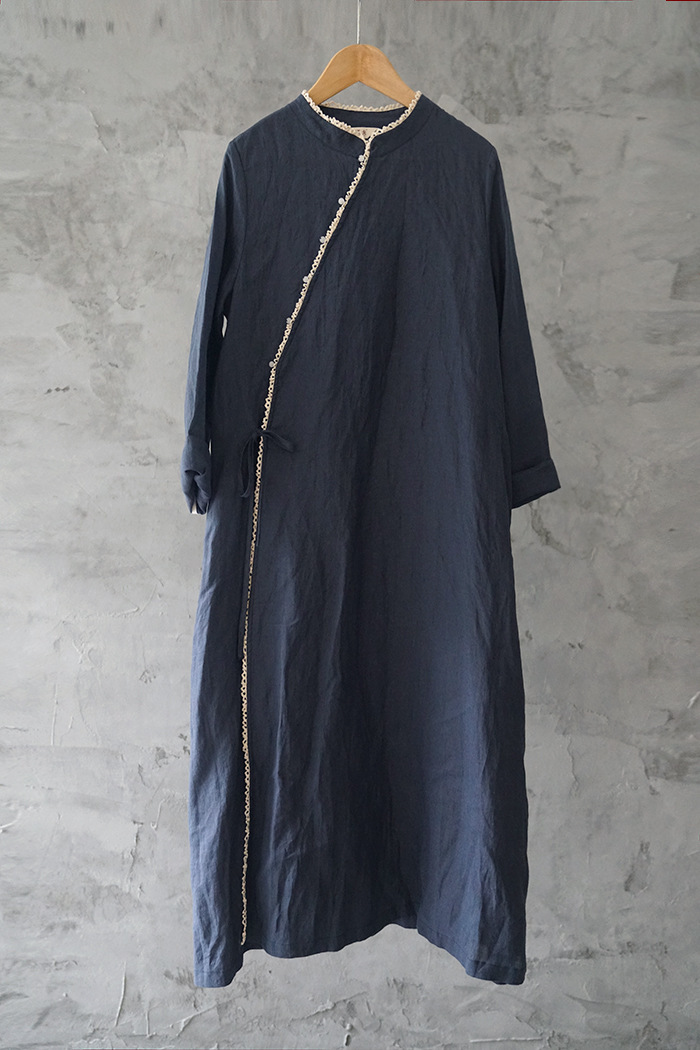 改良后的中式长袍 领口斜襟做了花边拼接