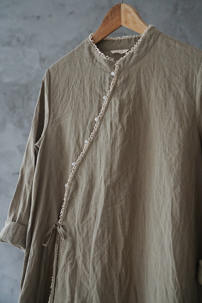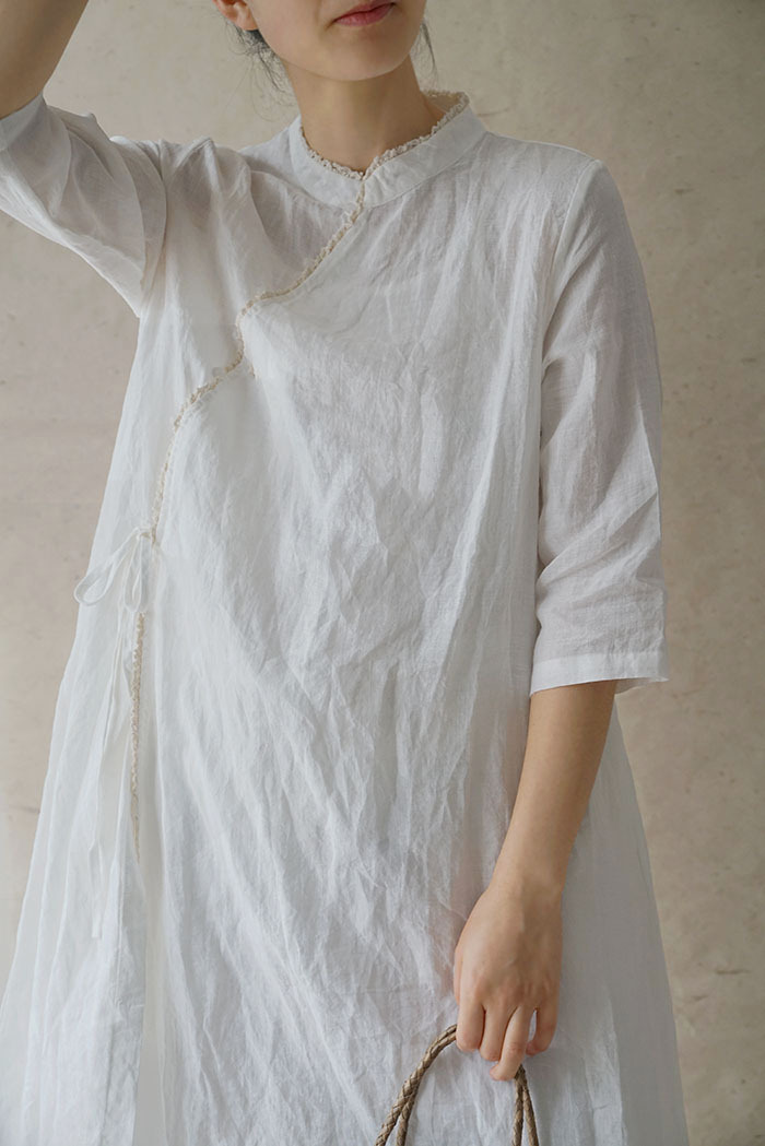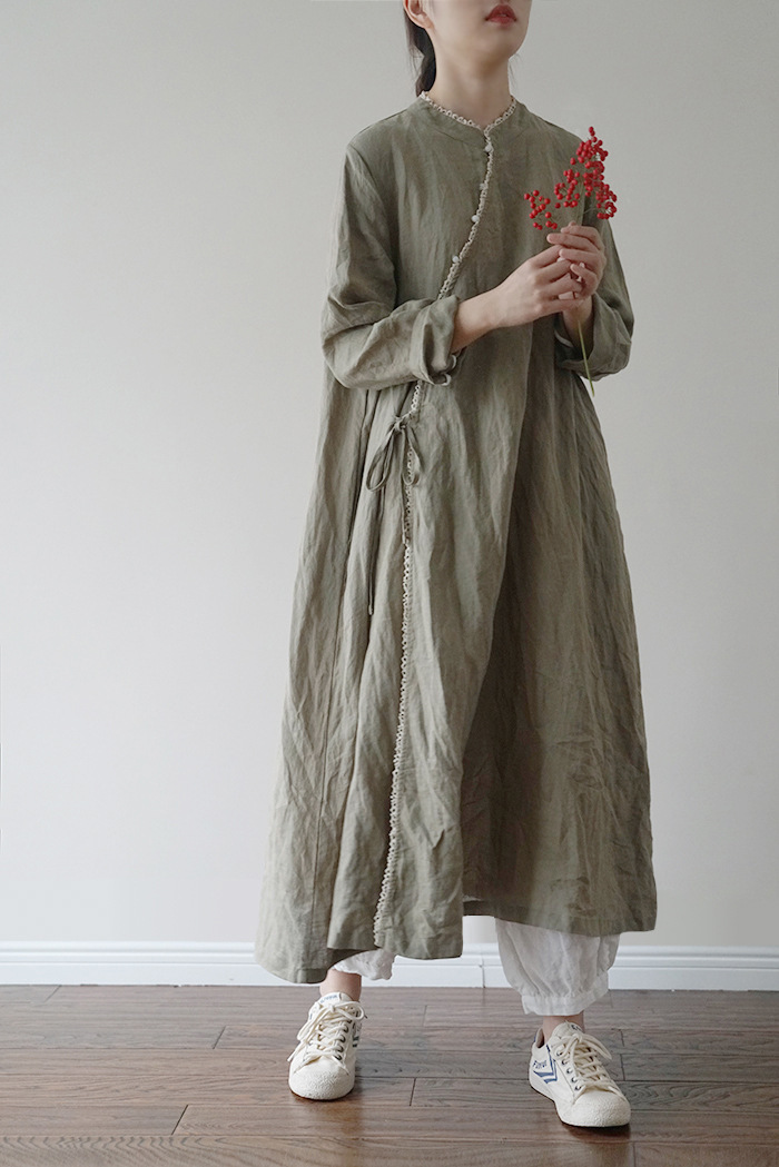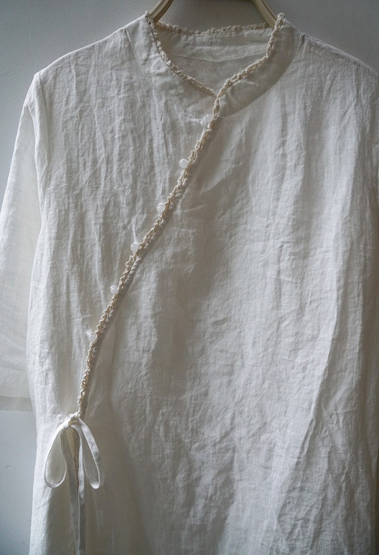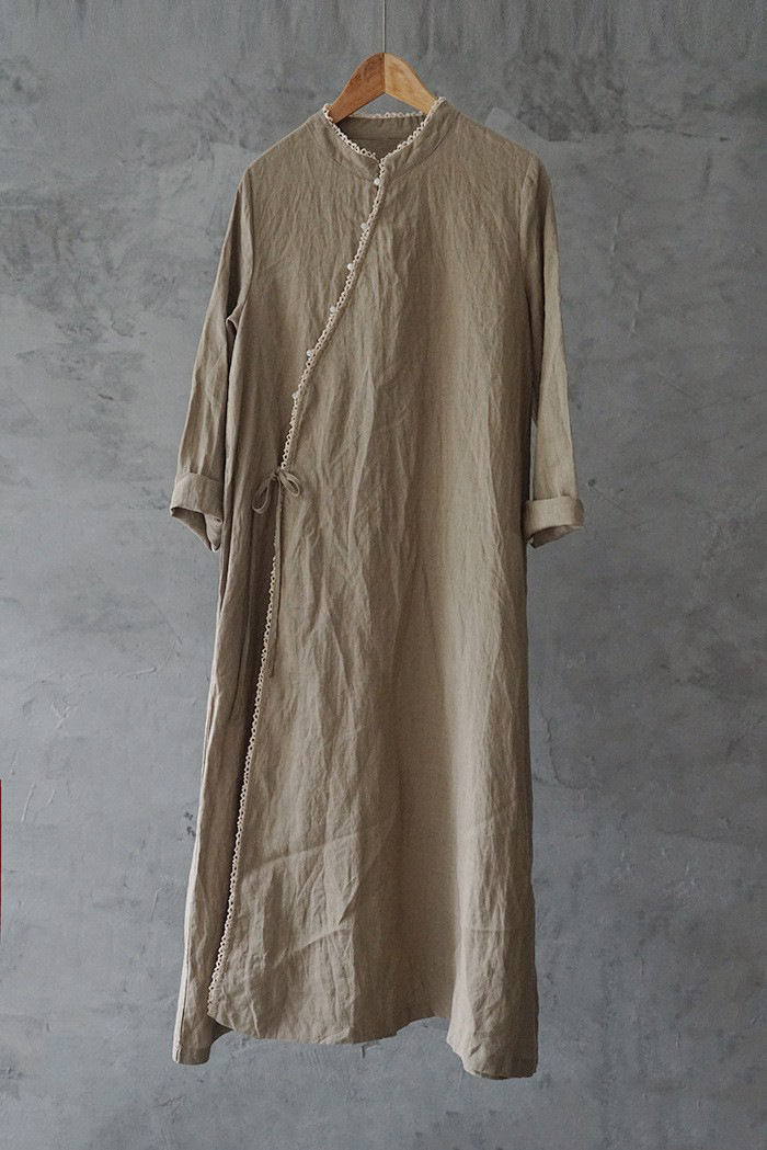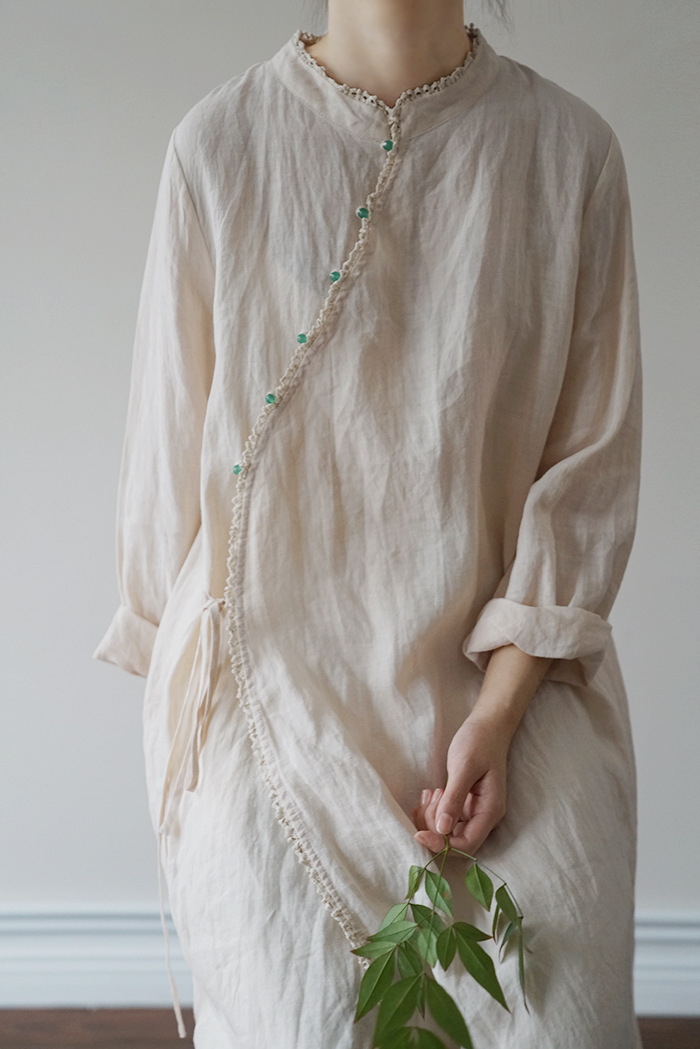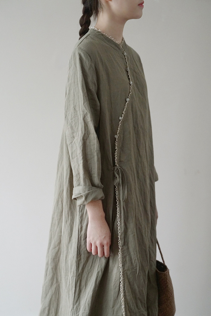 改良后的中式长袍 领口斜襟做了花边拼接
