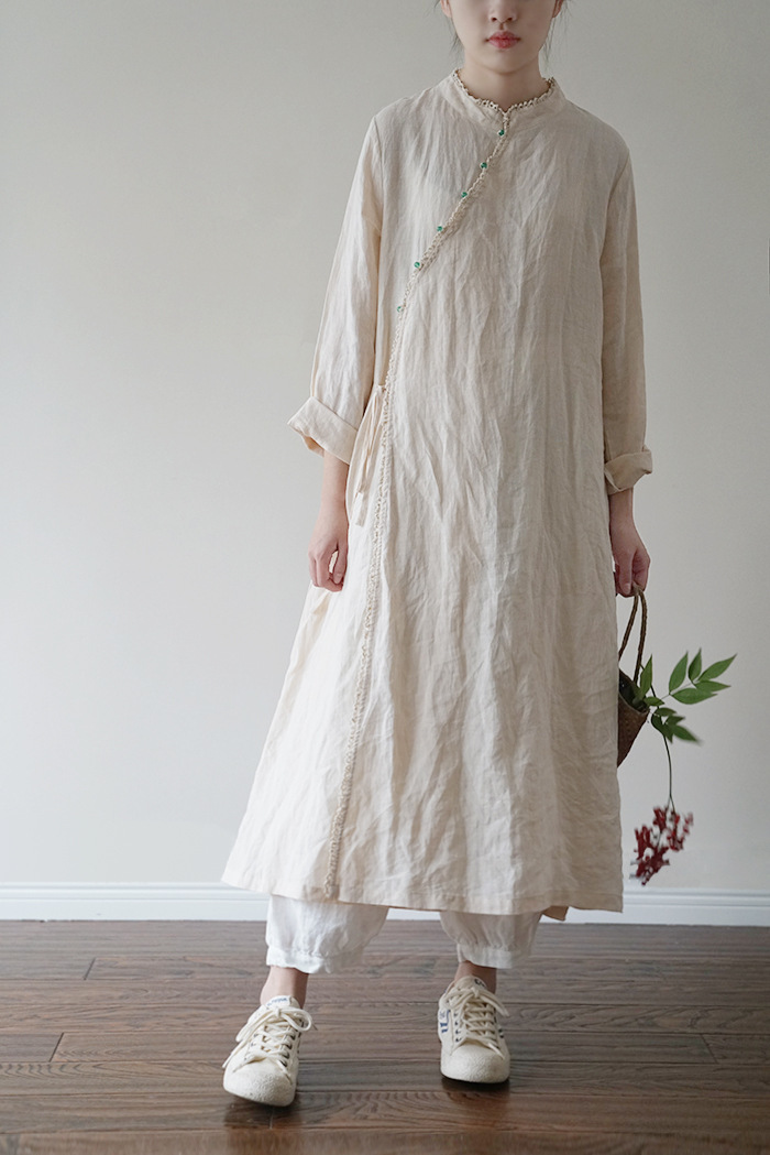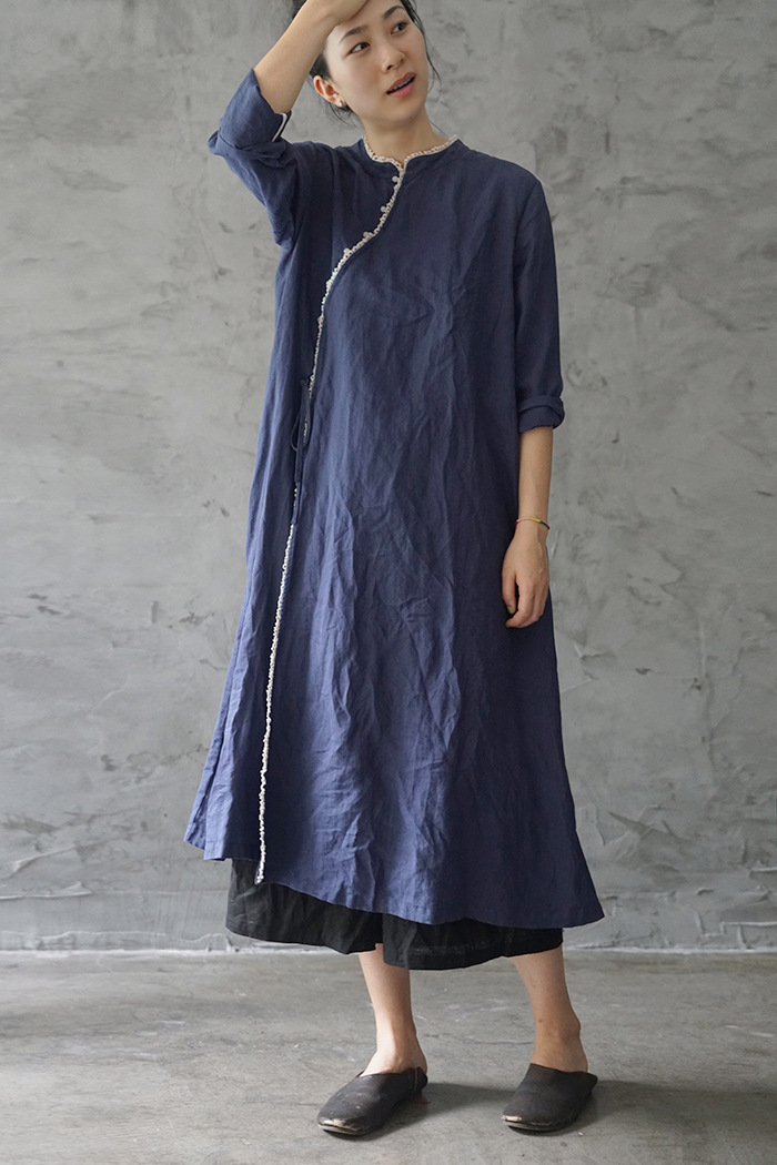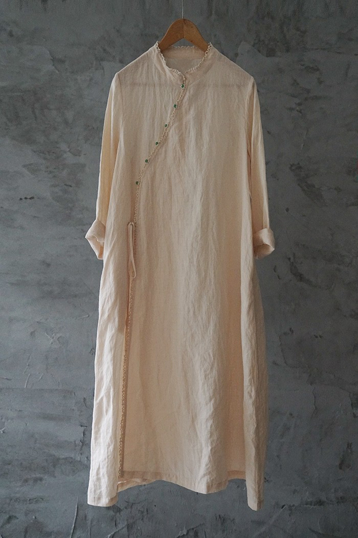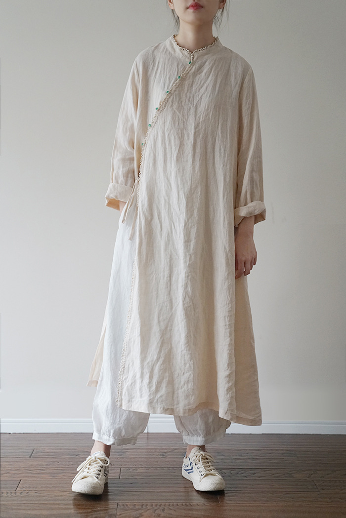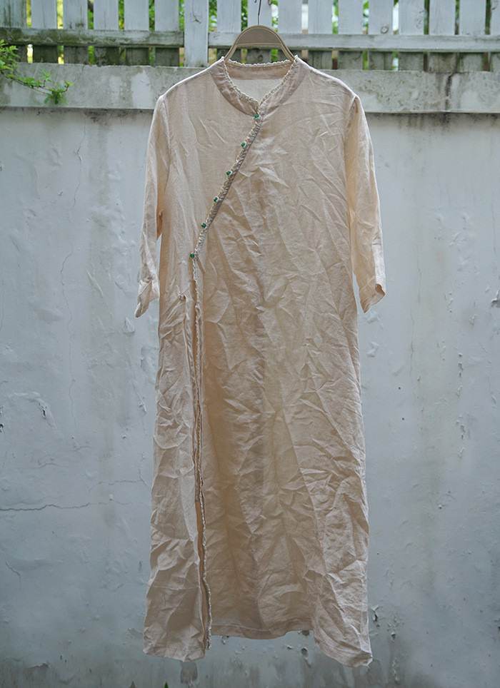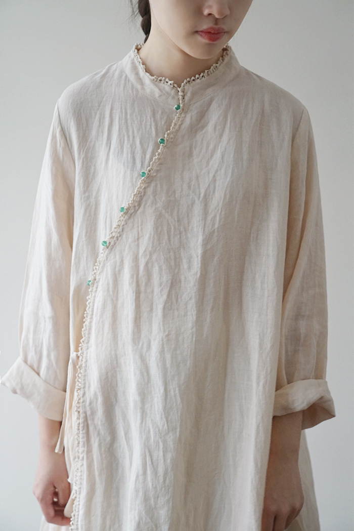 改良后的中式长袍 领口斜襟做了花边拼接