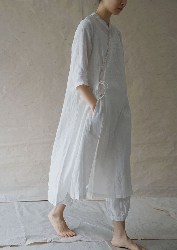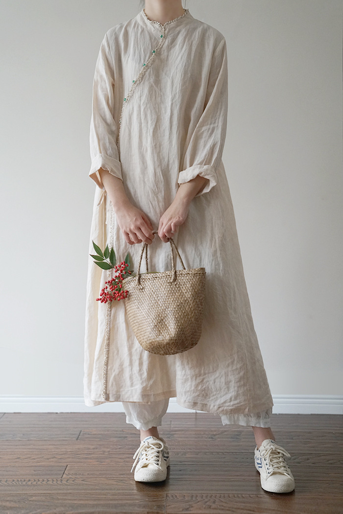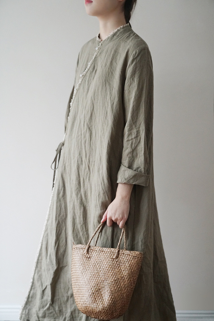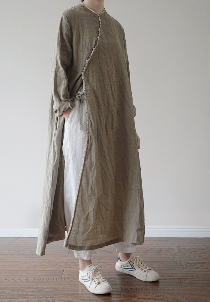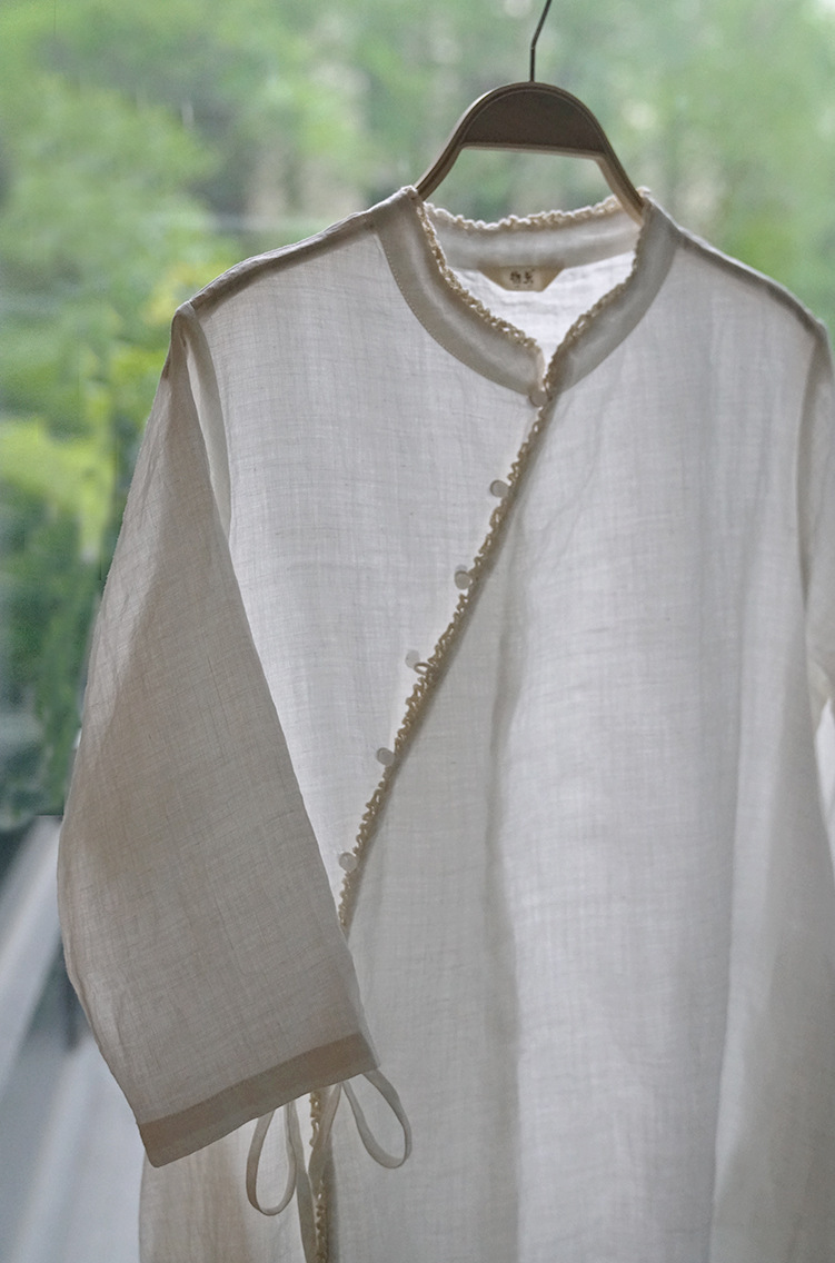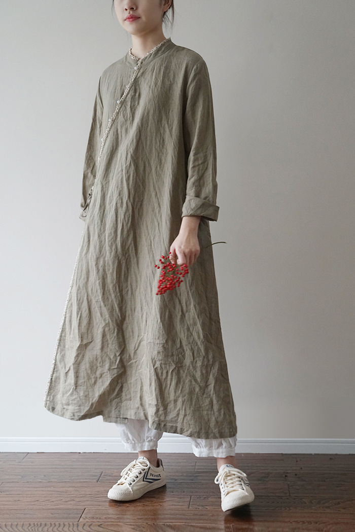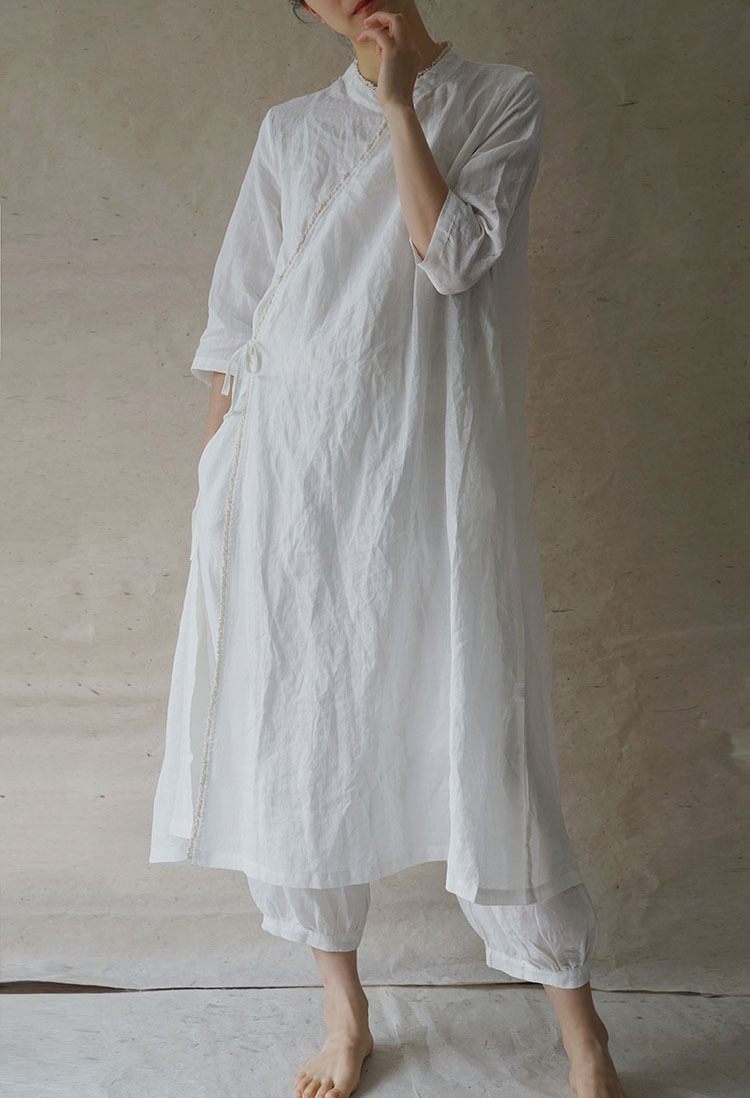 改良后的中式长袍 领口斜襟做了花边拼接