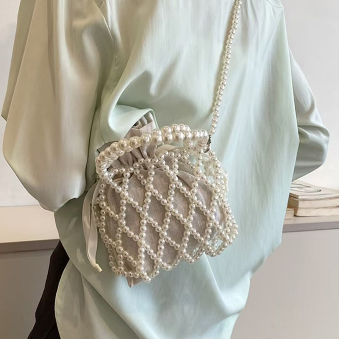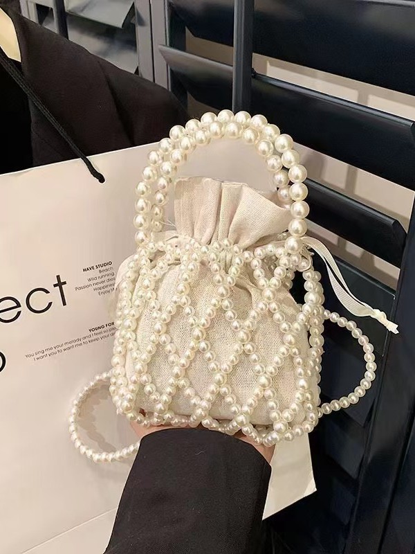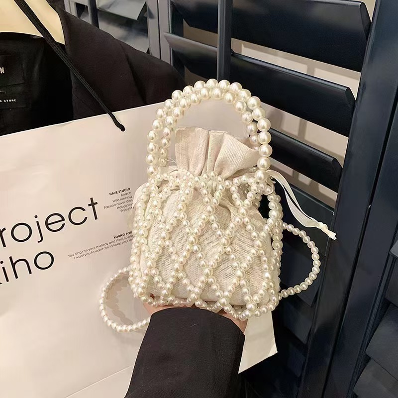 프랑스 레트로 요정 가방 짠 구슬 양동이 가방 휴대용 크로스 바디 가방 여름 Xiaozhong 디자인 중공 진주 가방스토어 가기
