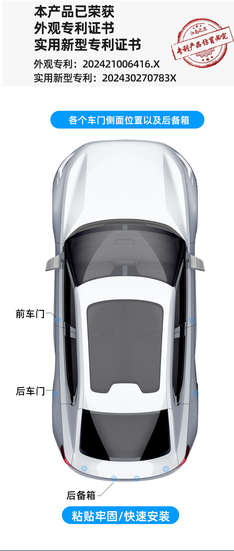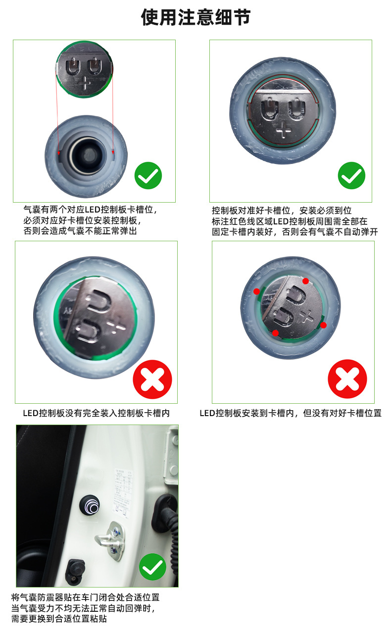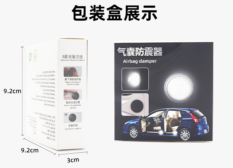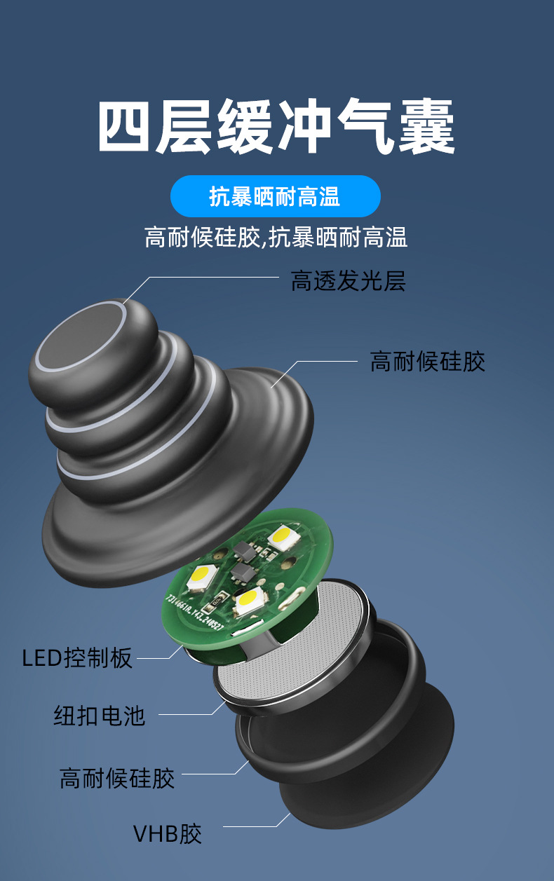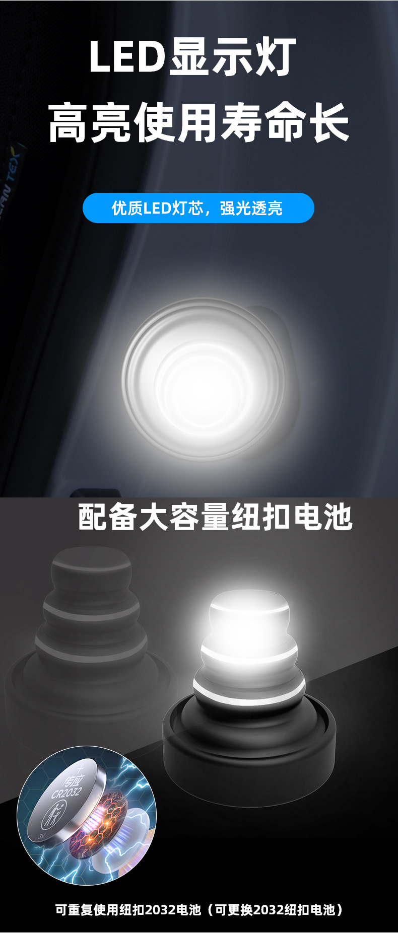 采用耐候硅硅胶材料,抗暴晒耐高温;气囊缓冲设计,减震升级、可有效静音;配置LED高亮灯-灯光警示效果,提供夜间可视性;粘贴牢固,久用不掉,简易安装,适用于各个车门侧面以及后备箱等位置。