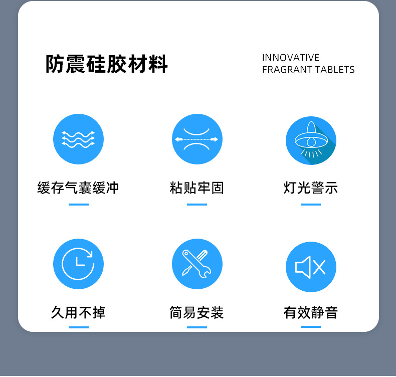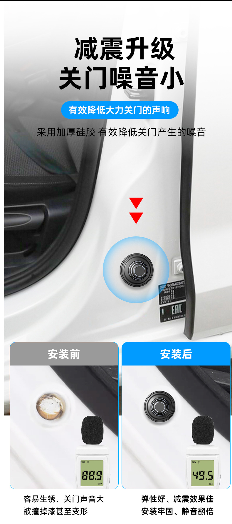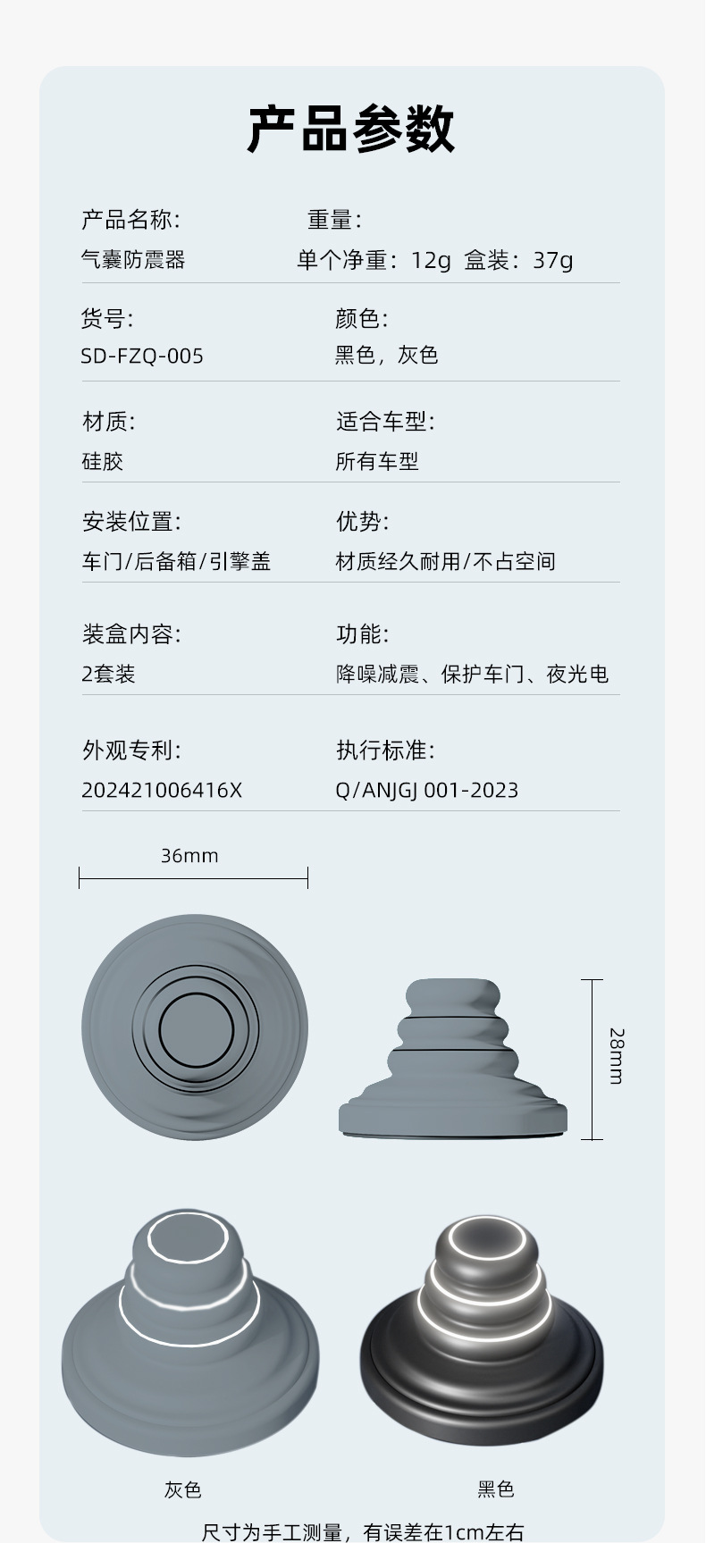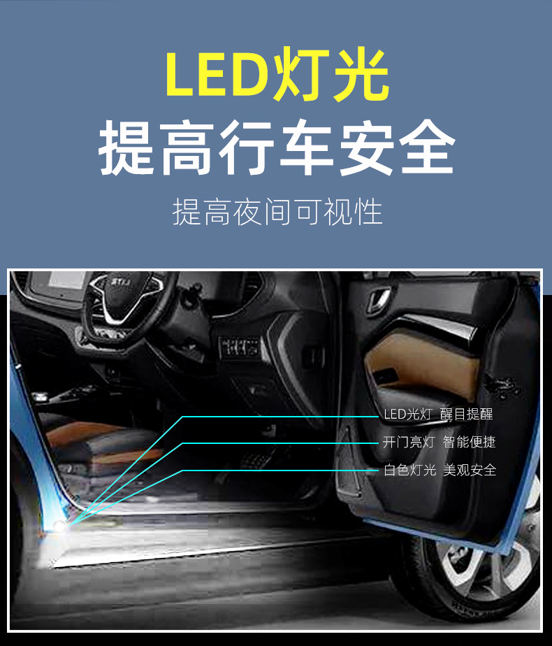 采用耐候硅硅胶材料,抗暴晒耐高温;气囊缓冲设计,减震升级、可有效静音;配置LED高亮灯-灯光警示效果,提供夜间可视性;粘贴牢固,久用不掉,简易安装,适用于各个车门侧面以及后备箱等位置。